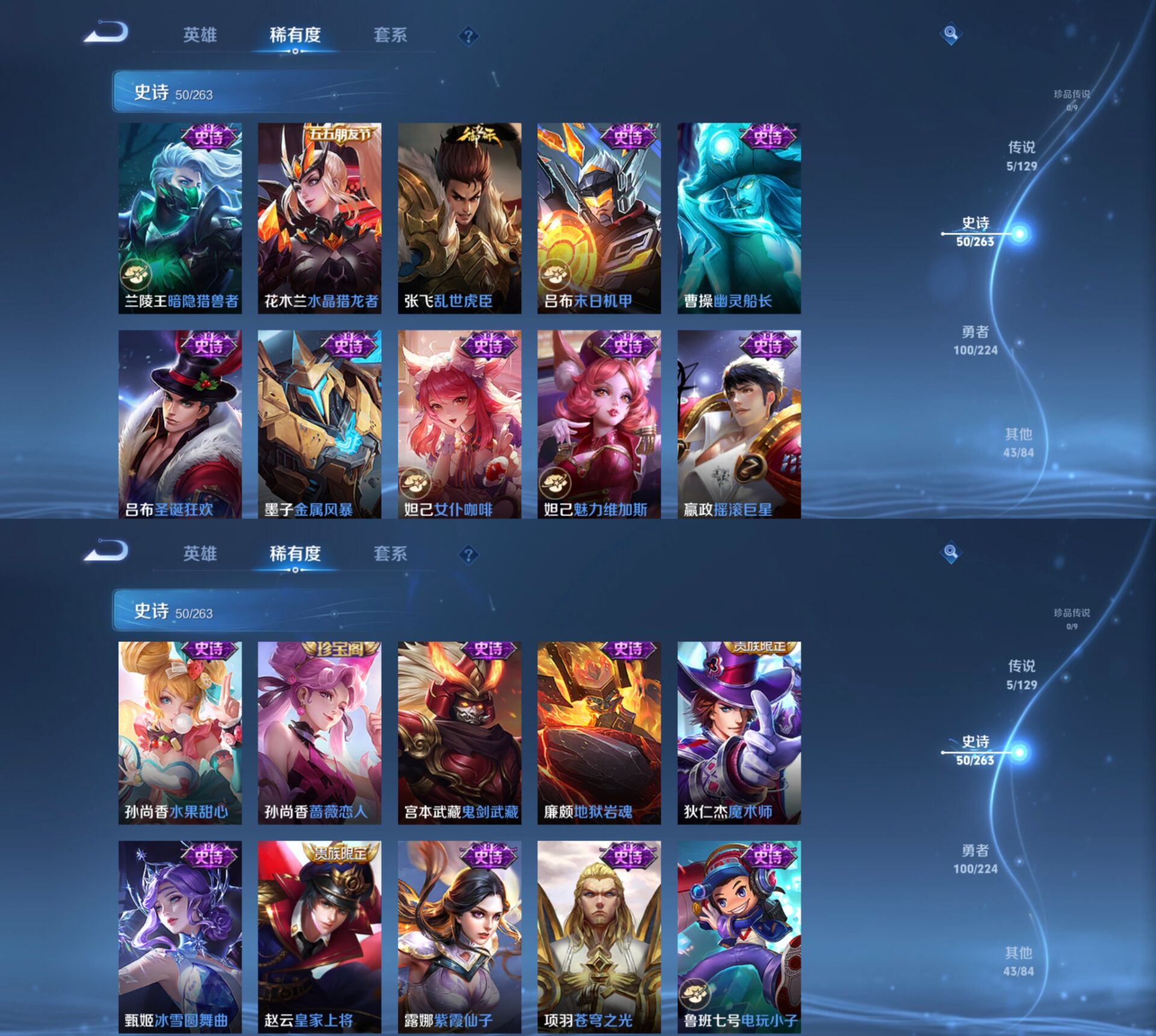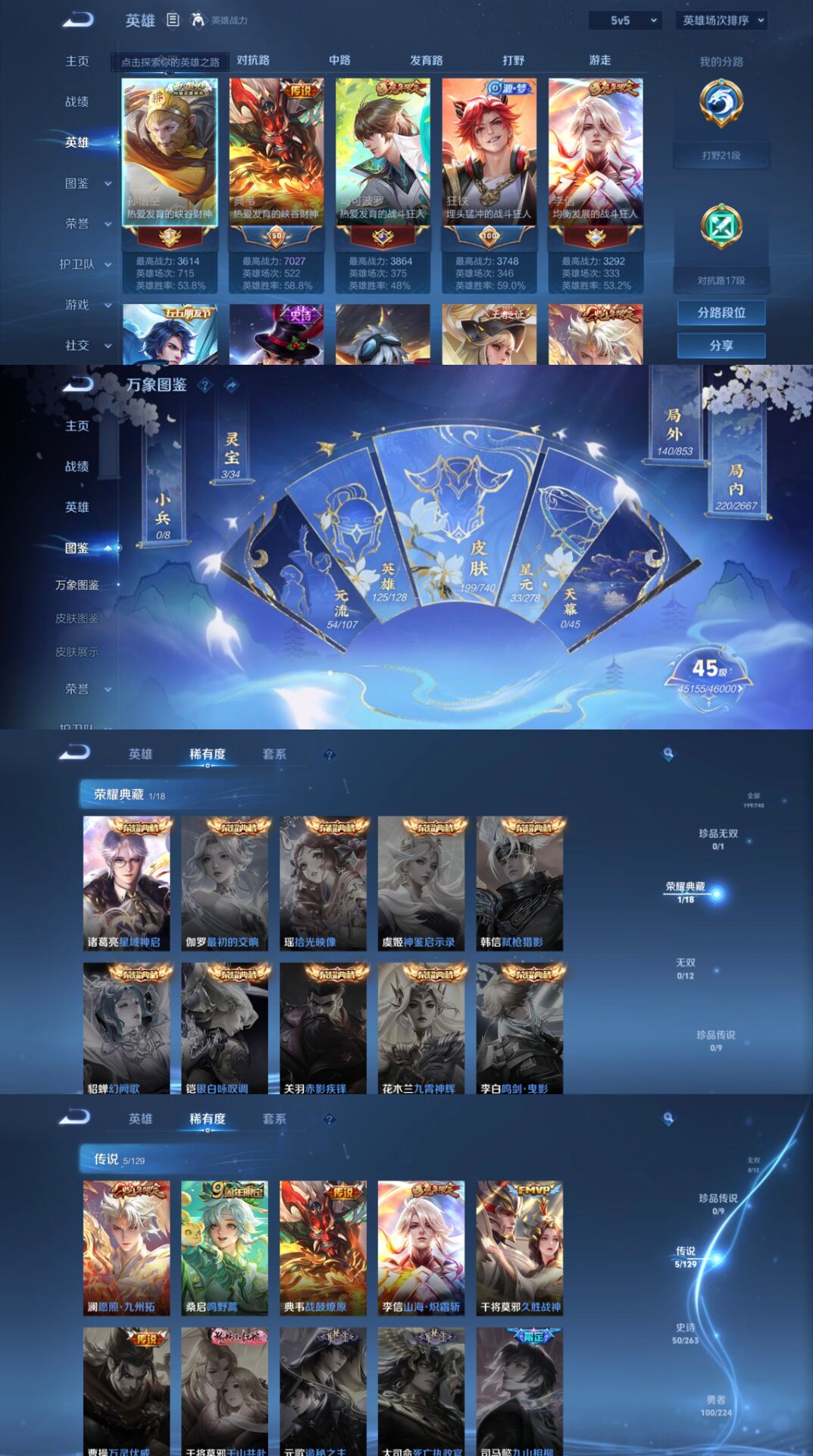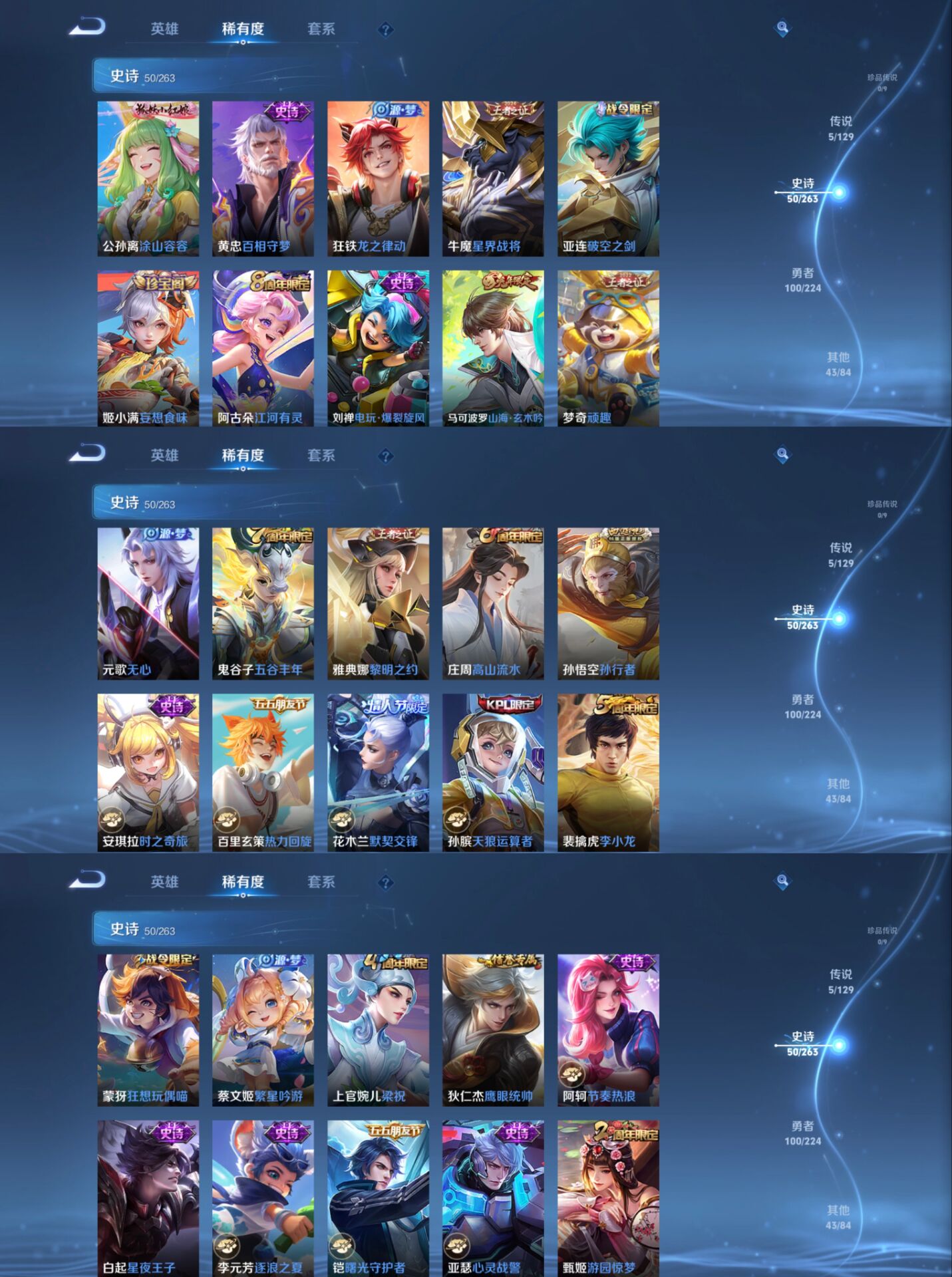 贵族等级:v6皮肤数:200传说品质5 生肖限定3 荣耀典藏1 情人节限定1 英雄数:125
