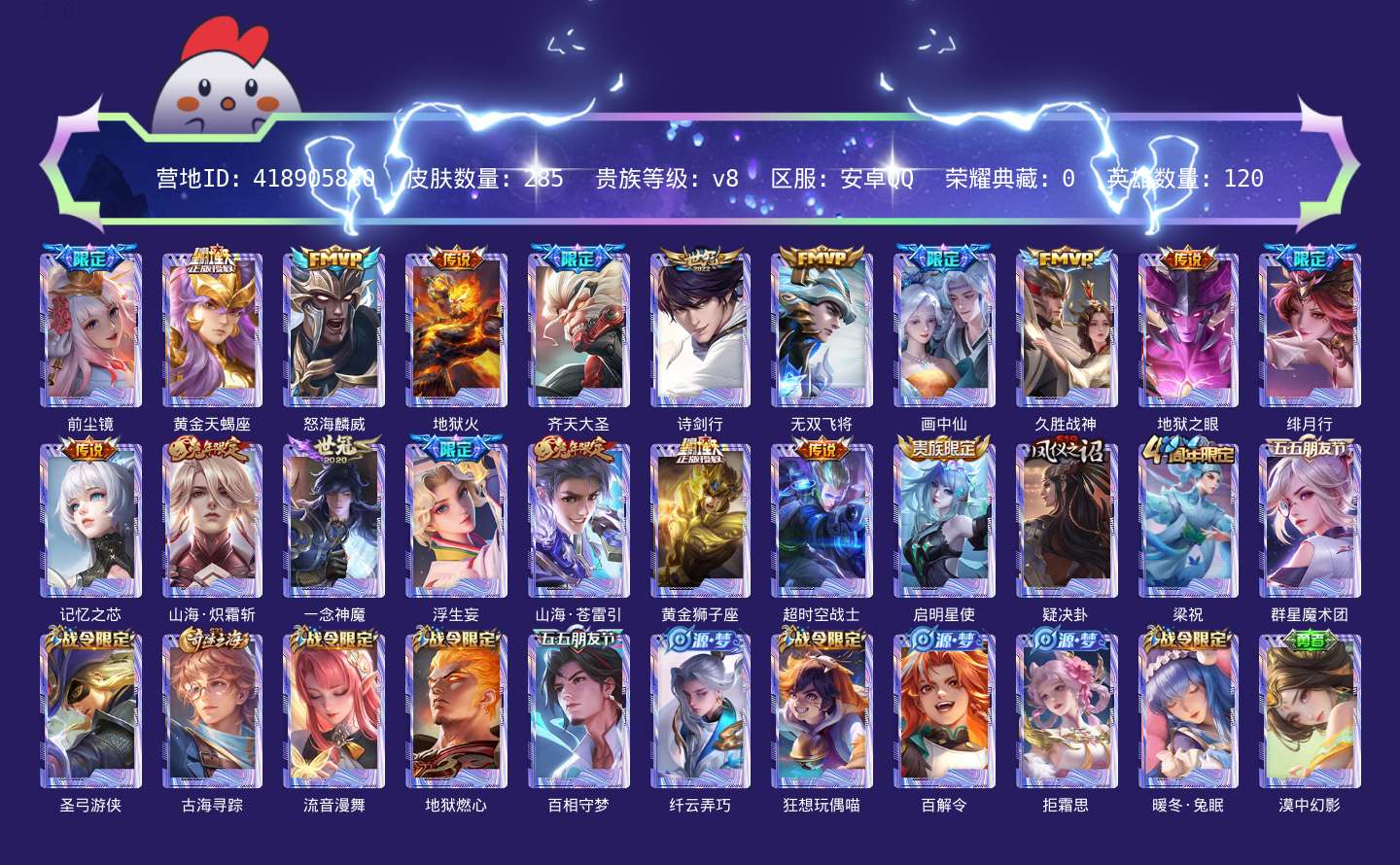 贵族等级:v8皮肤数:285传说品质19 生肖限定6 情人节限定1 英雄数:120