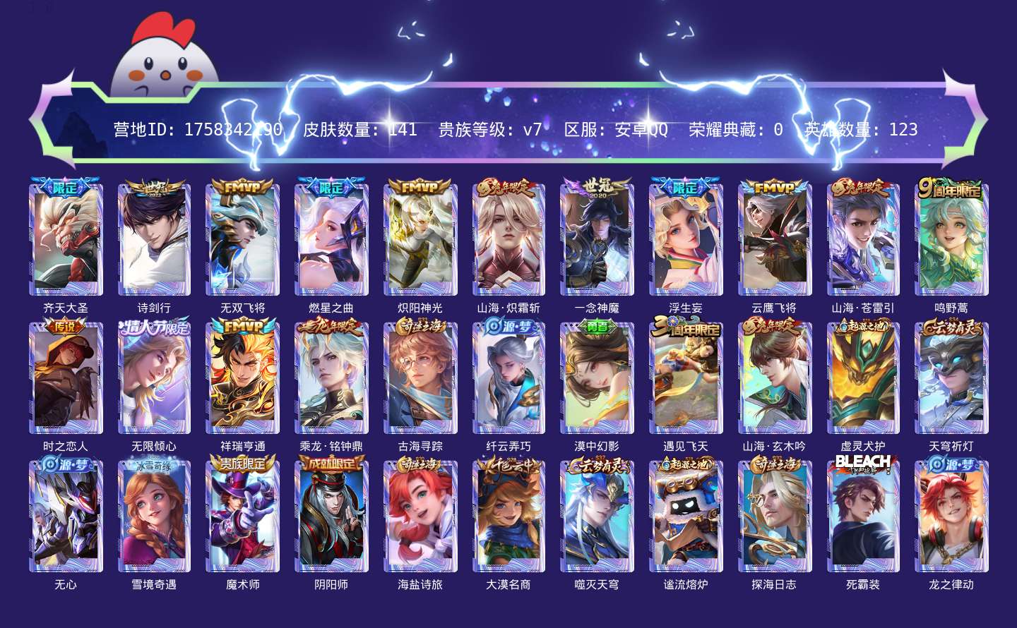 贵族等级:v7皮肤数:141生肖限定5 传说品质15 情人节限定1 英雄数:123