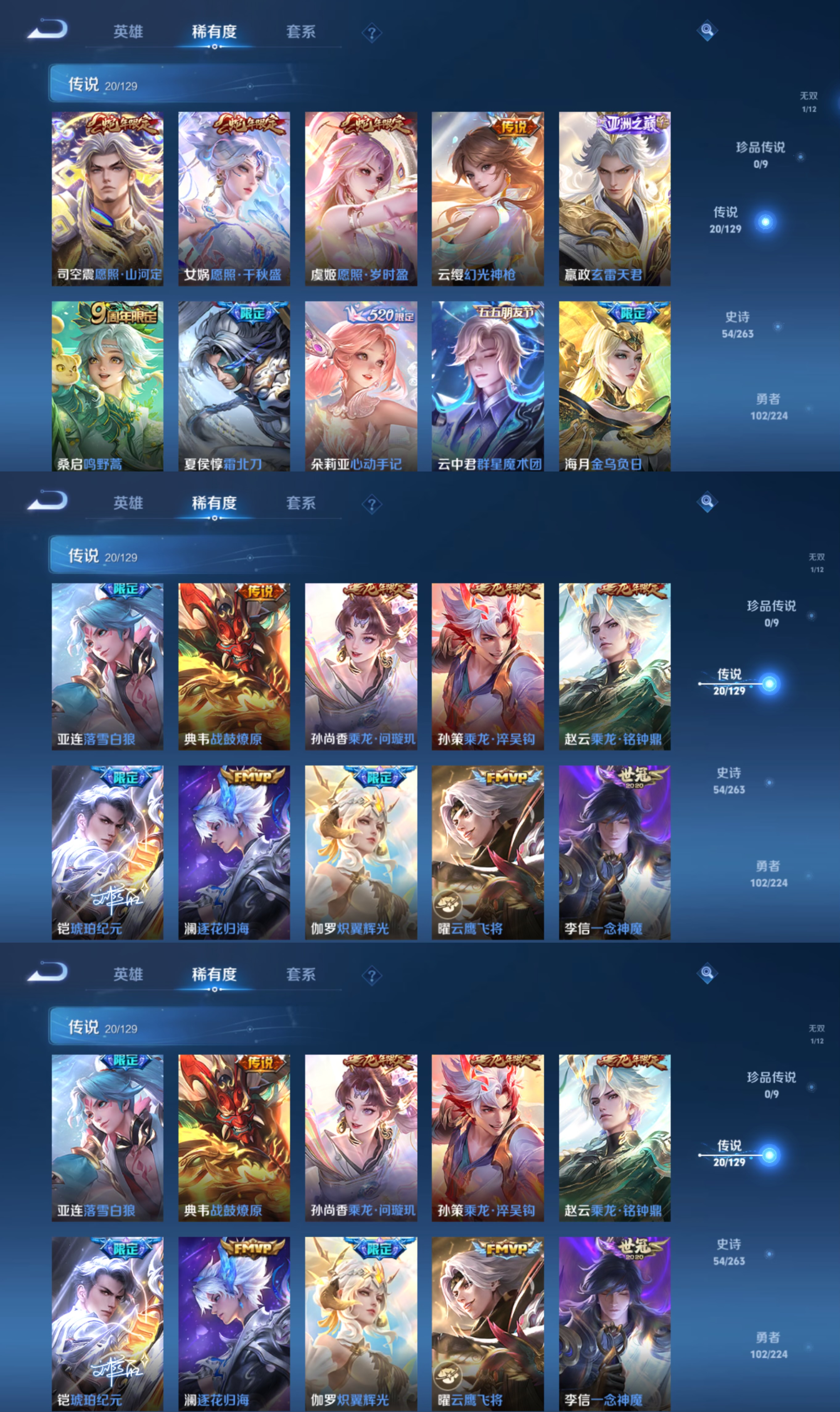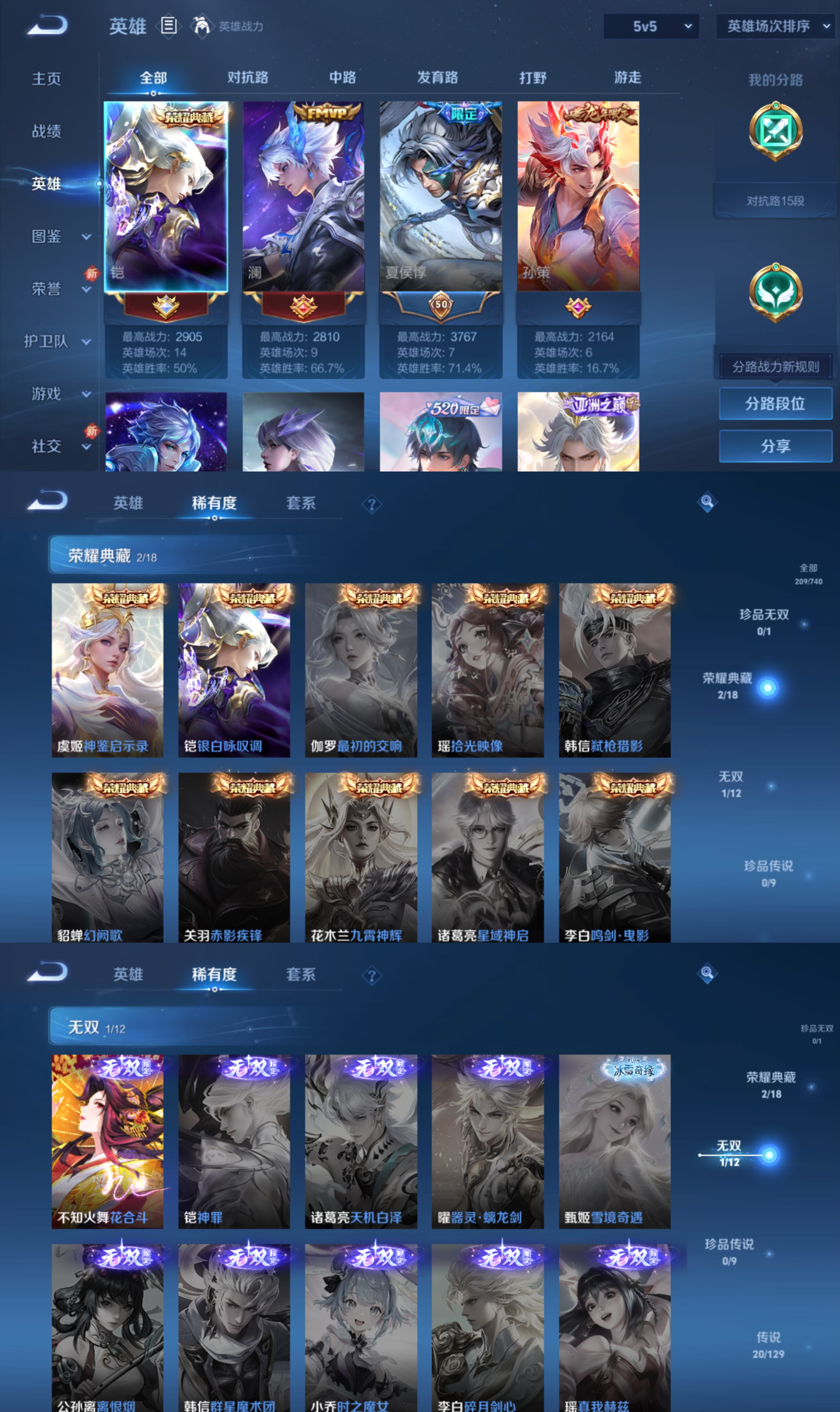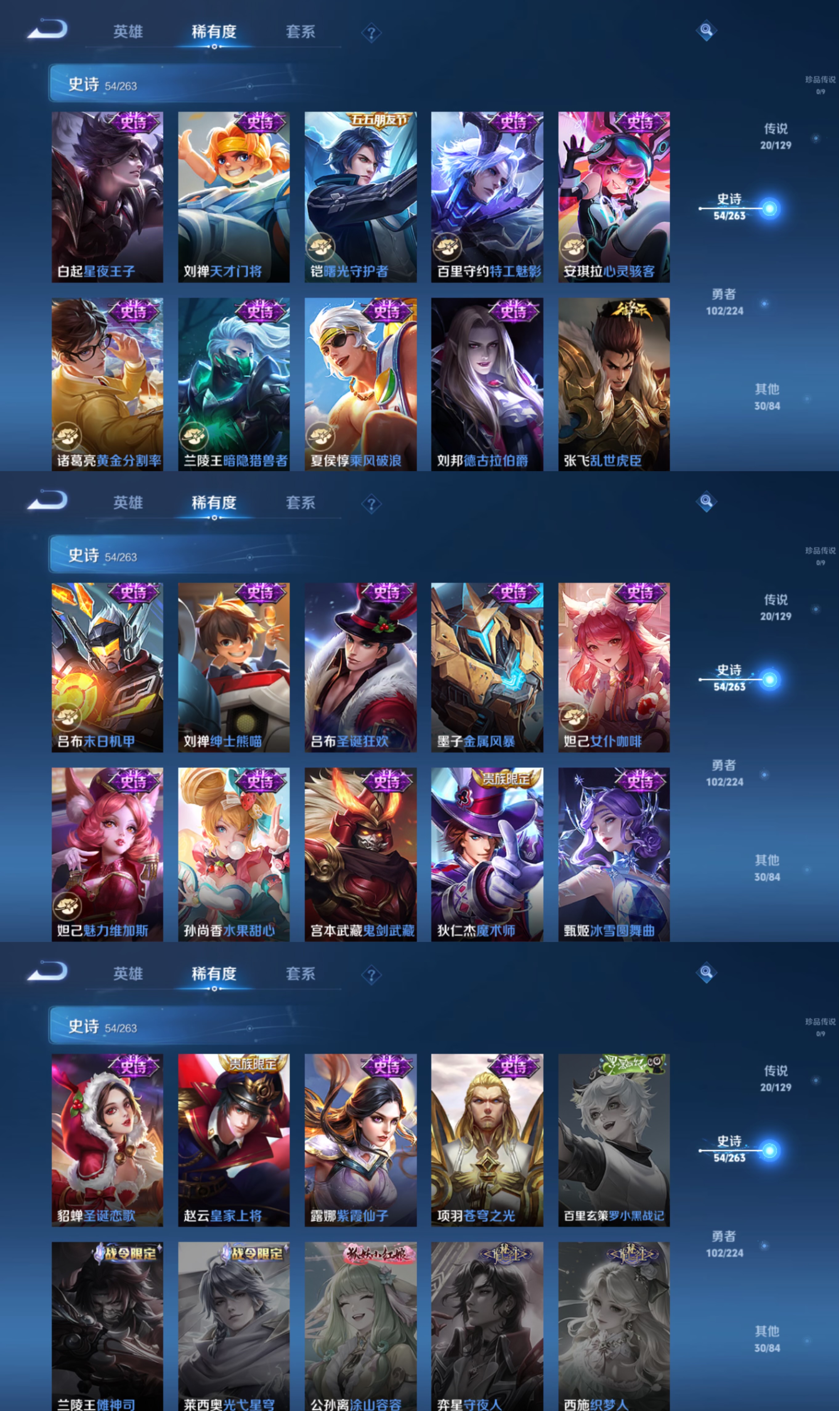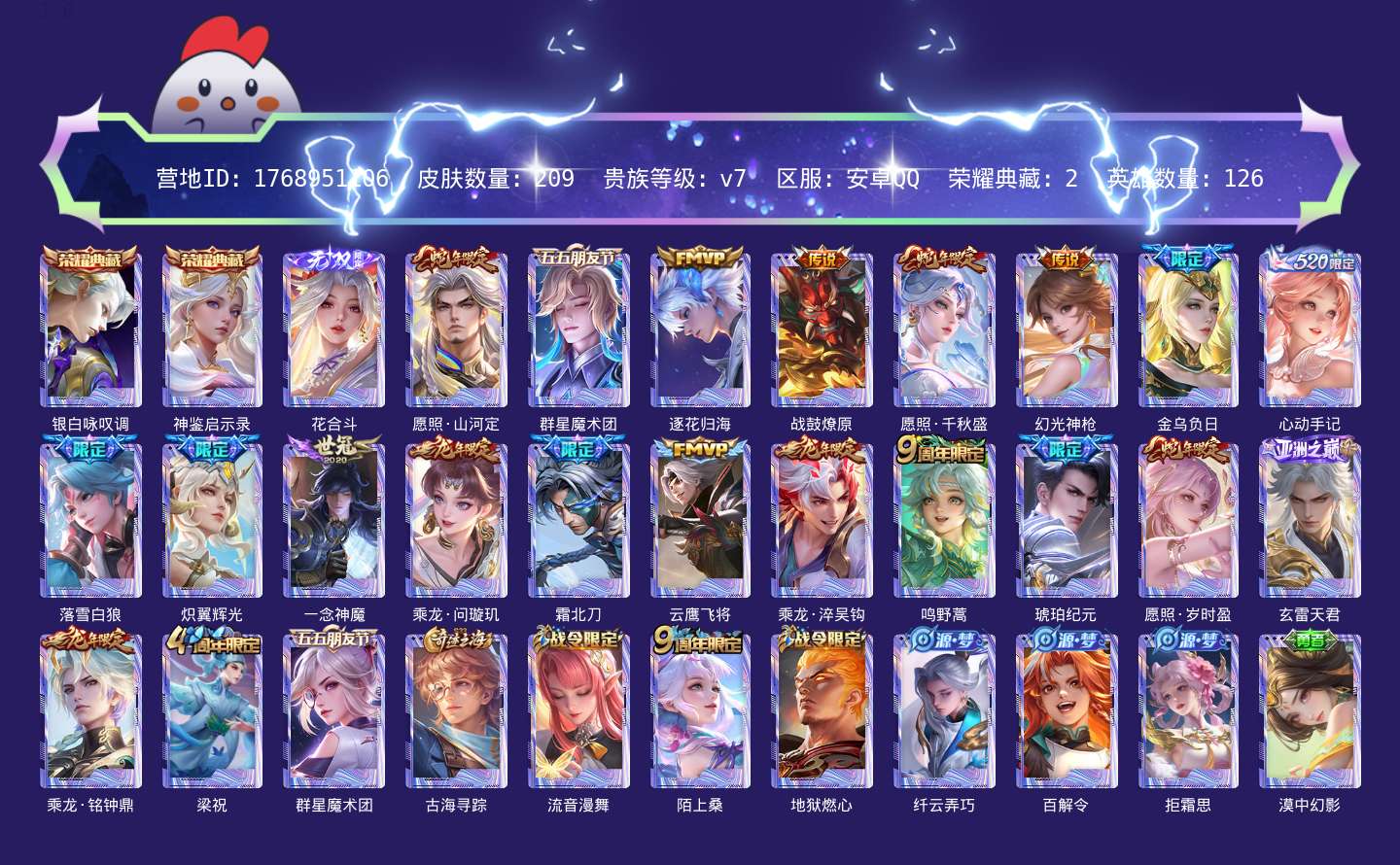 贵族等级:v7皮肤数:209传说品质20 生肖限定7 无双1 荣耀典藏2 英雄数:126