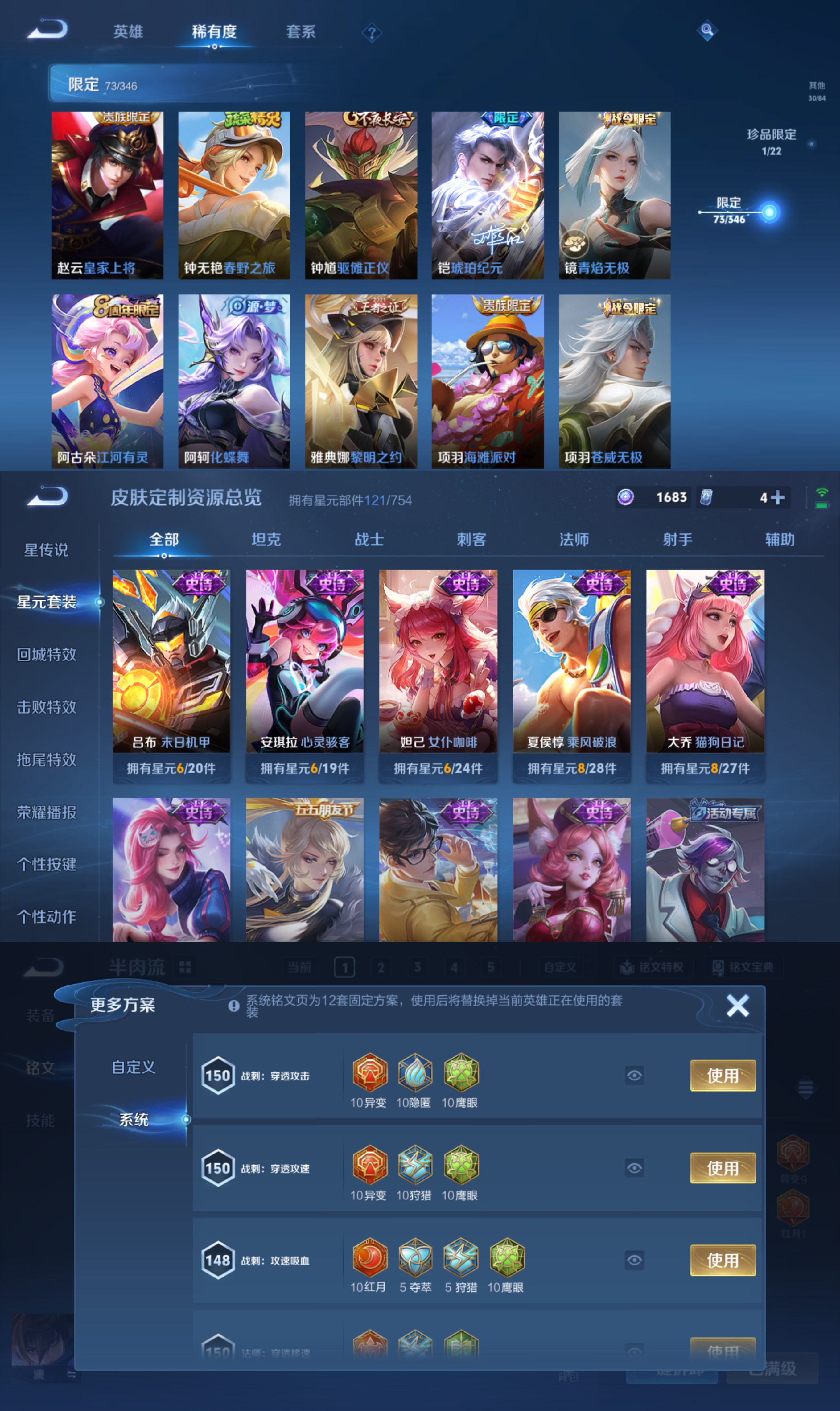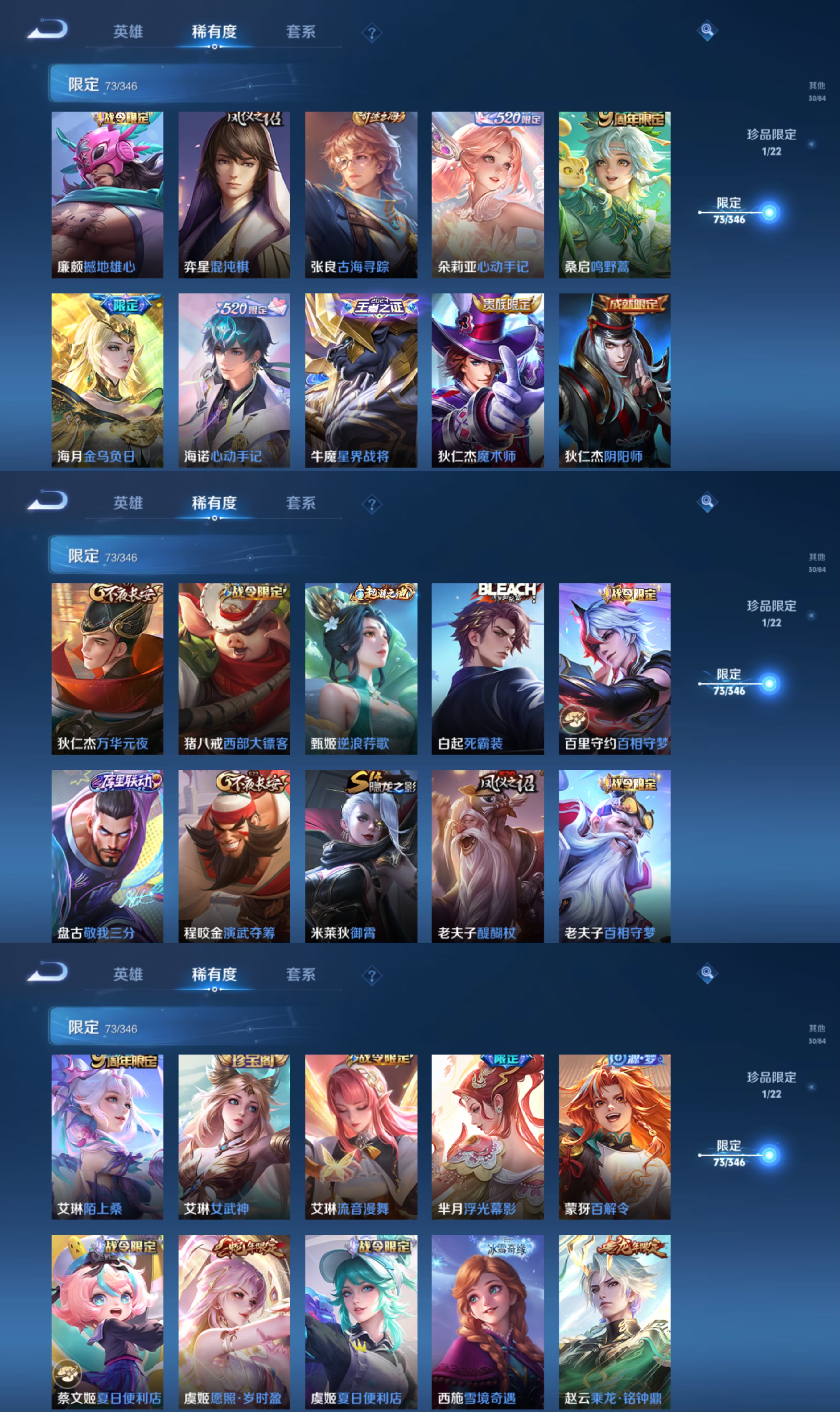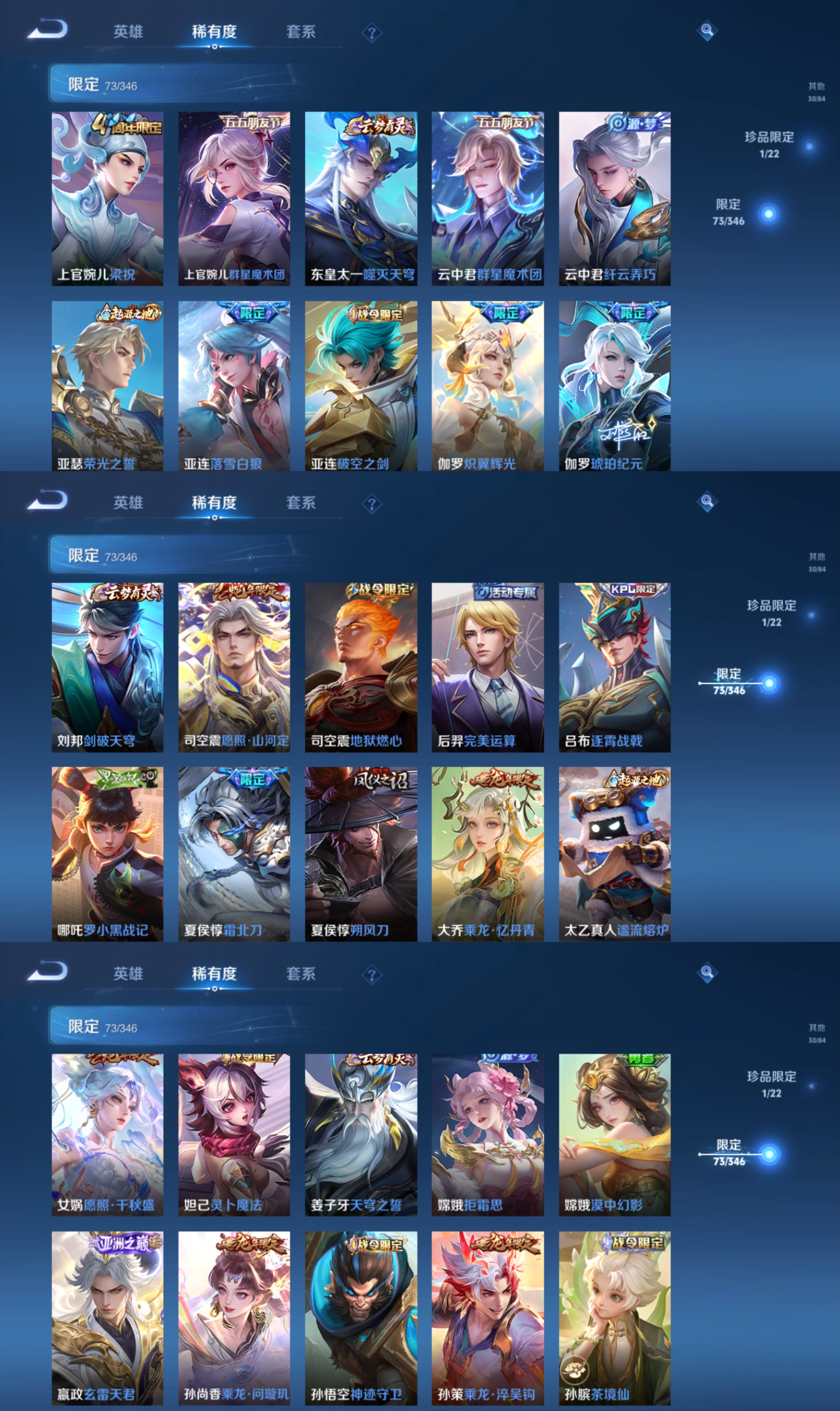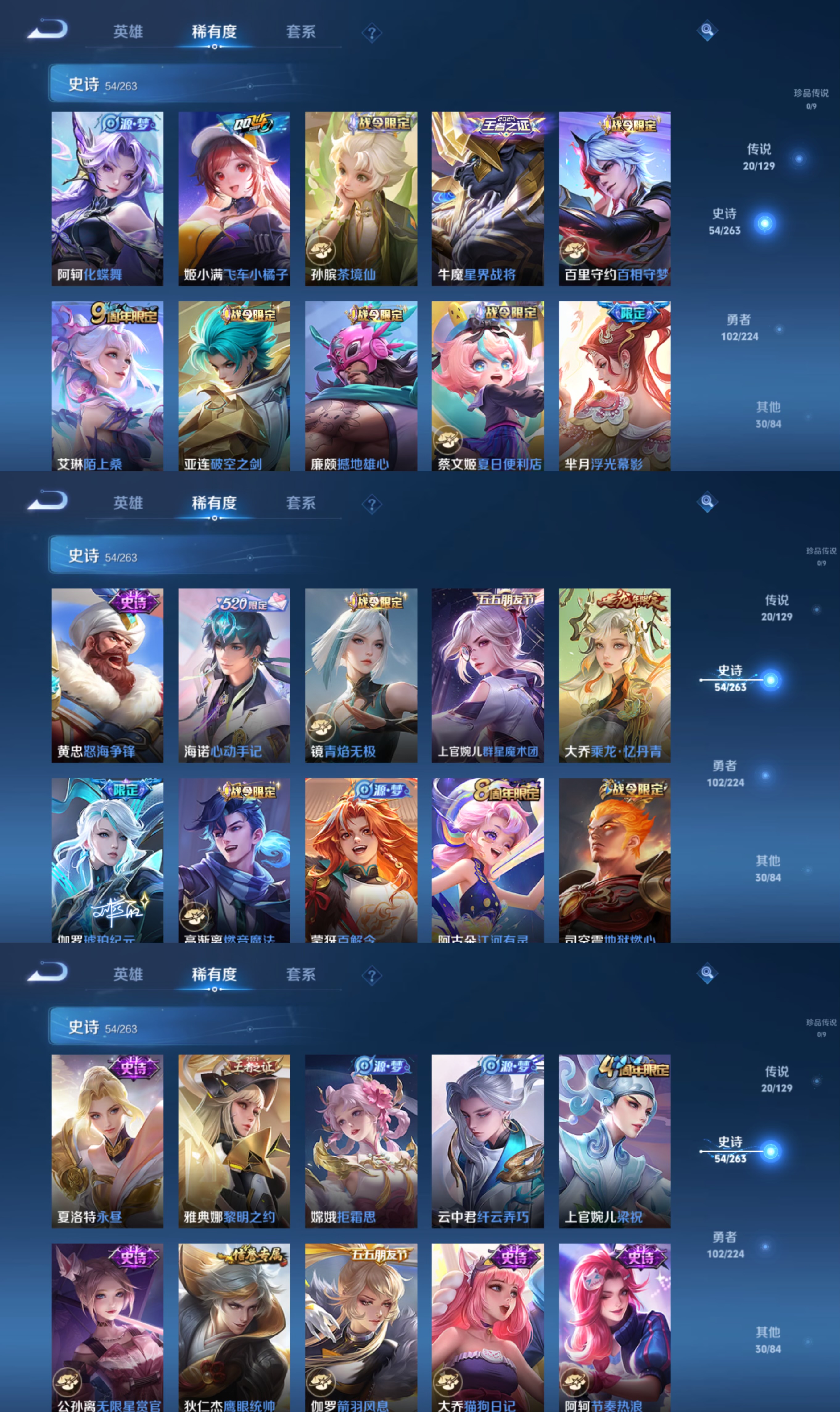 贵族等级:v7皮肤数:209传说品质20 生肖限定7 无双1 荣耀典藏2 英雄数:126