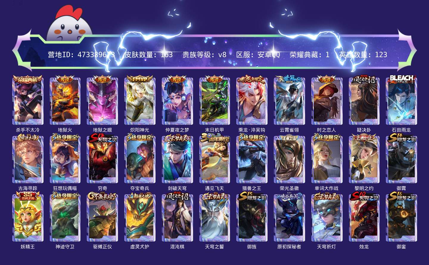 贵族等级:v8皮肤数:163传说品质8 荣耀典藏1 生肖限定1 英雄数:123