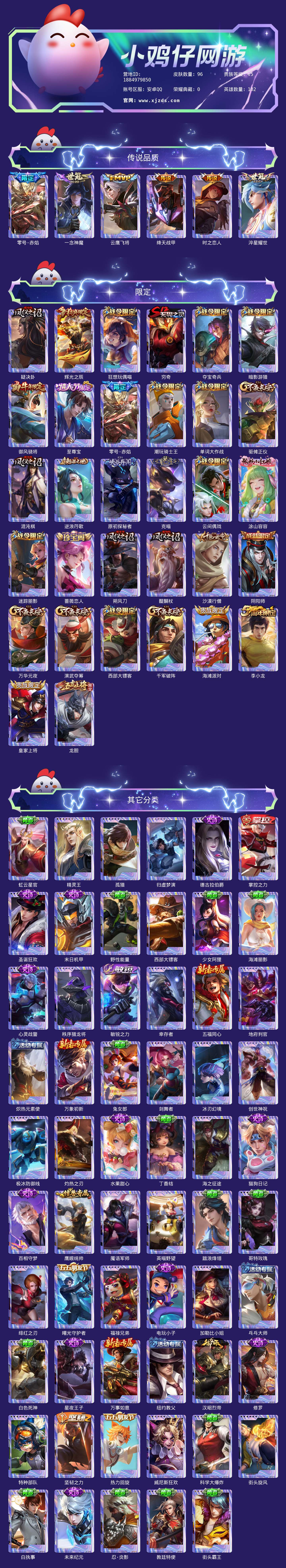 贵族等级:v5皮肤数:96生肖限定2 情人节限定1 传说品质6 英雄数:102