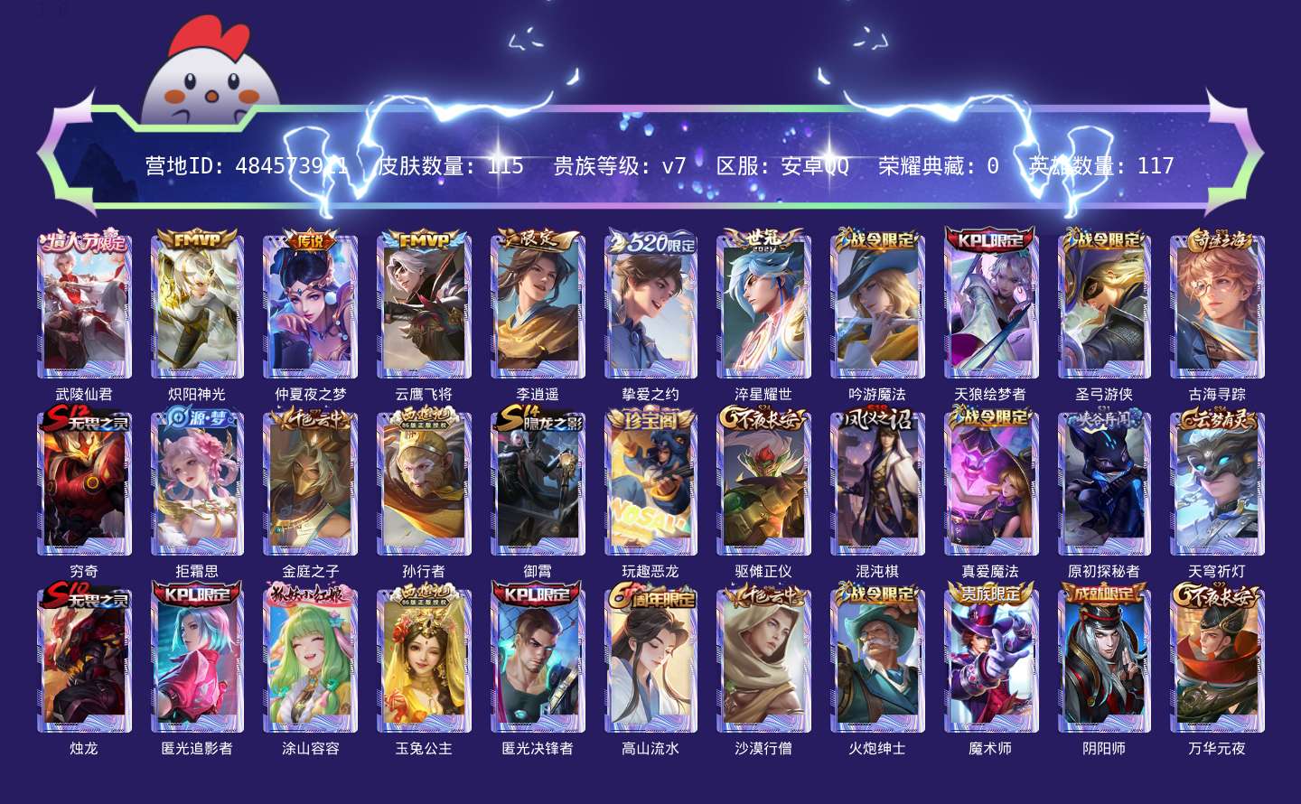 贵族等级:v7皮肤数:115传说品质7 情人节限定1 英雄数:117