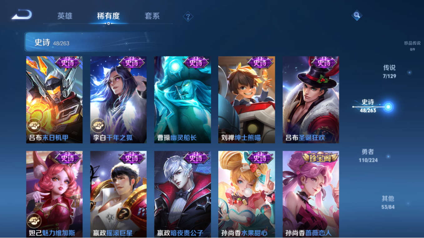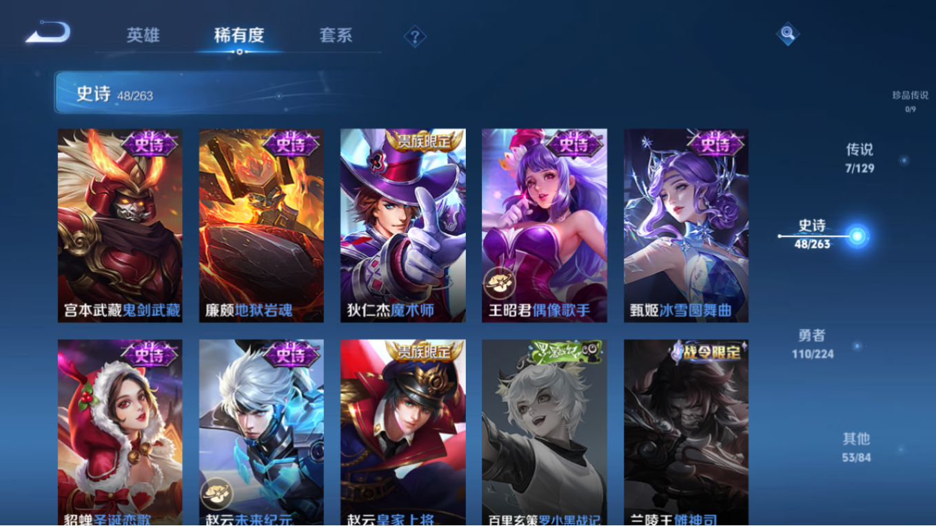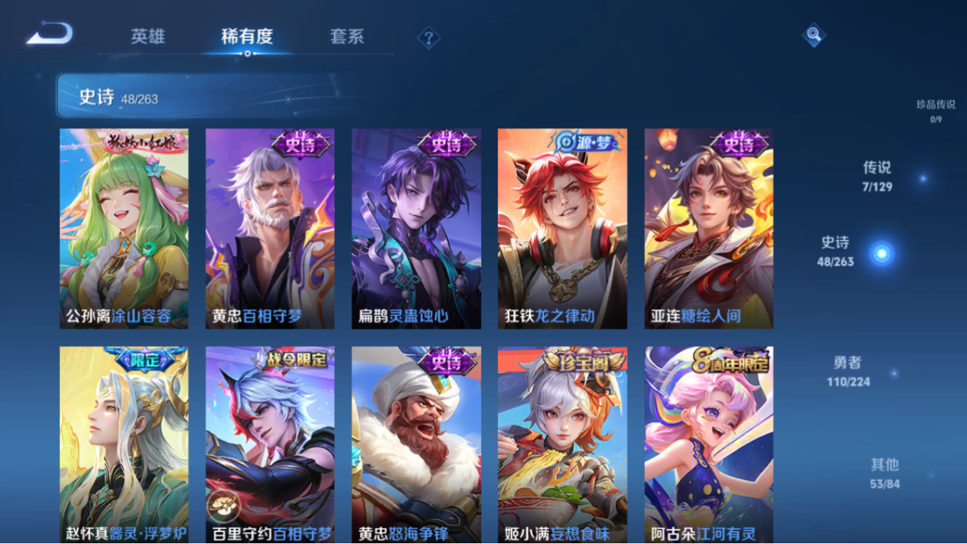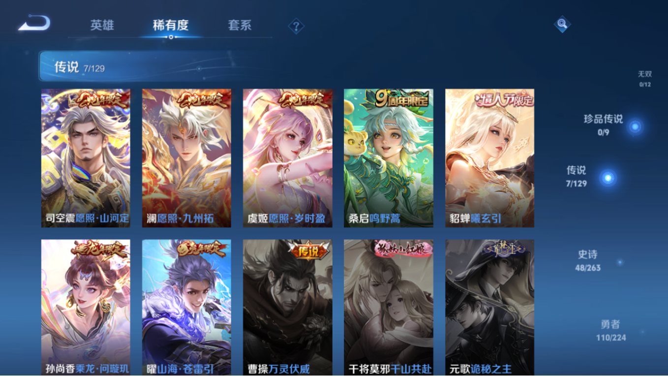 贵族等级:v7皮肤数:219传说品质7 生肖限定7 荣耀典藏1 情人节限定1 英雄数:126