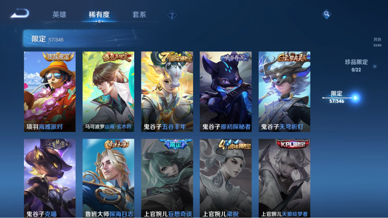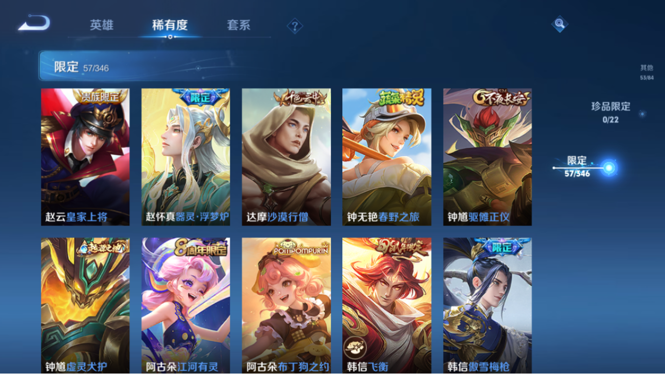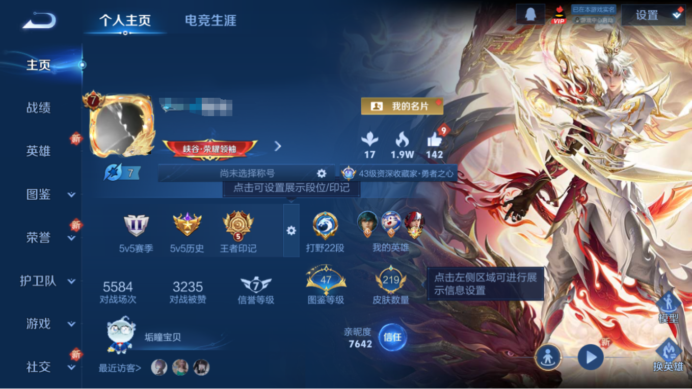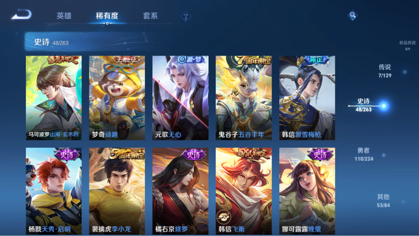贵族等级:v7皮肤数:219传说品质7 生肖限定7 荣耀典藏1 情人节限定1 英雄数:126