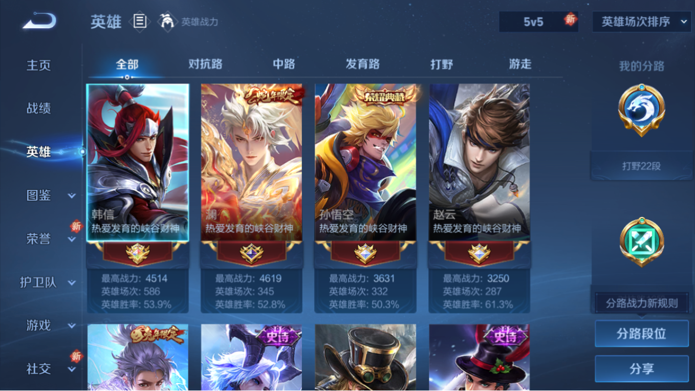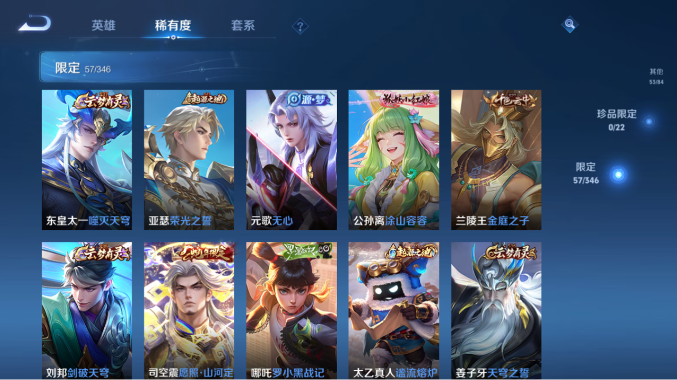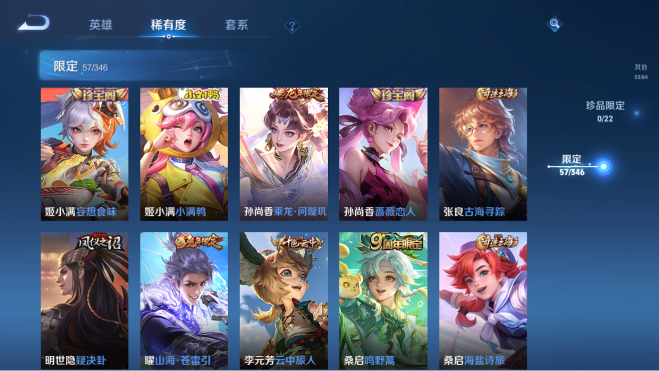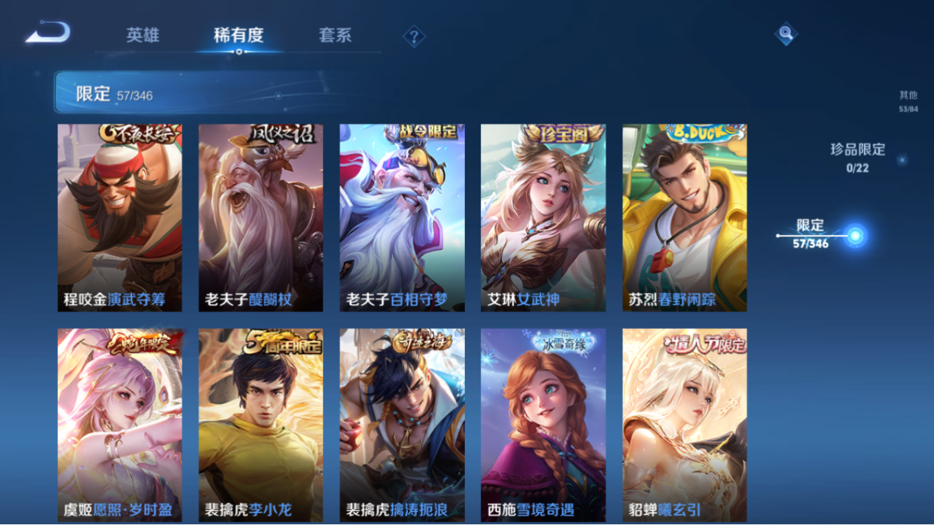 贵族等级:v7皮肤数:219传说品质7 生肖限定7 荣耀典藏1 情人节限定1 英雄数:126