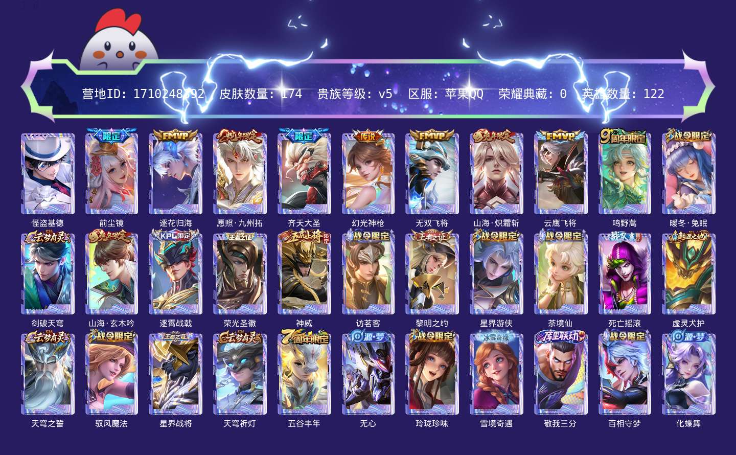 贵族等级:v5皮肤数:174传说品质9 生肖限定3 珍品传说1 英雄数:122