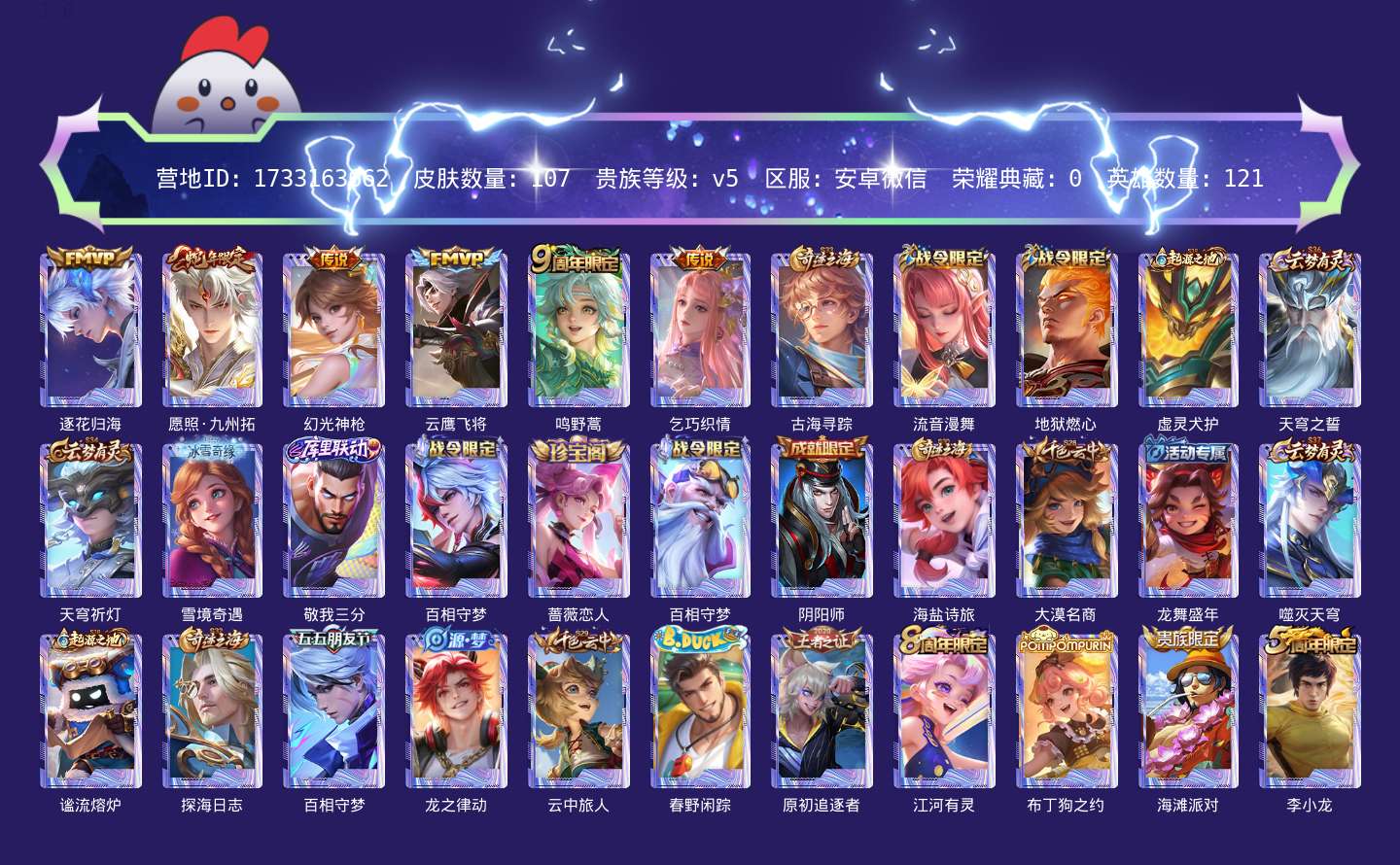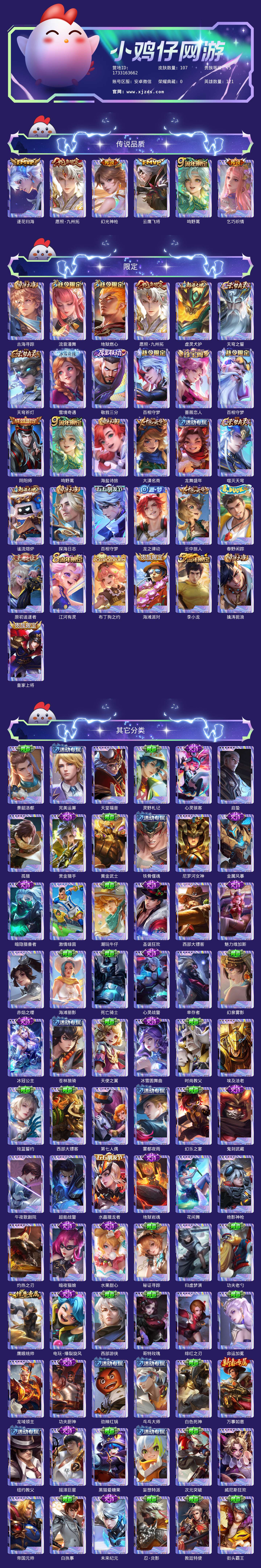贵族等级:v5皮肤数:107传说品质6 生肖限定1 英雄数:121