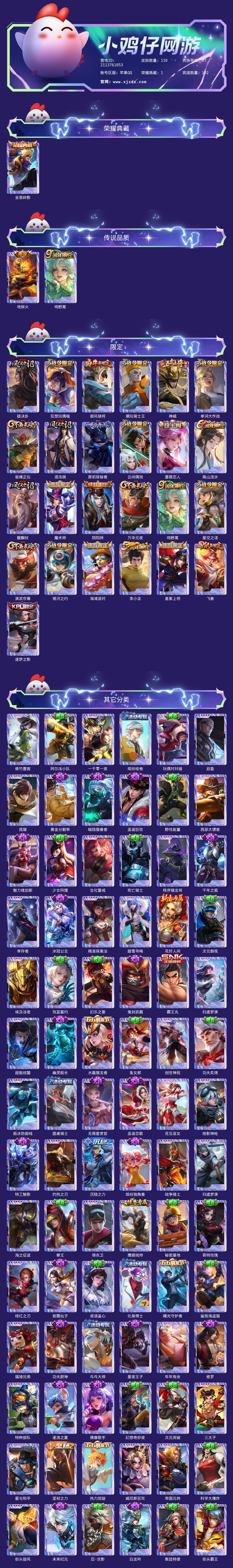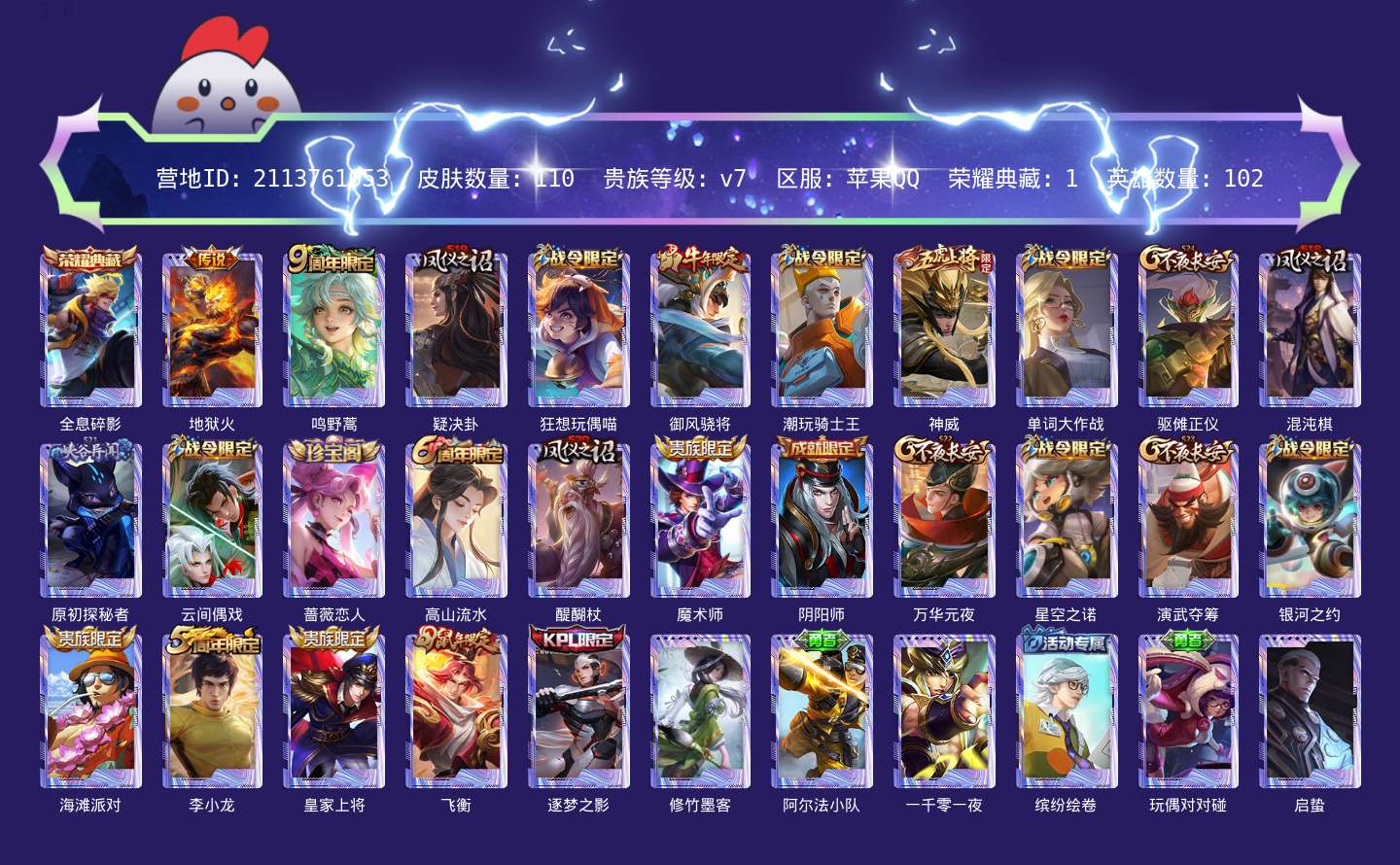 贵族等级:v7皮肤数:111生肖限定2 传说品质2 荣耀典藏1 英雄数:102