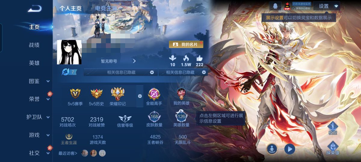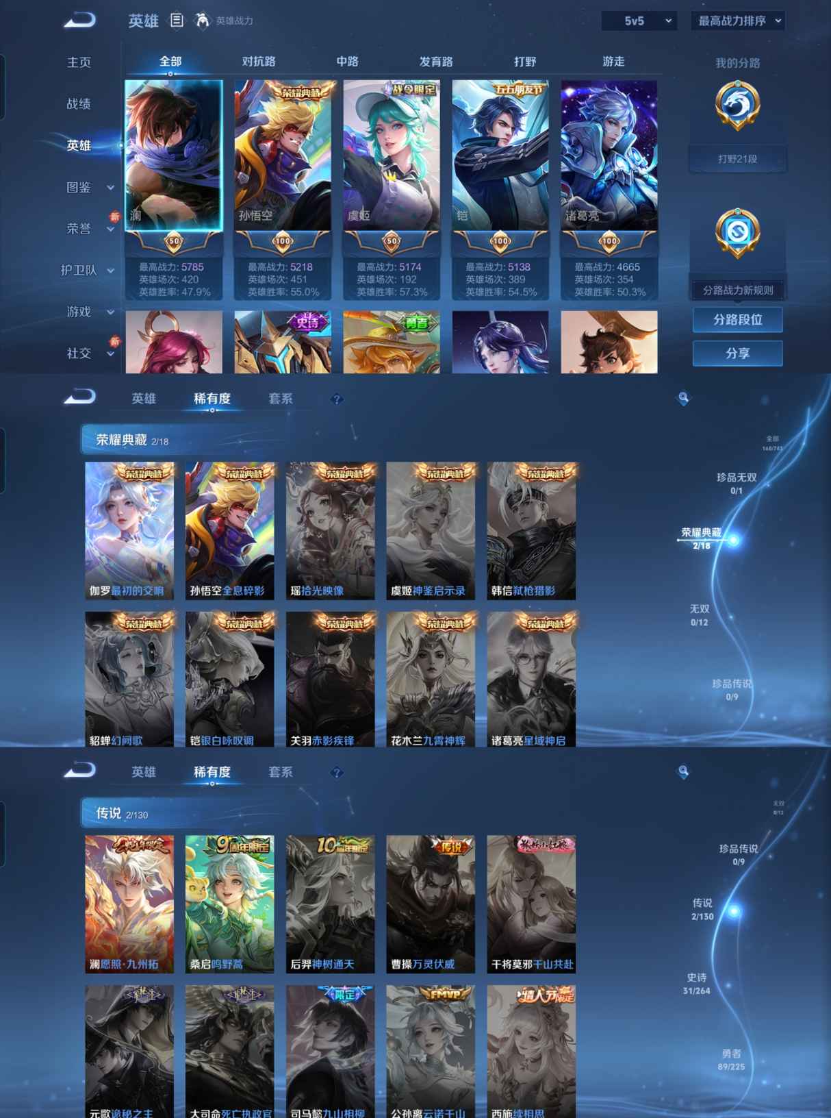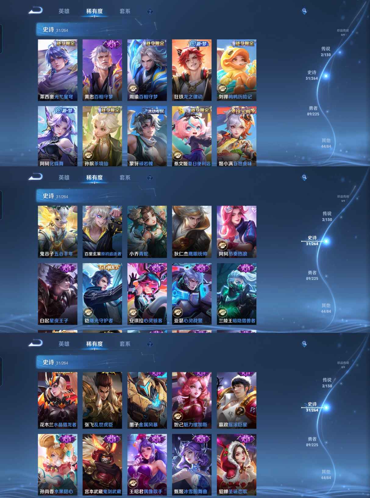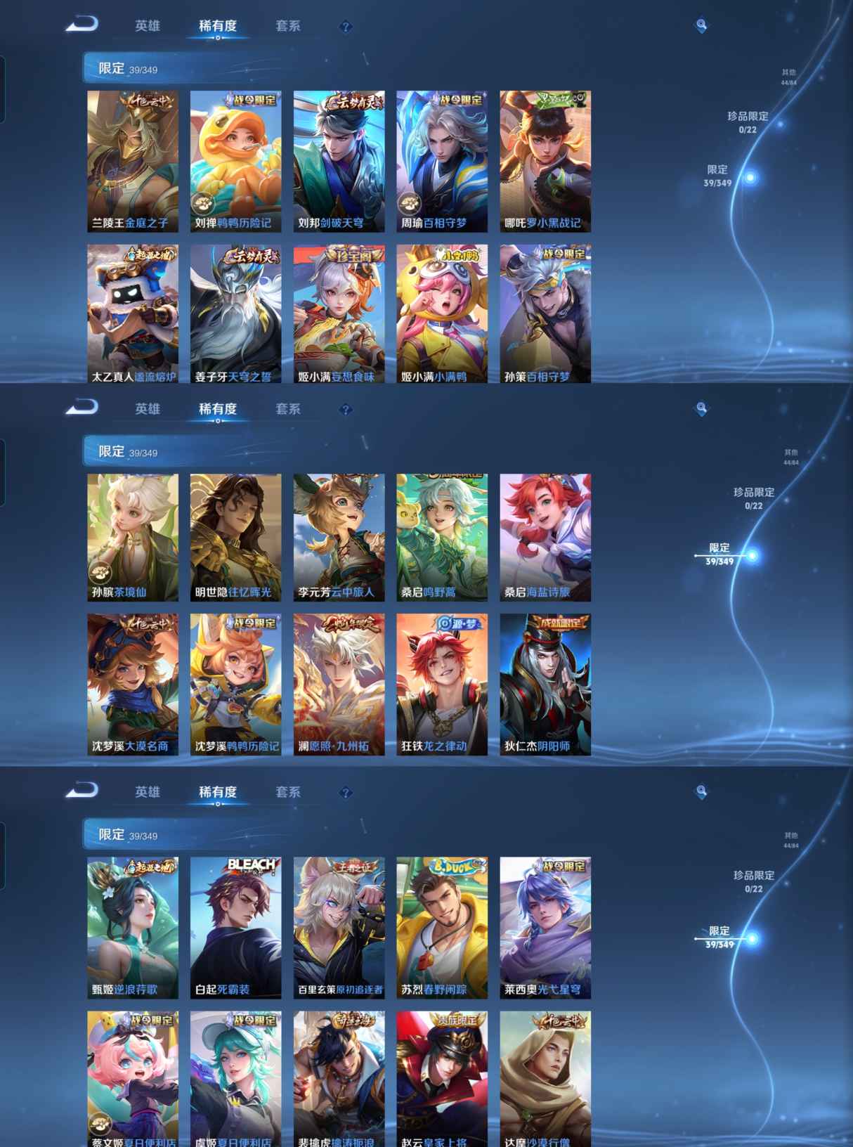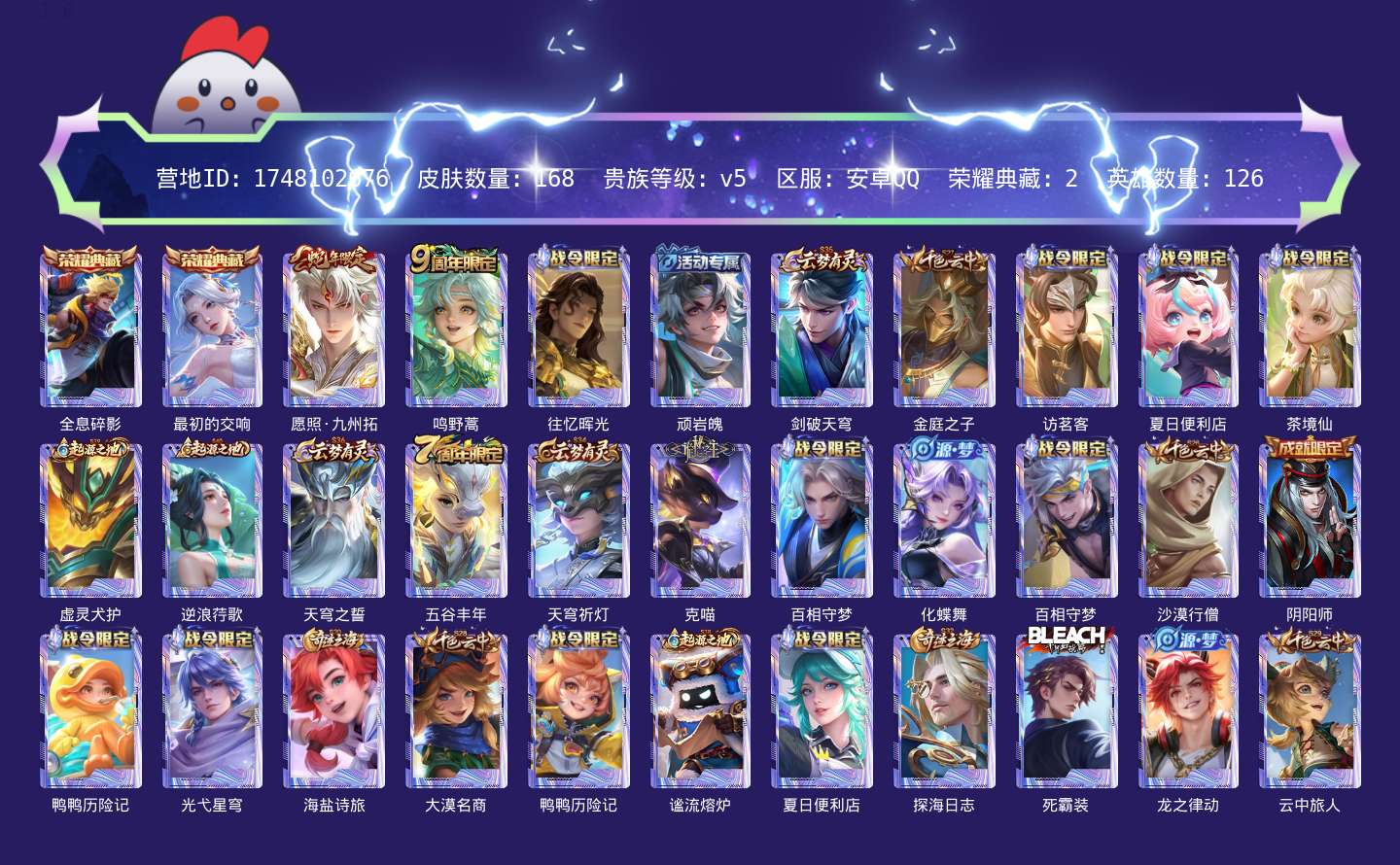 贵族等级:v5皮肤数:168传说品质2 生肖限定1 荣耀典藏2 英雄数:126