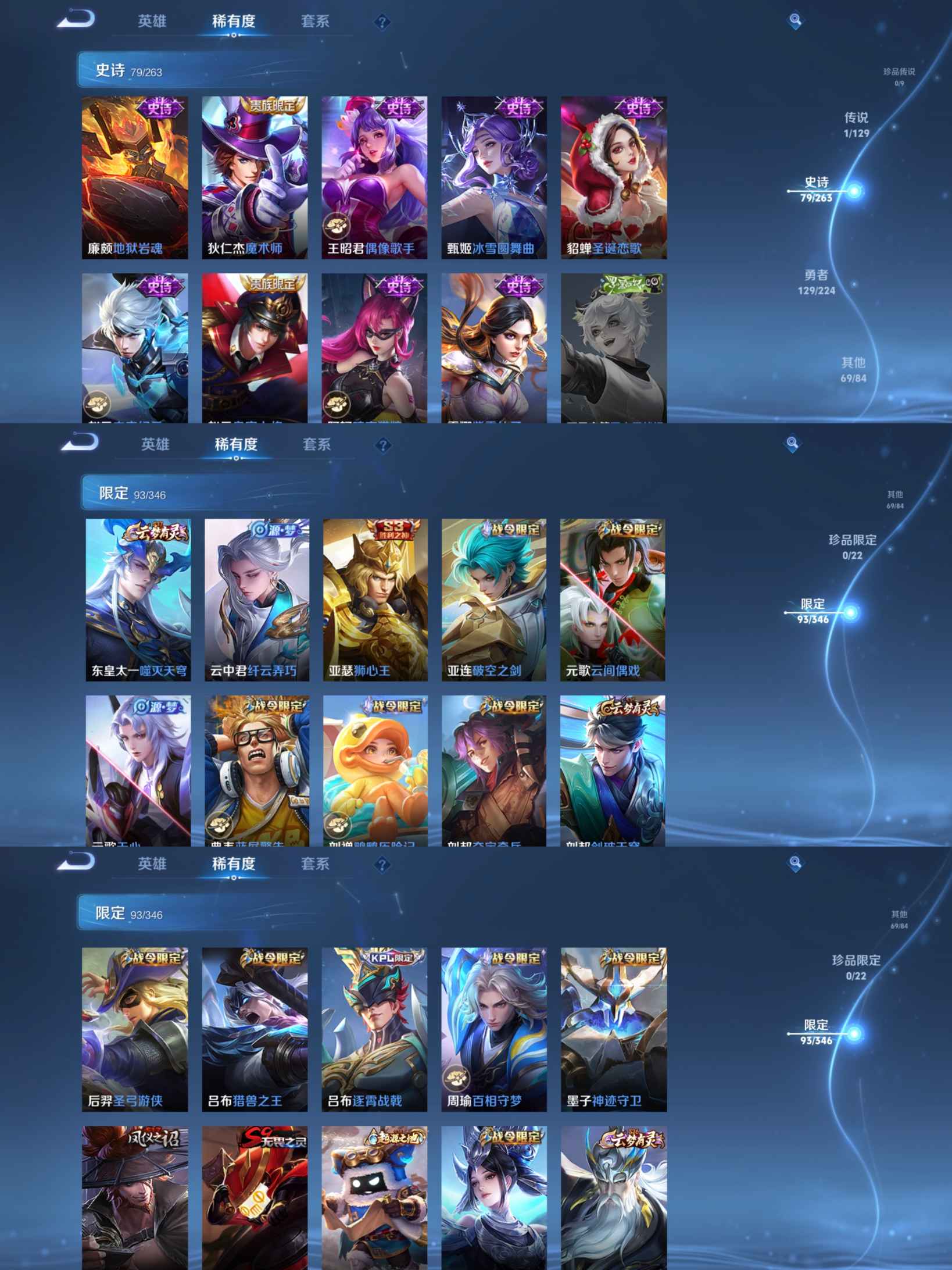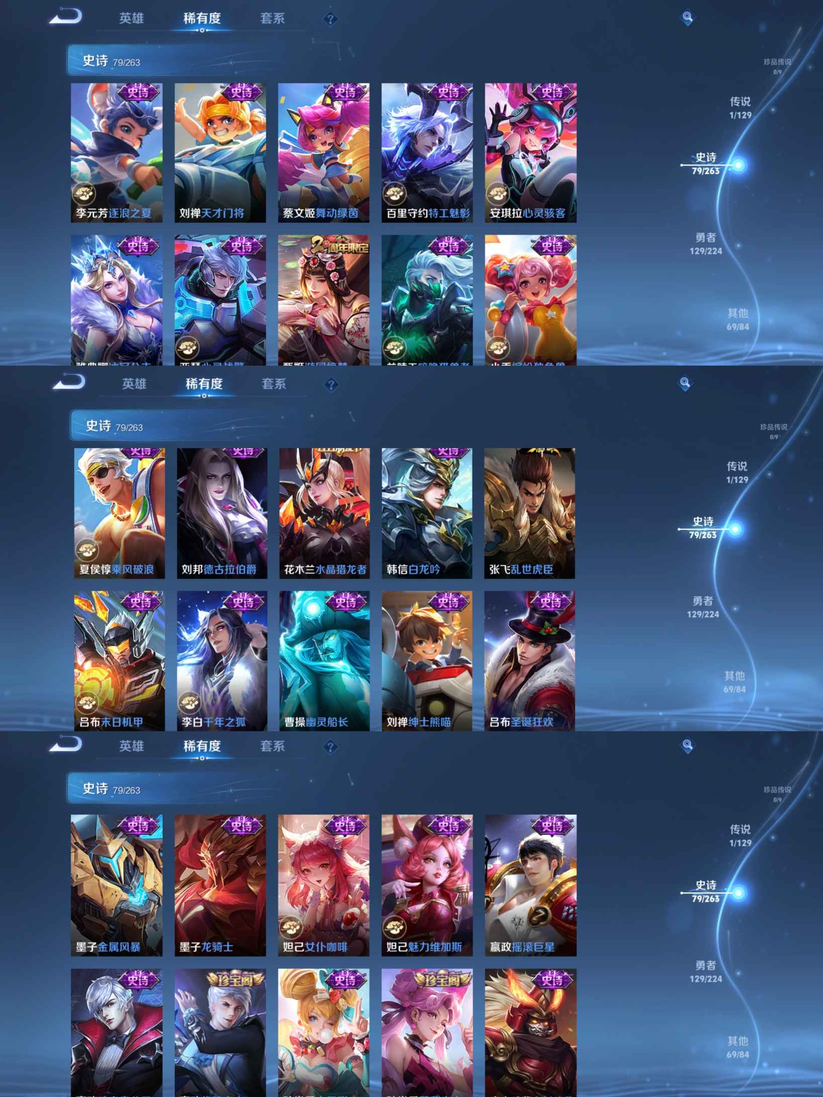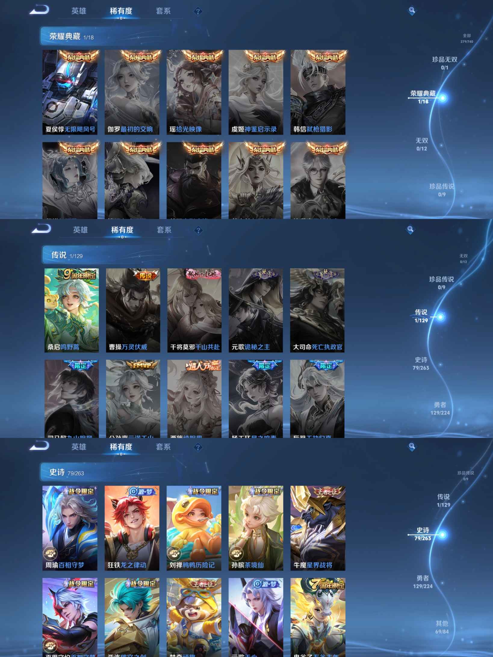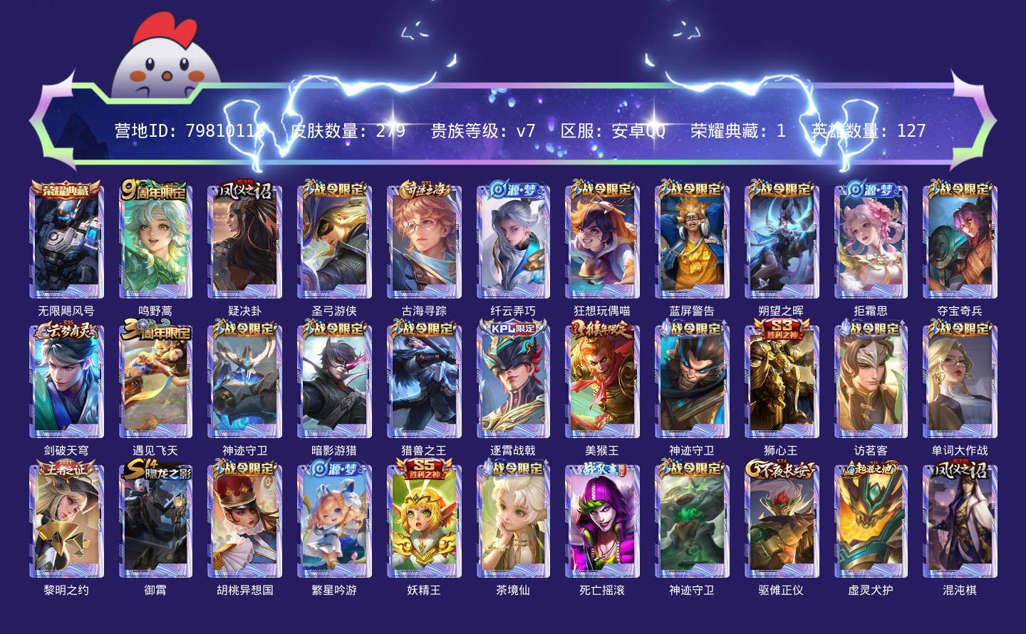 贵族等级:v7皮肤数:279生肖限定1 荣耀典藏1 传说品质1 英雄数:127