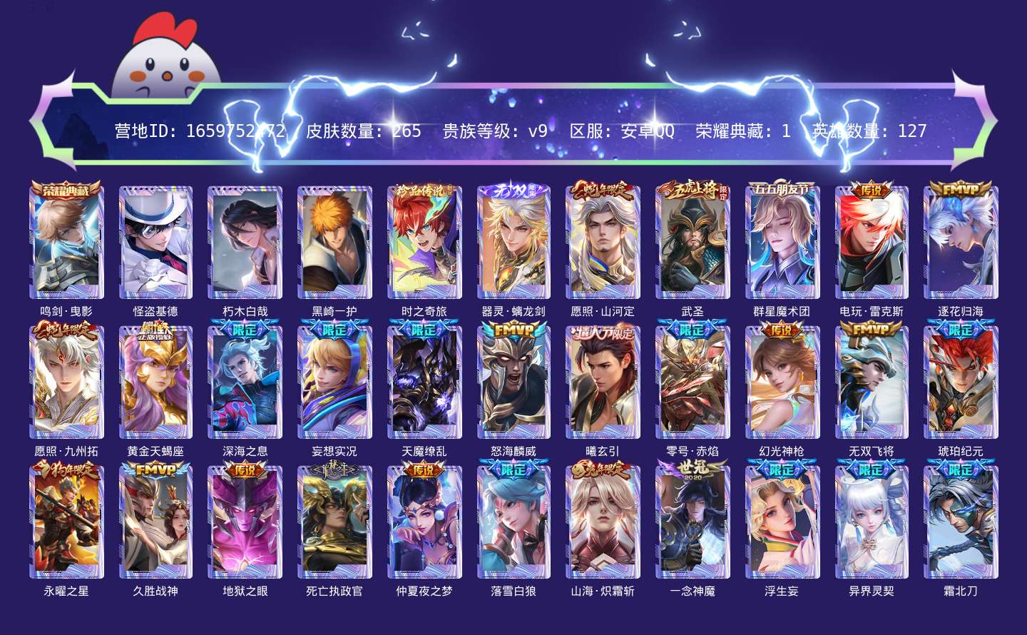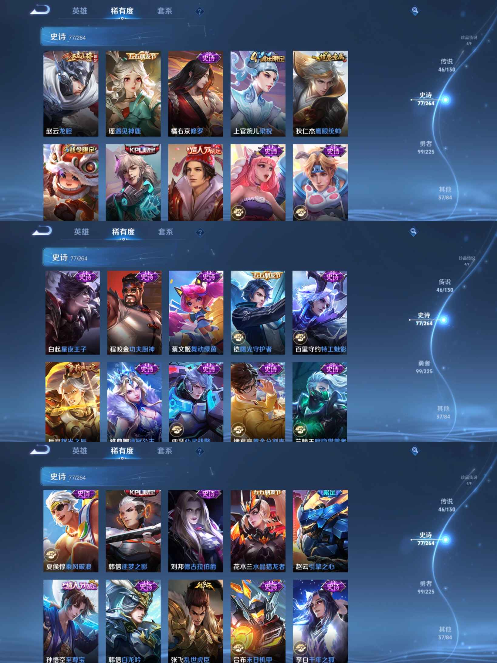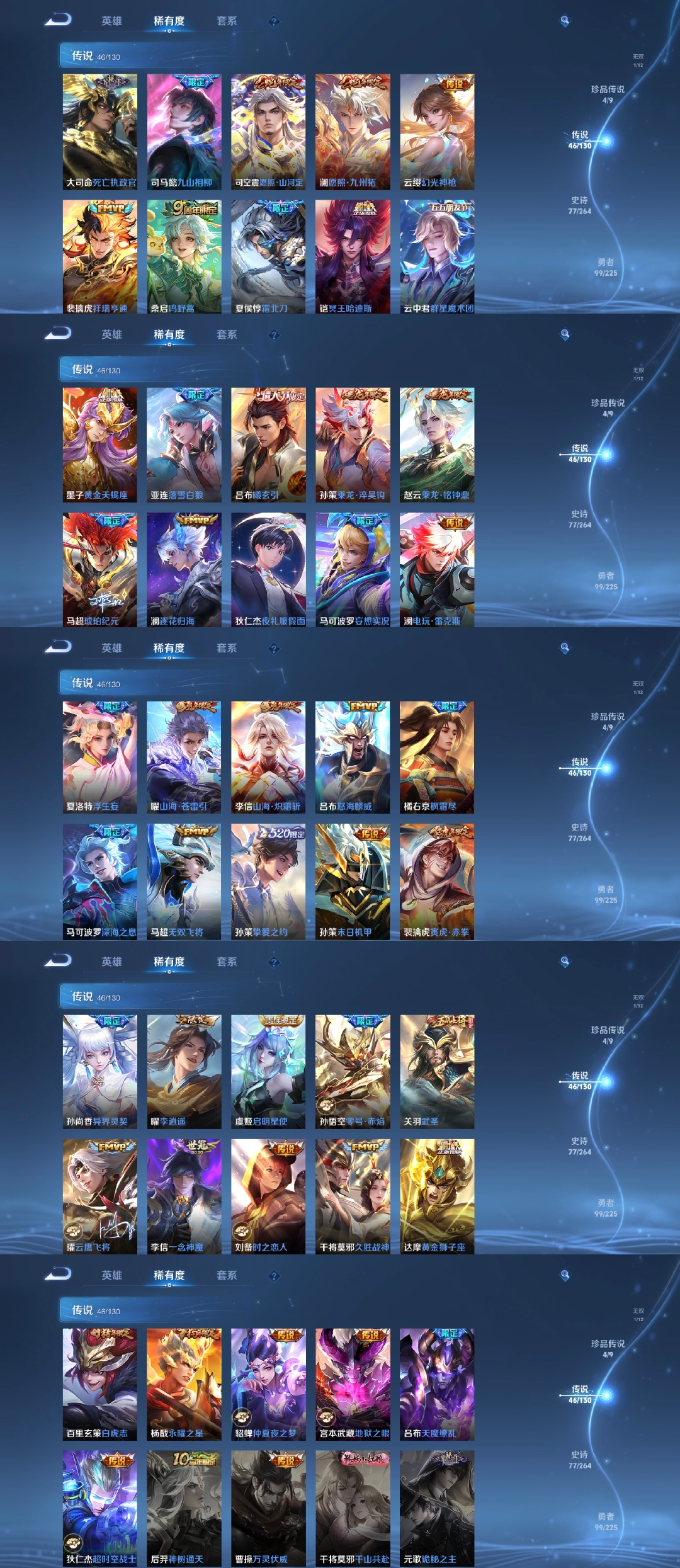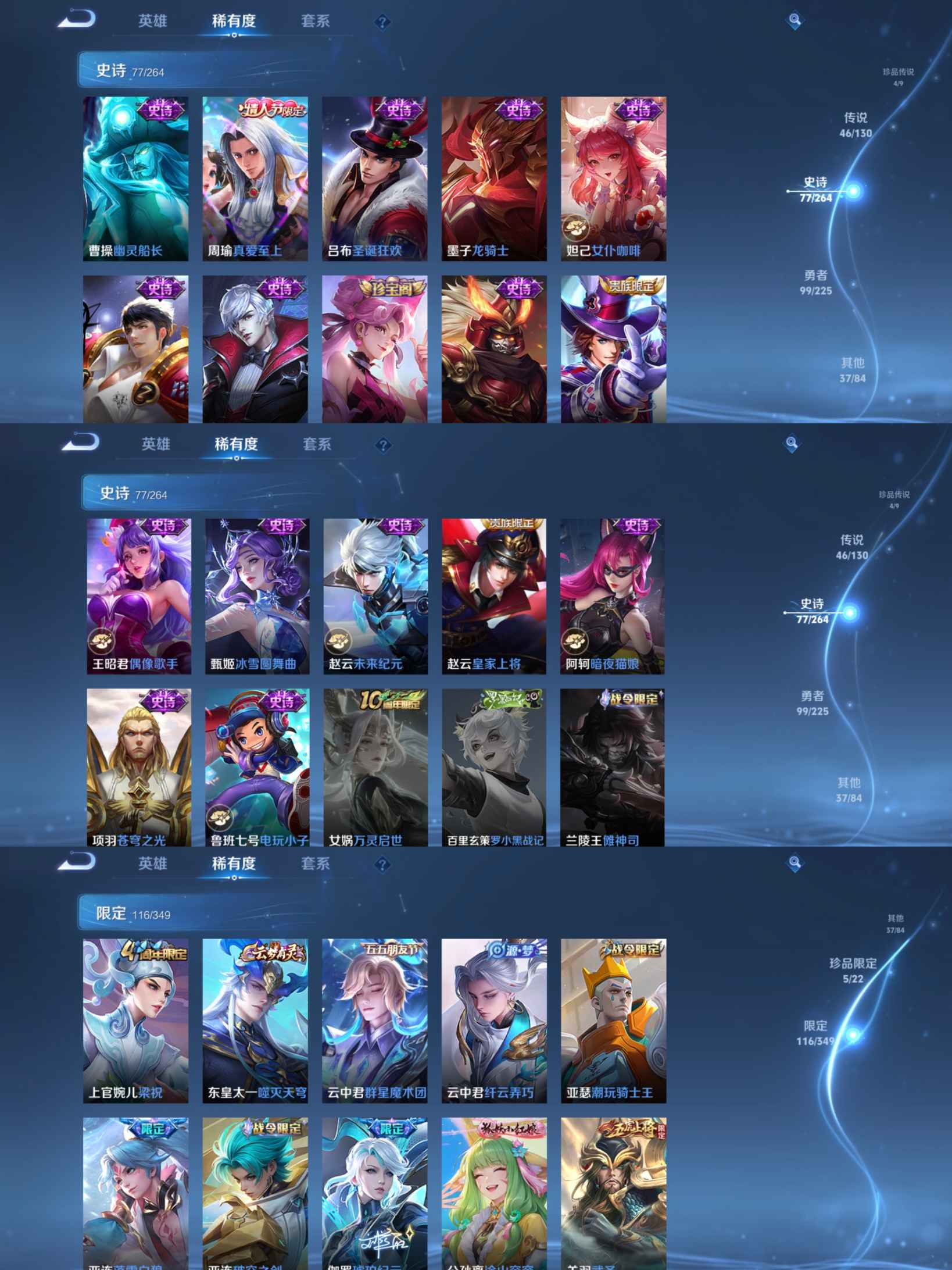 贵族等级:v9皮肤数:265生肖限定12 传说品质46 珍品传说4 情人节限定5 荣耀典藏1 无双1 英雄数:127