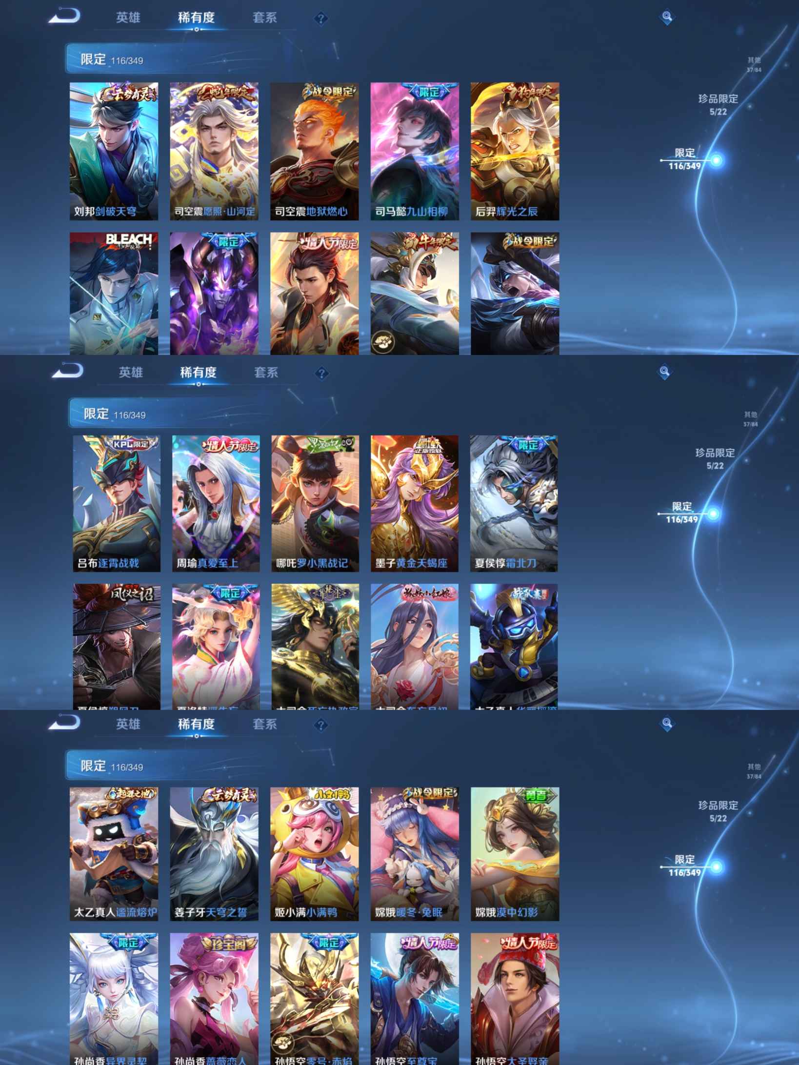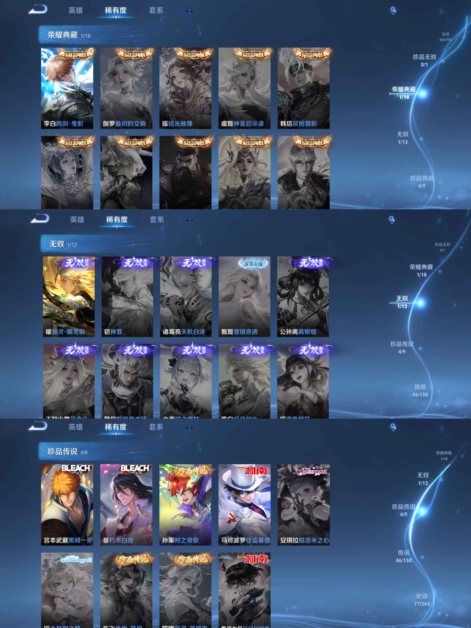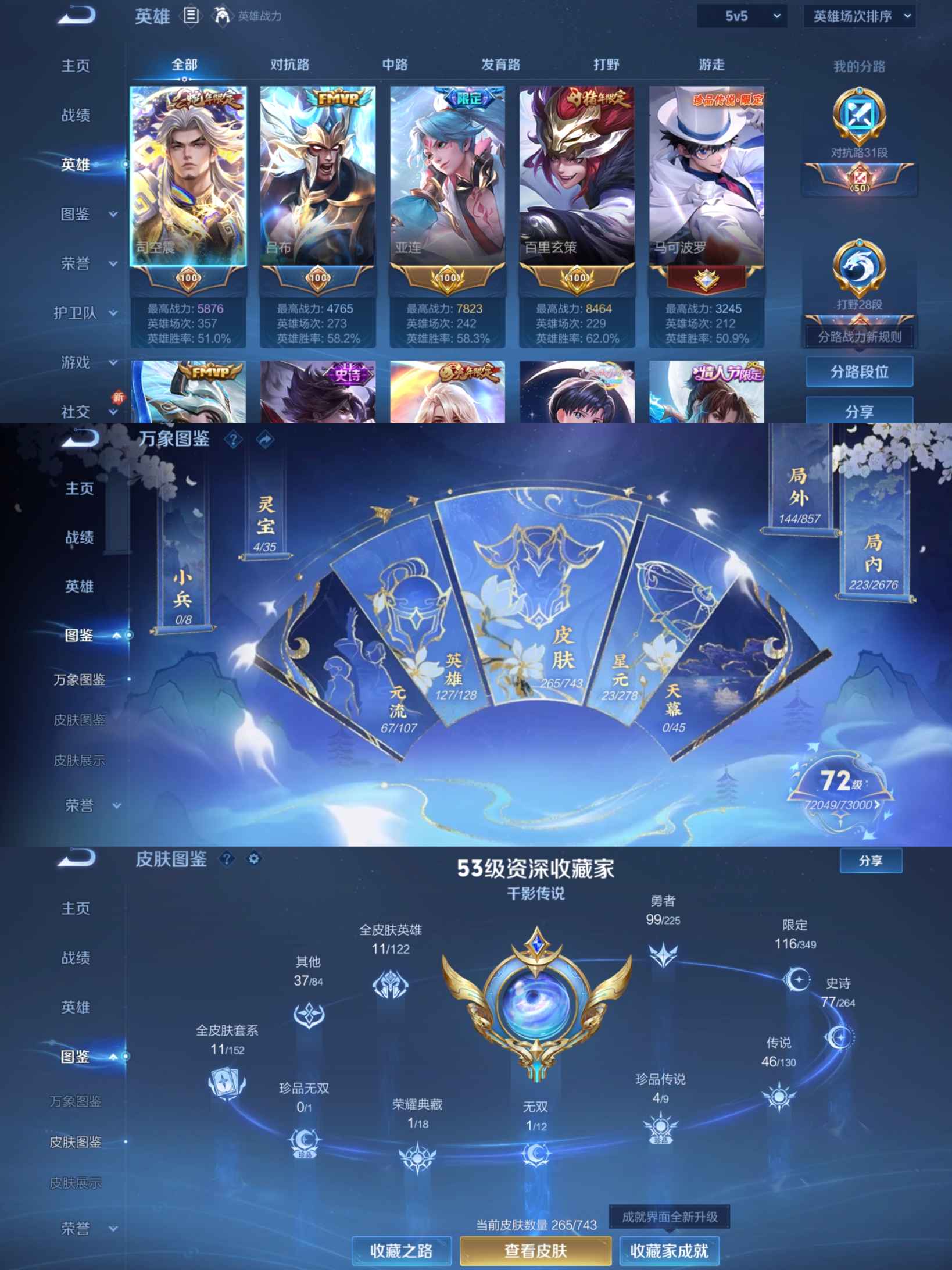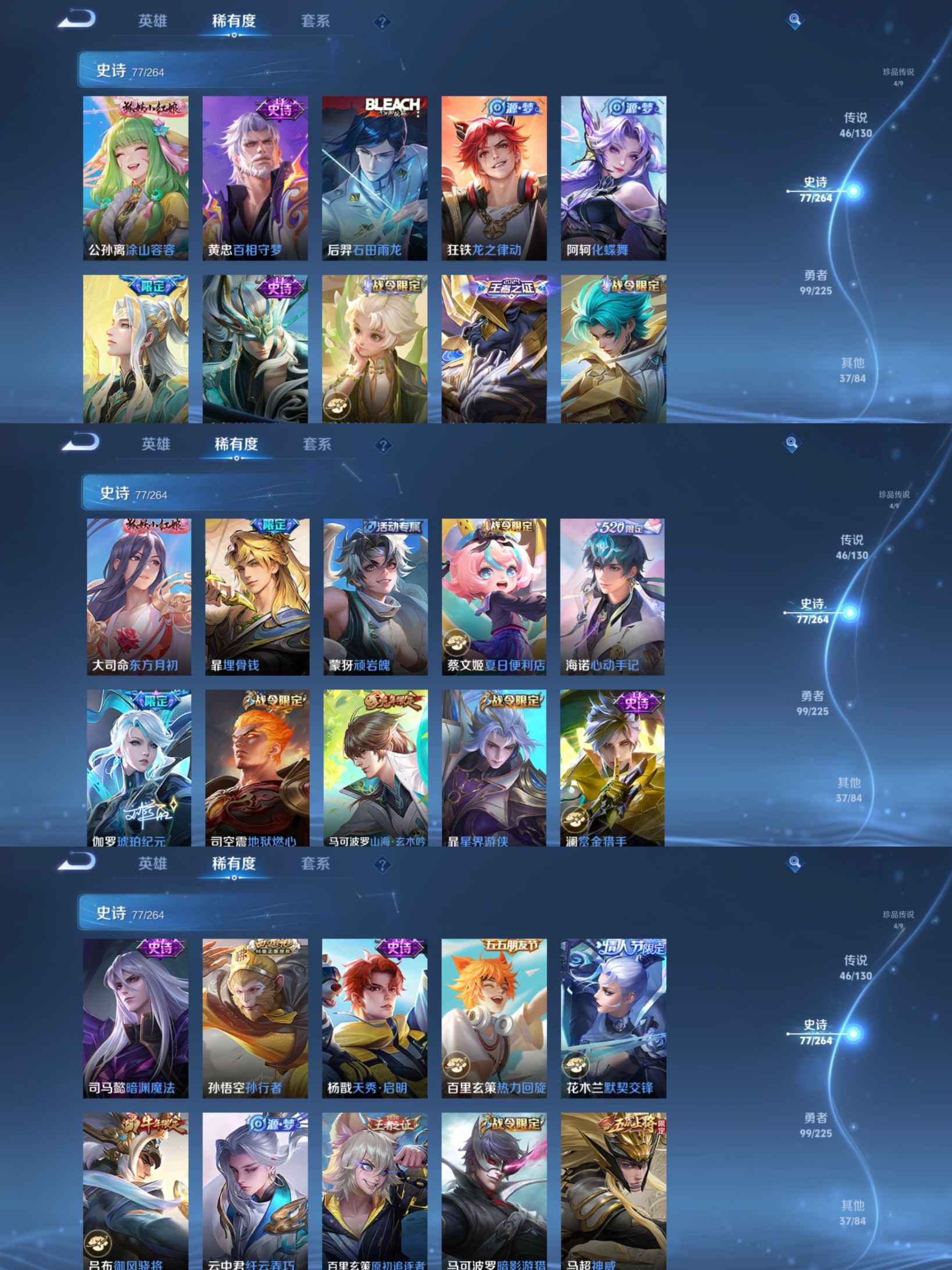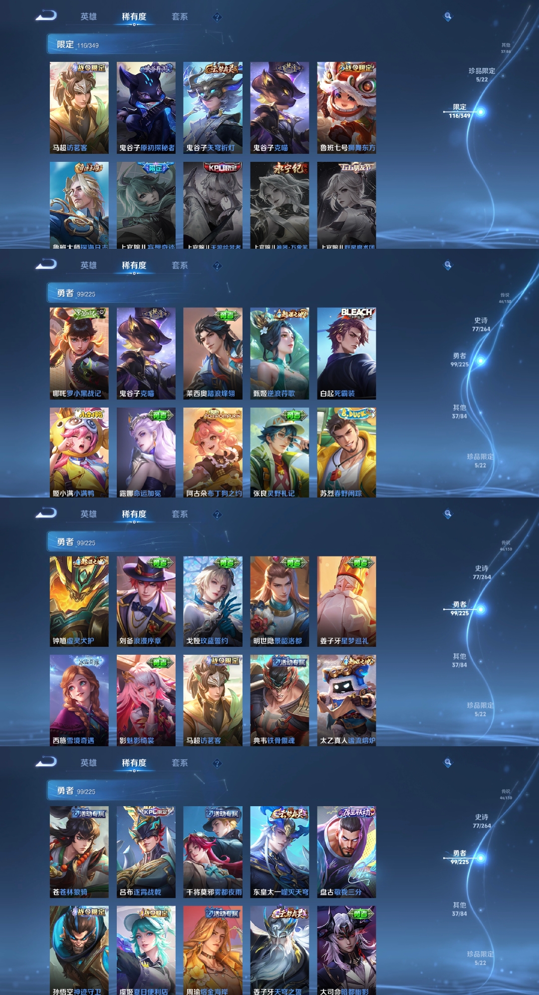 贵族等级:v9皮肤数:265生肖限定12 传说品质46 珍品传说4 情人节限定5 荣耀典藏1 无双1 英雄数:127