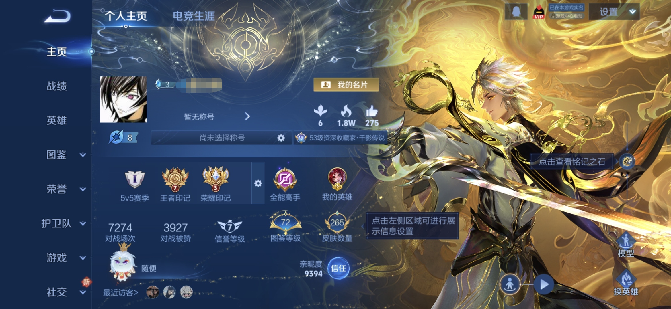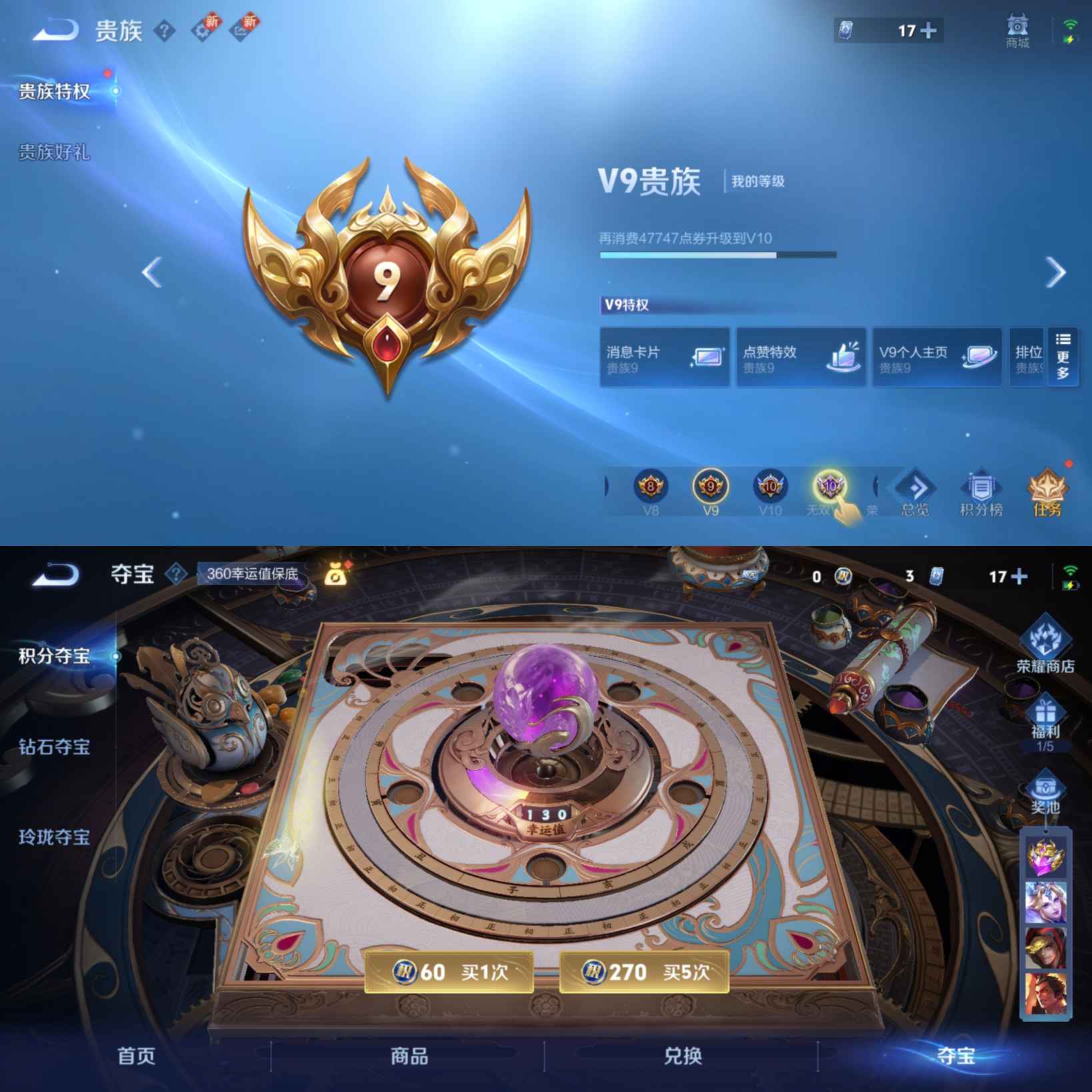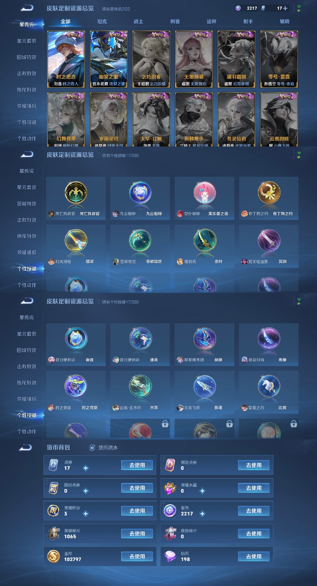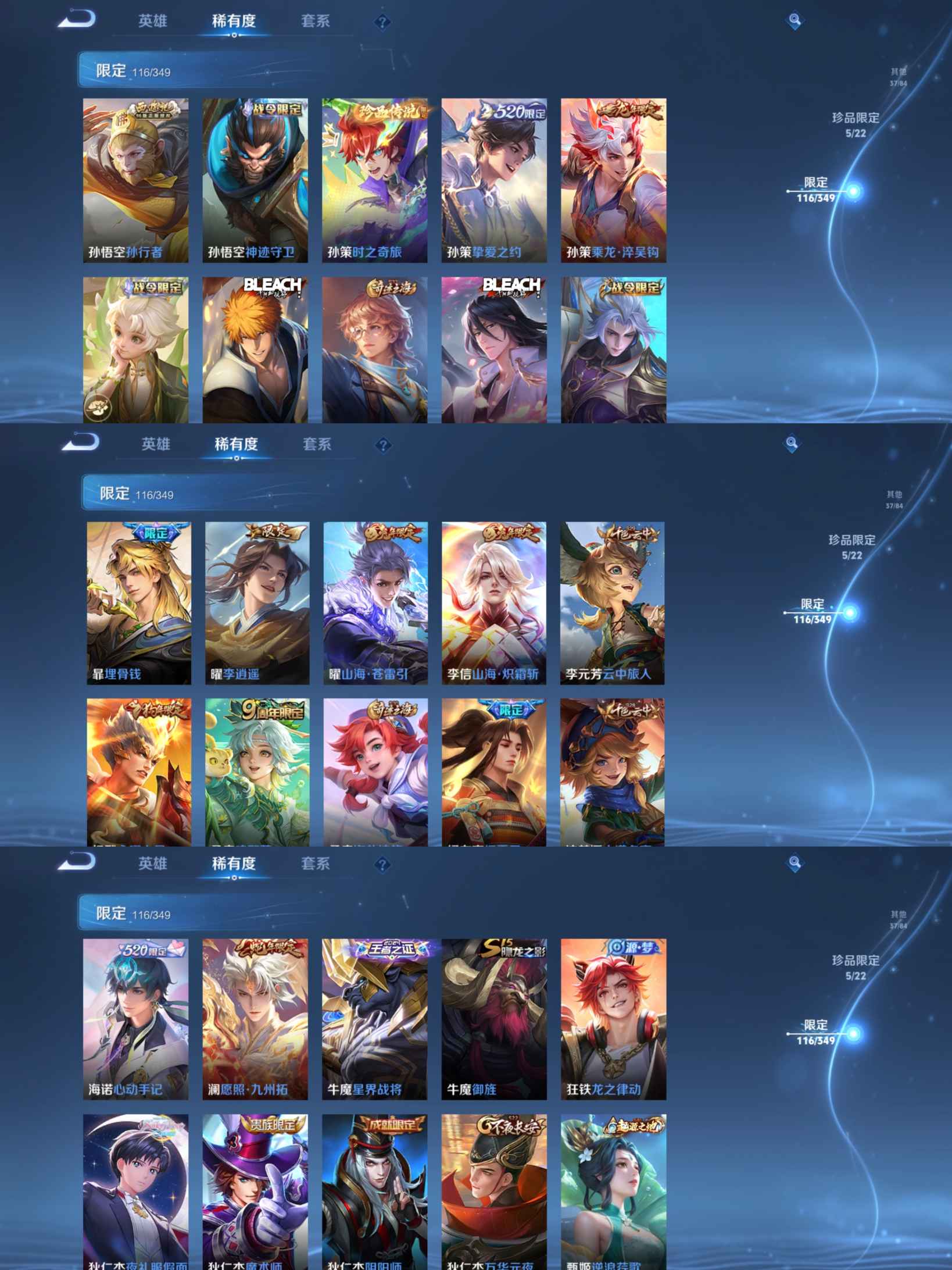 贵族等级:v9皮肤数:265生肖限定12 传说品质46 珍品传说4 情人节限定5 荣耀典藏1 无双1 英雄数:127