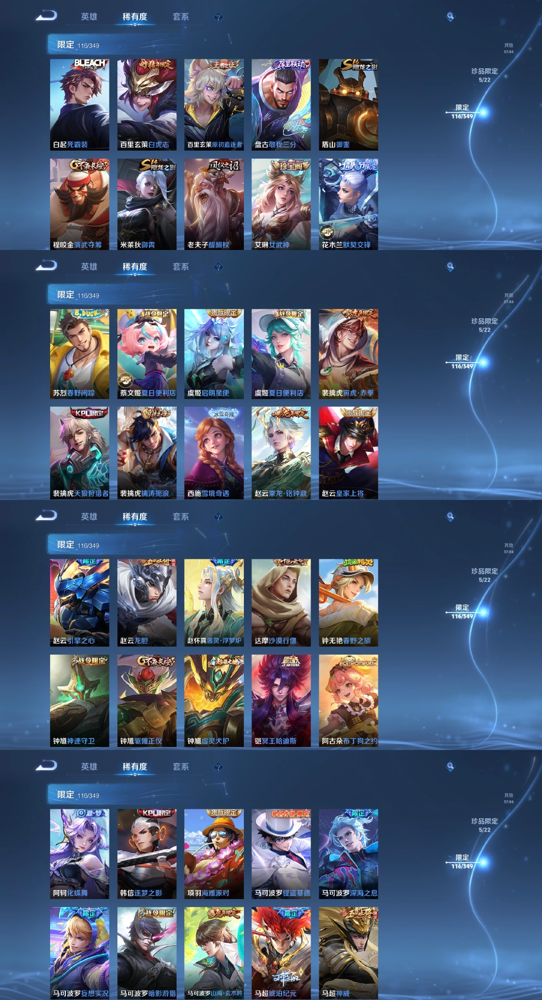 传说品质_司空震_愿照·山河定传说品质_关羽_武圣传说品质_云中君_群星魔术团传说品质_澜_电玩·雷克斯传说品质_澜_逐花归海传说品质_澜_愿照·九州拓传说品质_墨子_黄金天蝎座传说品质_马可波罗_深海之息传说品质_马可波罗_妄想实况传说品质_吕布_天魔缭乱传说品质_吕布_怒海麟威传说品质_吕布_曦玄引传说品质_孙悟空_零号·赤焰传说品质_云缨_幻光神枪传说品质_马超_无双飞将传说品质_马超_琥珀纪元传说品质_杨戬_永曜之星传说品质_干将莫邪_久胜战神传说品质_宫本武藏_地狱之眼传说品质_大司命_死亡执政官传说品质_貂蝉_仲夏夜之梦传说品质_亚连_落雪白狼传说品质_李信_山海·炽霜斩传说品质_李信_一念神魔传说品质_夏洛特_浮生妄传说品质_孙尚香_异界灵契传说品质_夏侯惇_霜北刀传说品质_曜_云鹰飞将传说品质_曜_李逍遥 传说品质_曜_山海·苍雷引传说品质_孙策_末日机甲传说品质_孙策_挚爱之约传说品质_孙策_乘龙·淬吴钩传说品质_达摩_黄金狮子座传说品质_狄仁杰_超时空战士传说品质_狄仁杰_夜礼服假面传说品质_司马懿_九山相柳传说品质_桑启_鸣野蒿传说品质_铠_冥王哈迪斯传说品质_虞姬_启明星使传说品质_刘备_时之恋人传说品质_橘右京_枫霜尽传说品质_百里玄策_白虎志传说品质_裴擒虎_寅虎·赤拳传说品质_裴擒虎_祥瑞亨通传说品质_赵云_乘龙·铭钟鼎