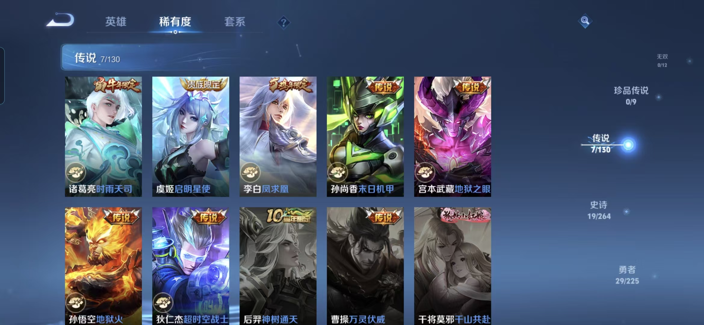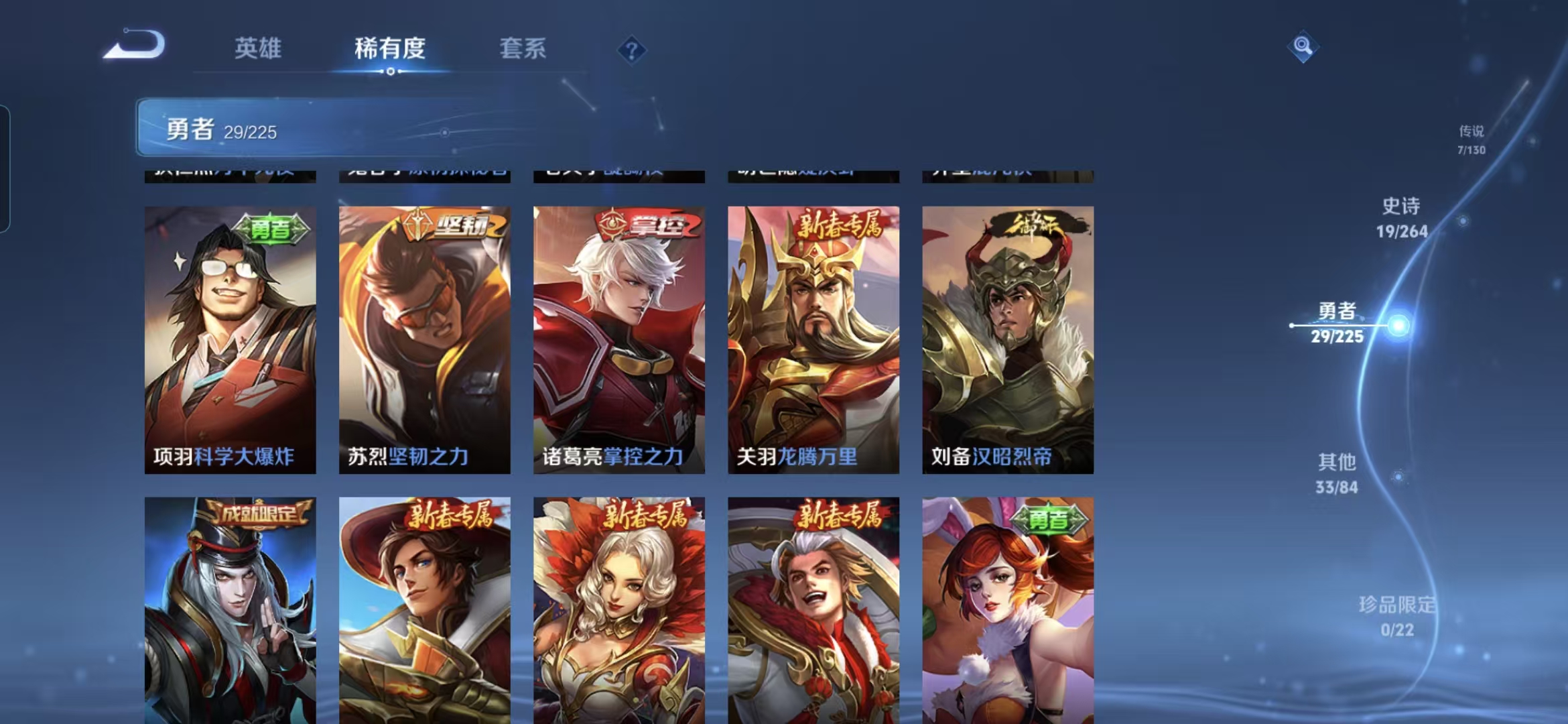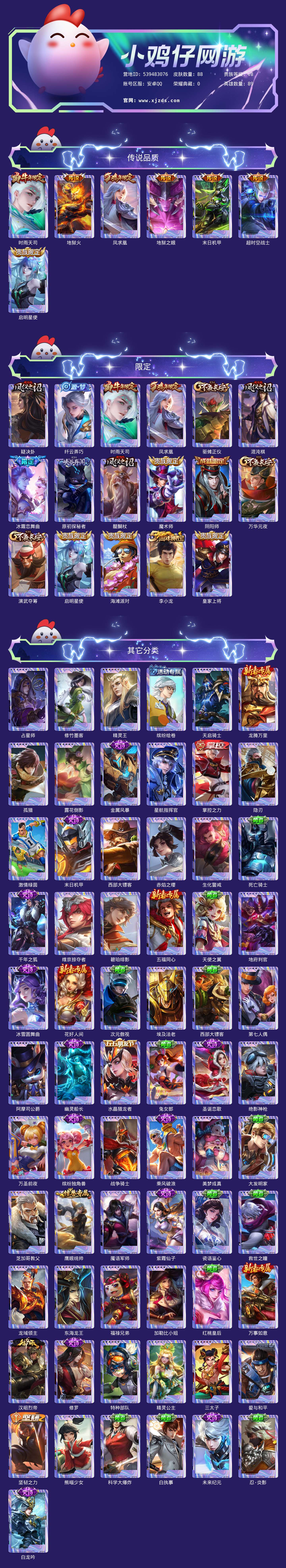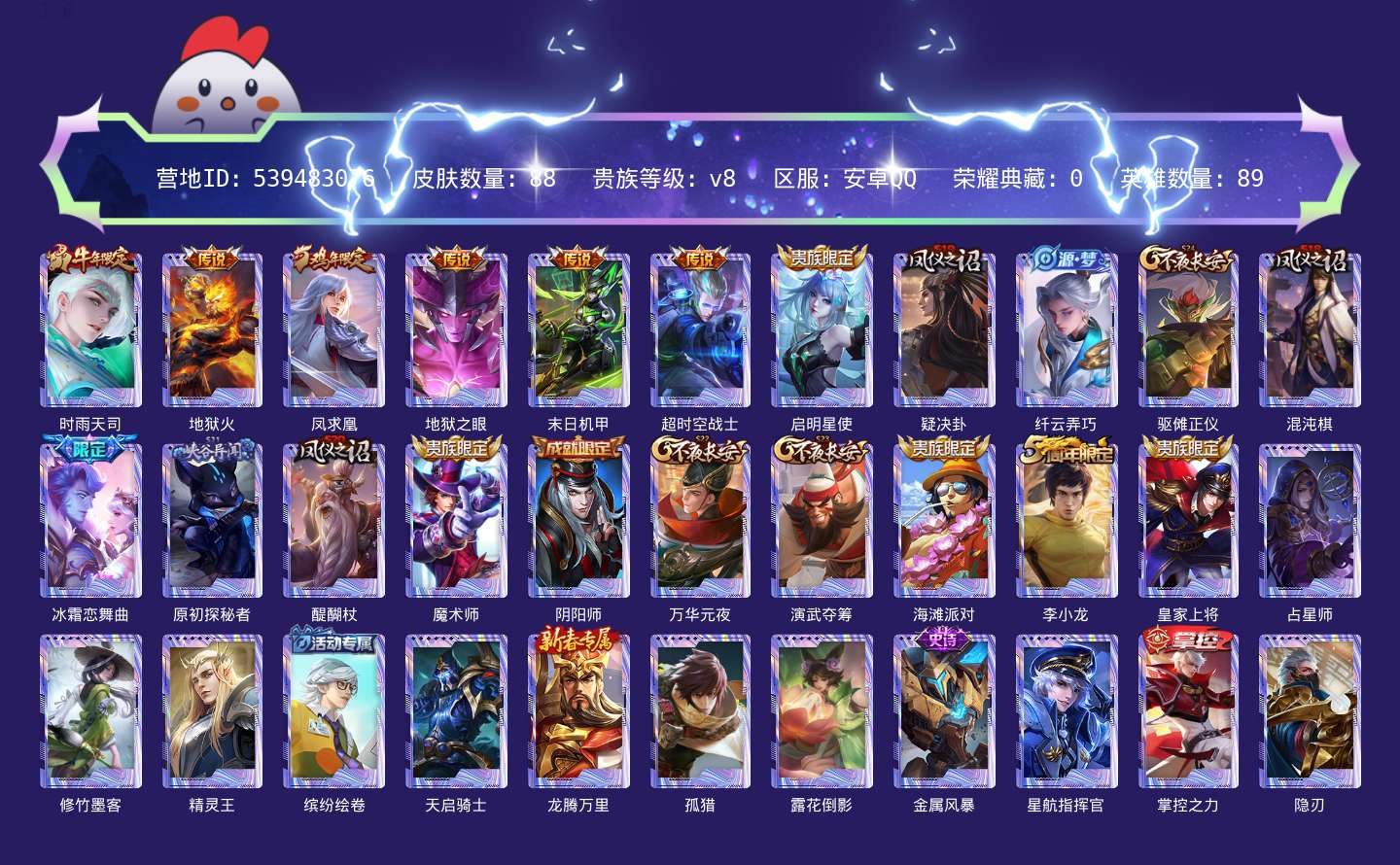 贵族等级:v8皮肤数:88传说品质7 生肖限定2 英雄数:89