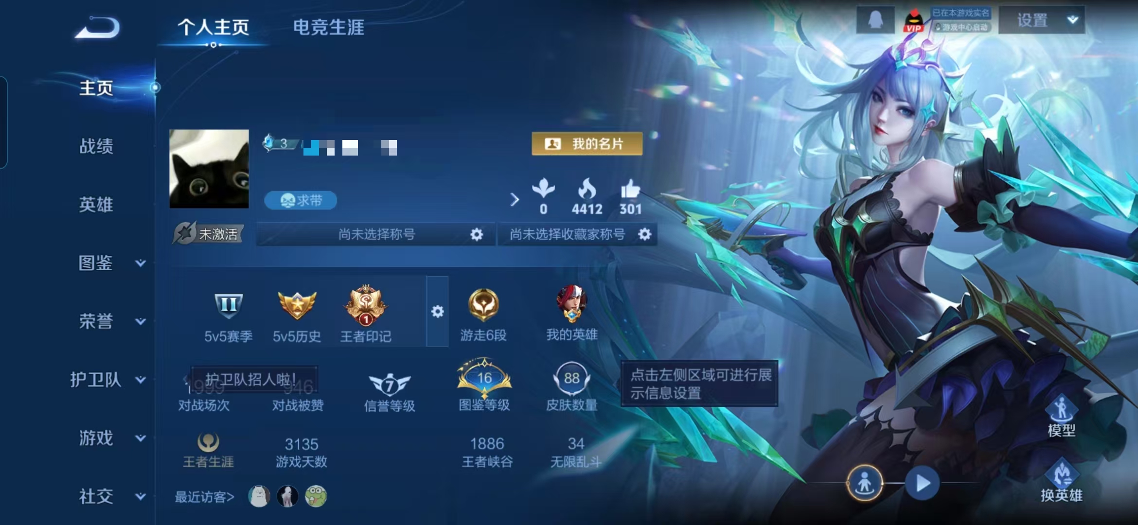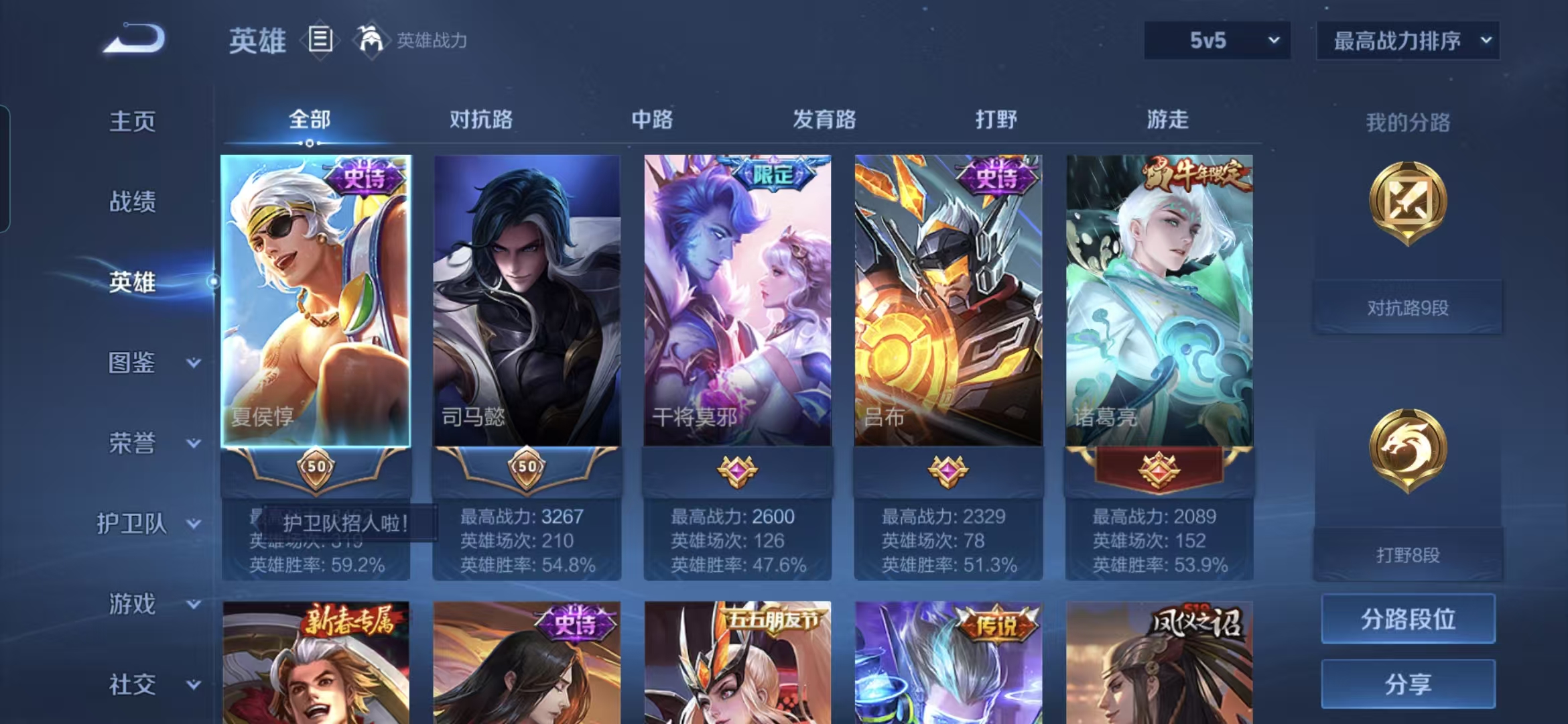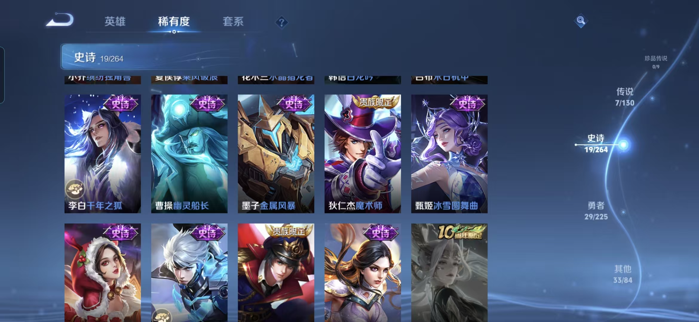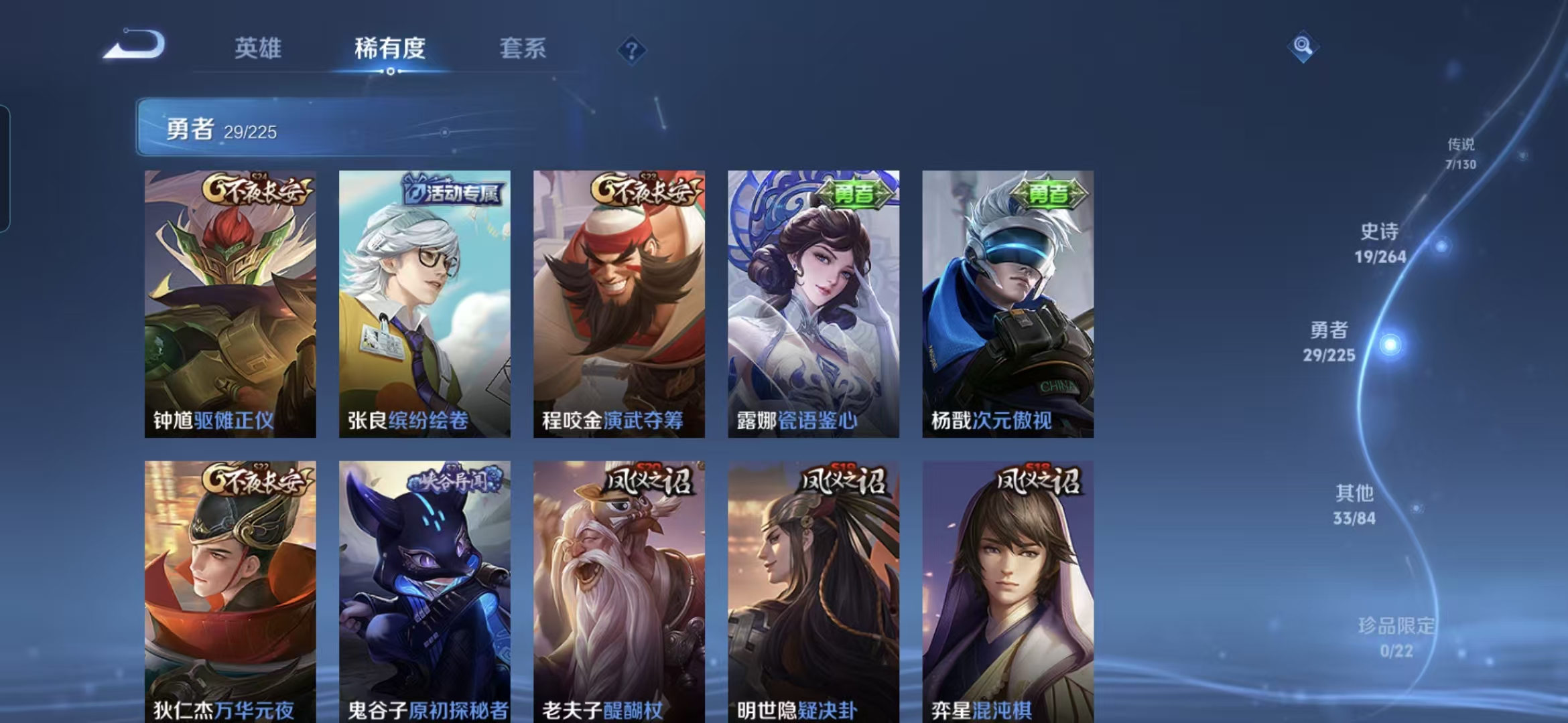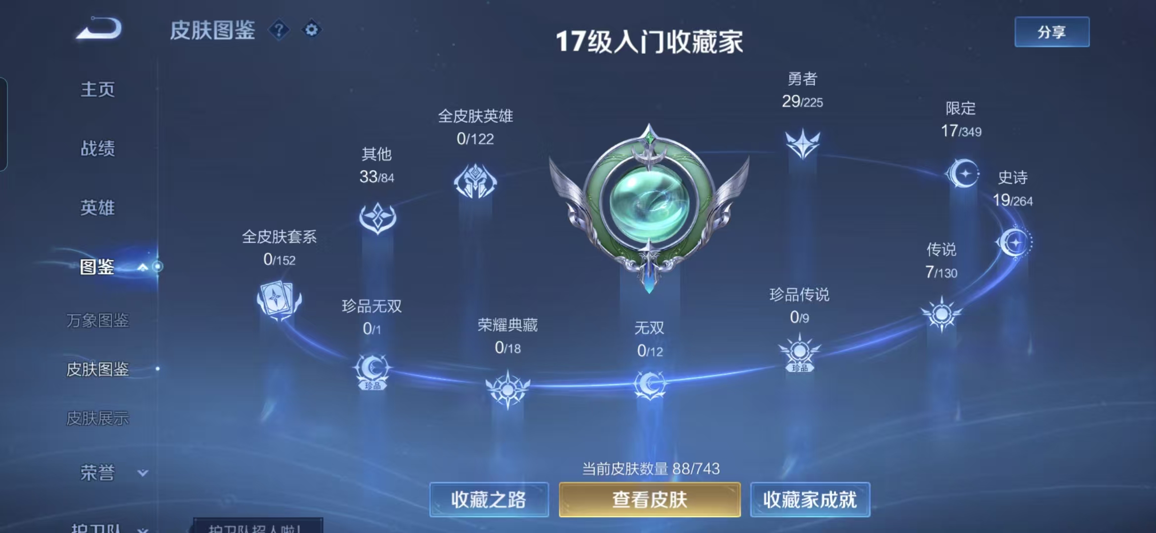 贵族等级:v8皮肤数:88传说品质7 生肖限定2 英雄数:89
