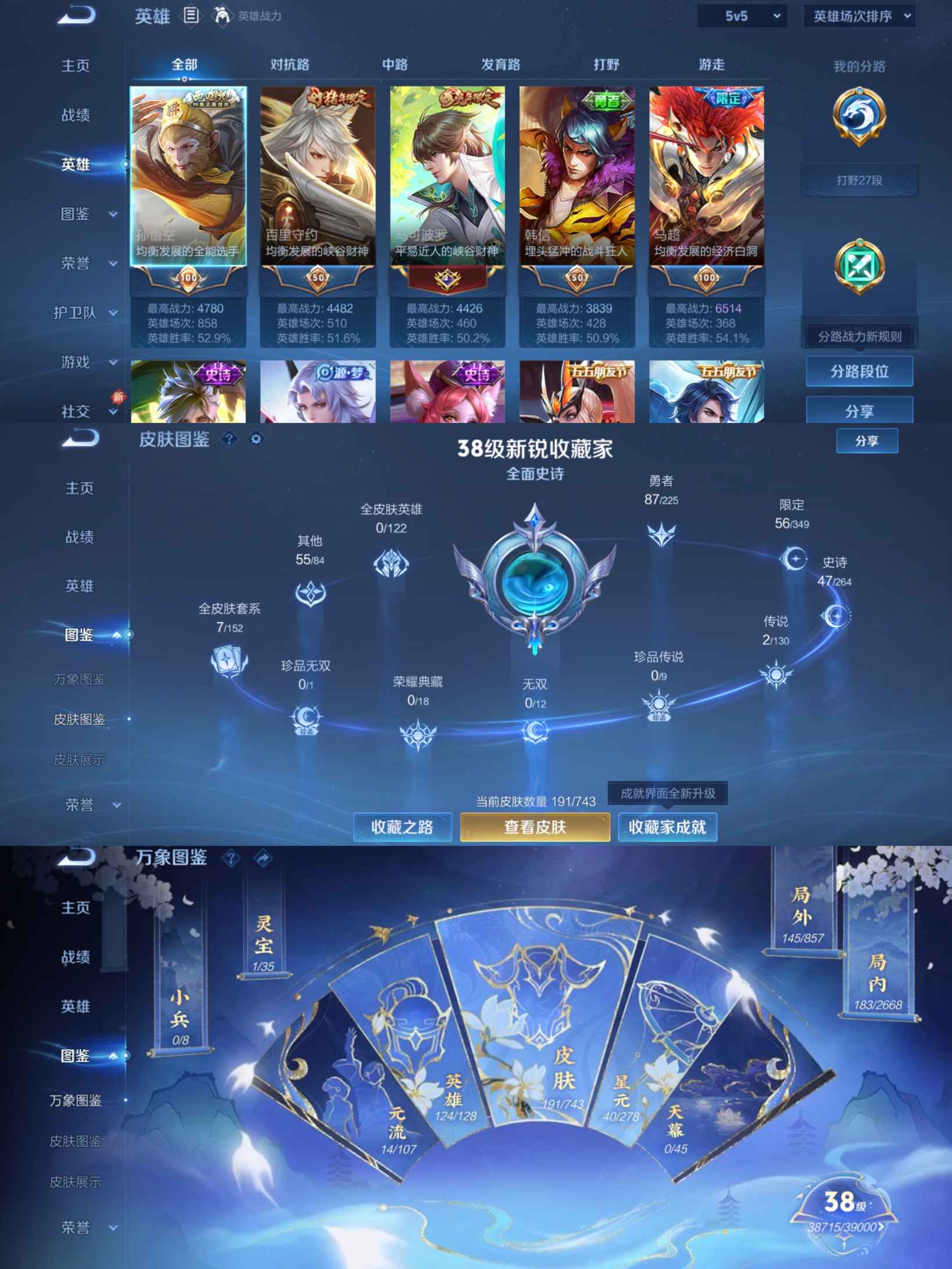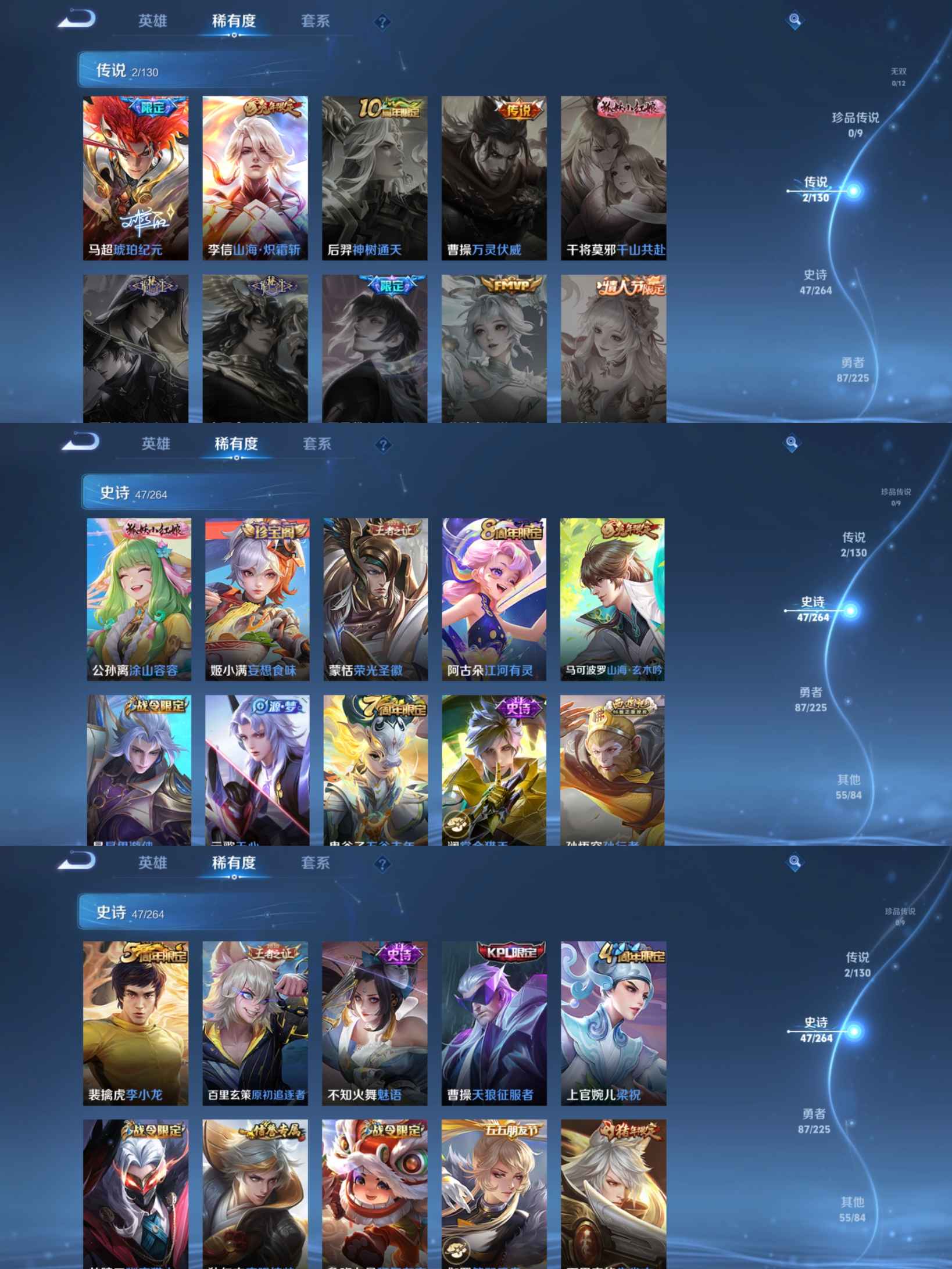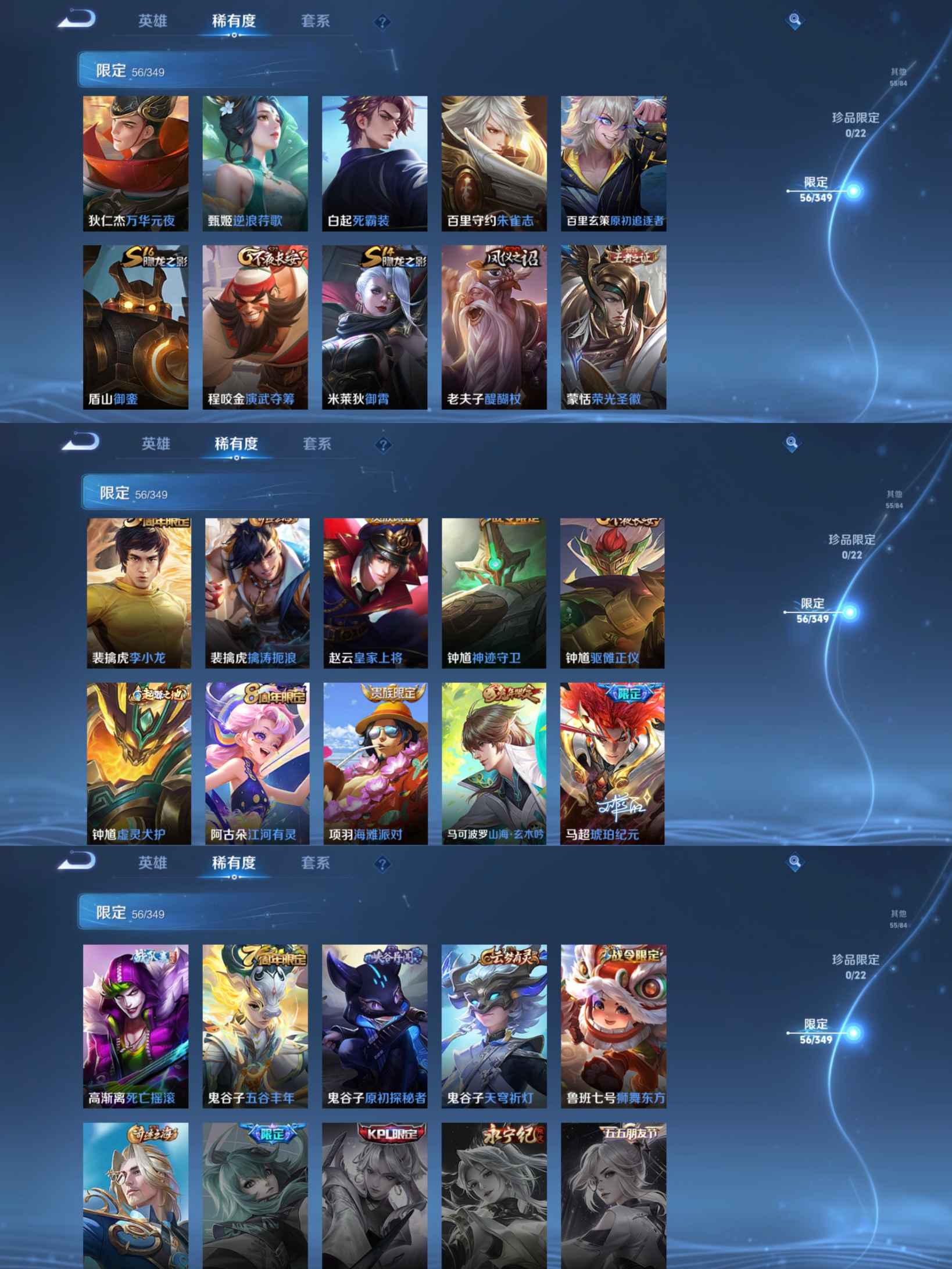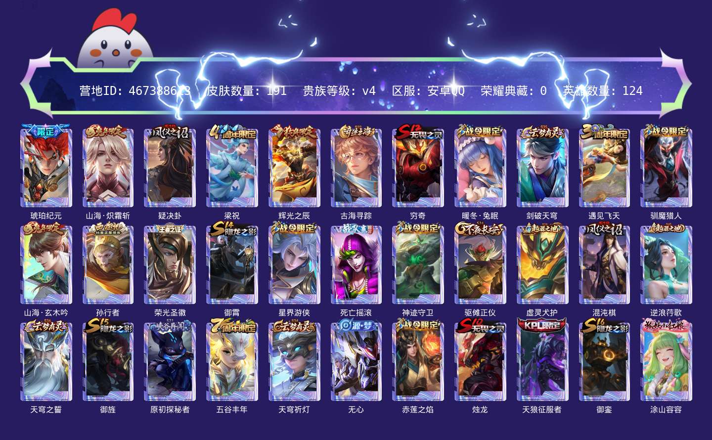 贵族等级:v4皮肤数:191生肖限定4 传说品质2 英雄数:124