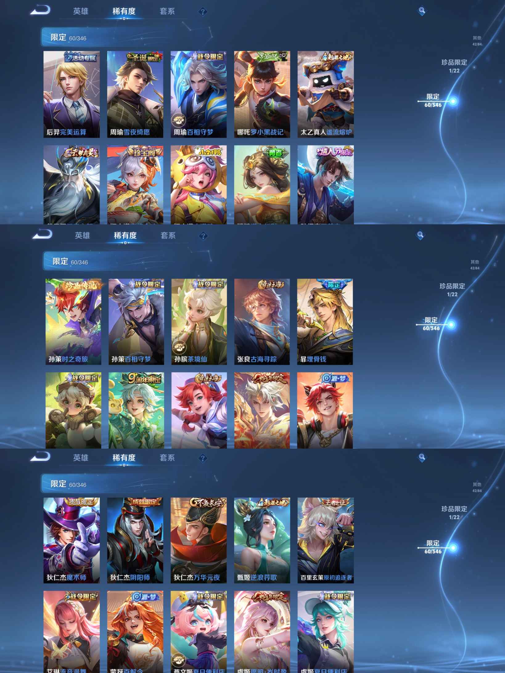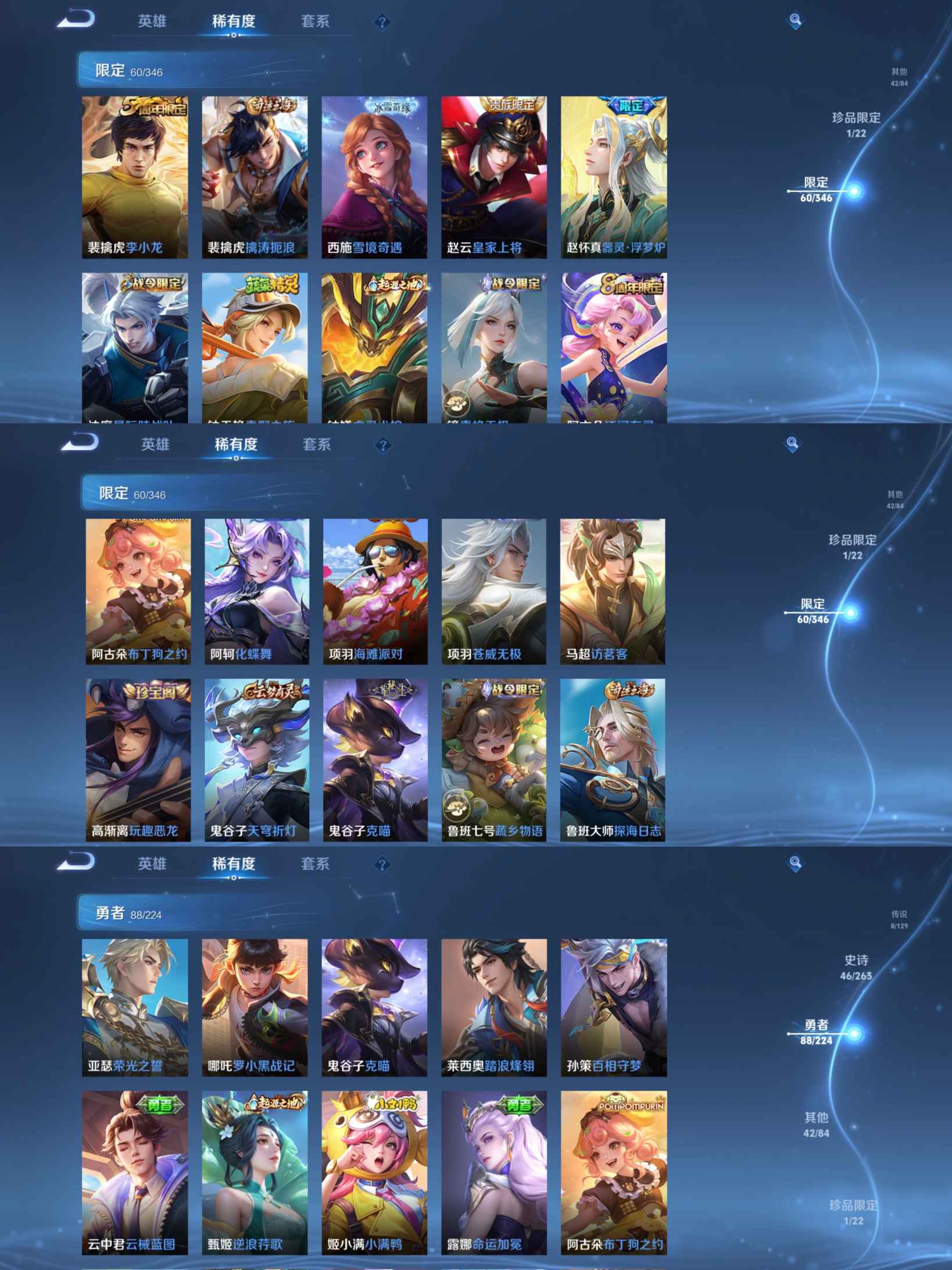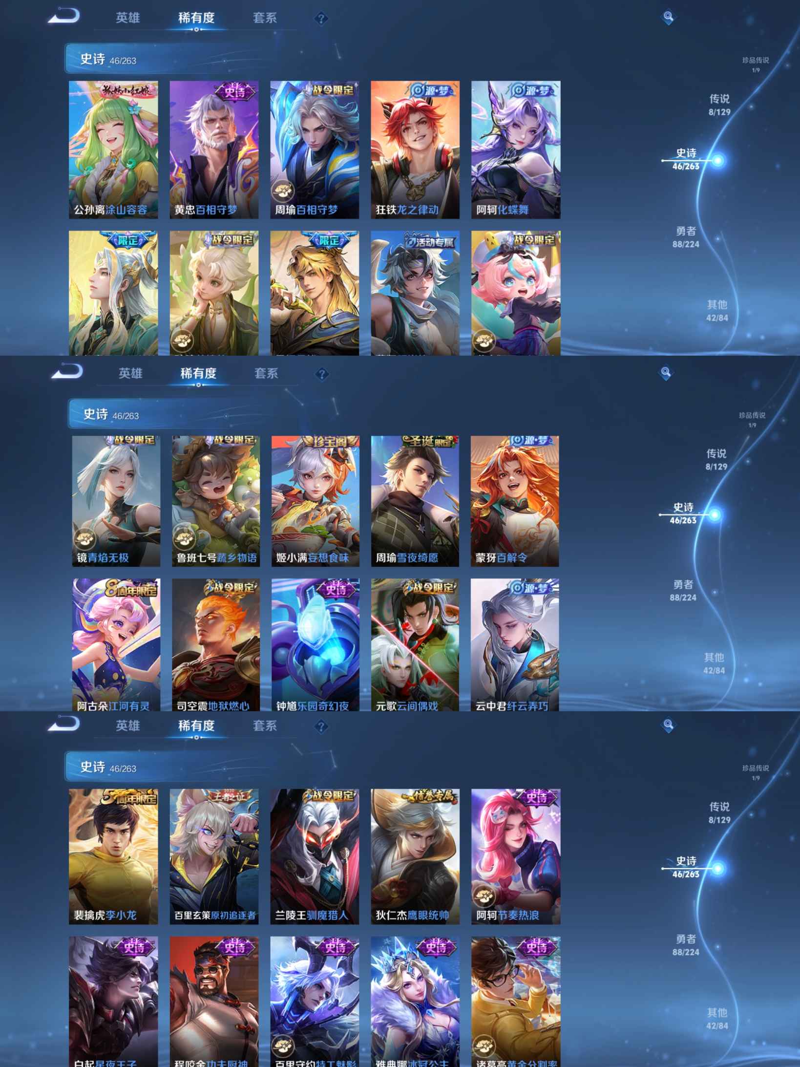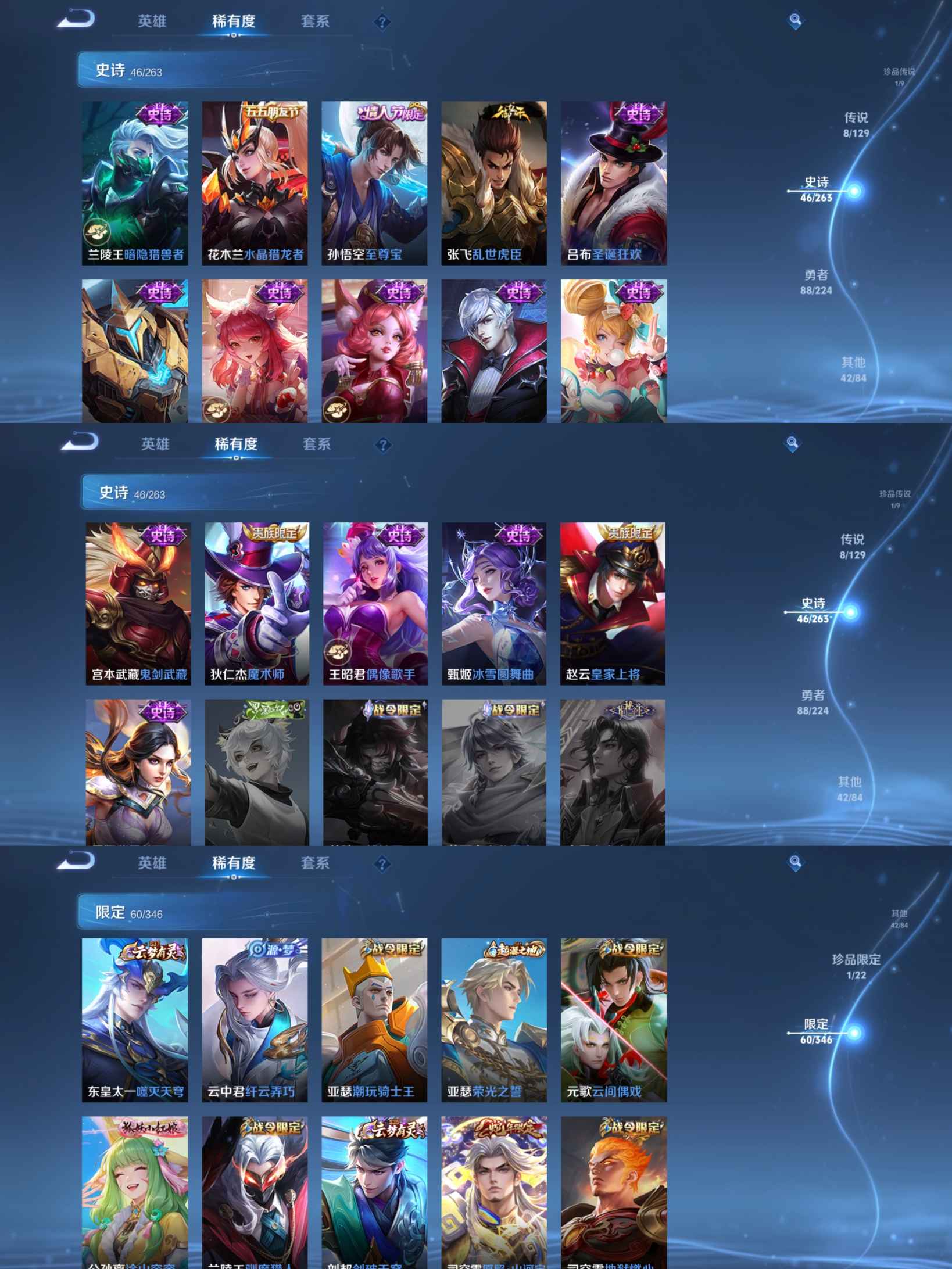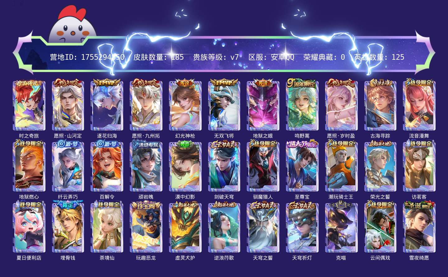 贵族等级:v7皮肤数:185传说品质8 生肖限定3 情人节限定1 珍品传说1 英雄数:125
