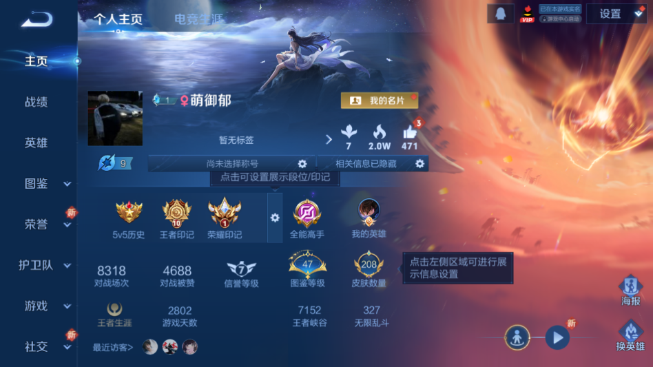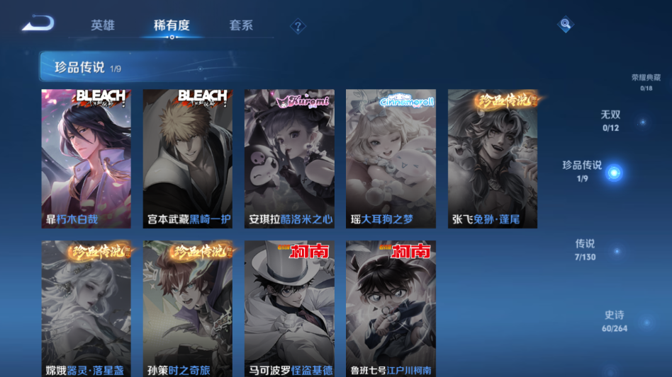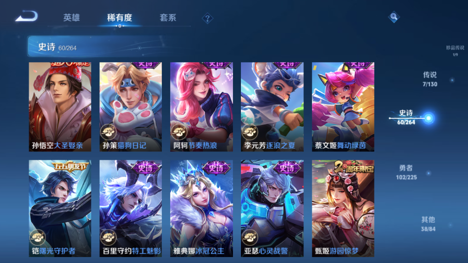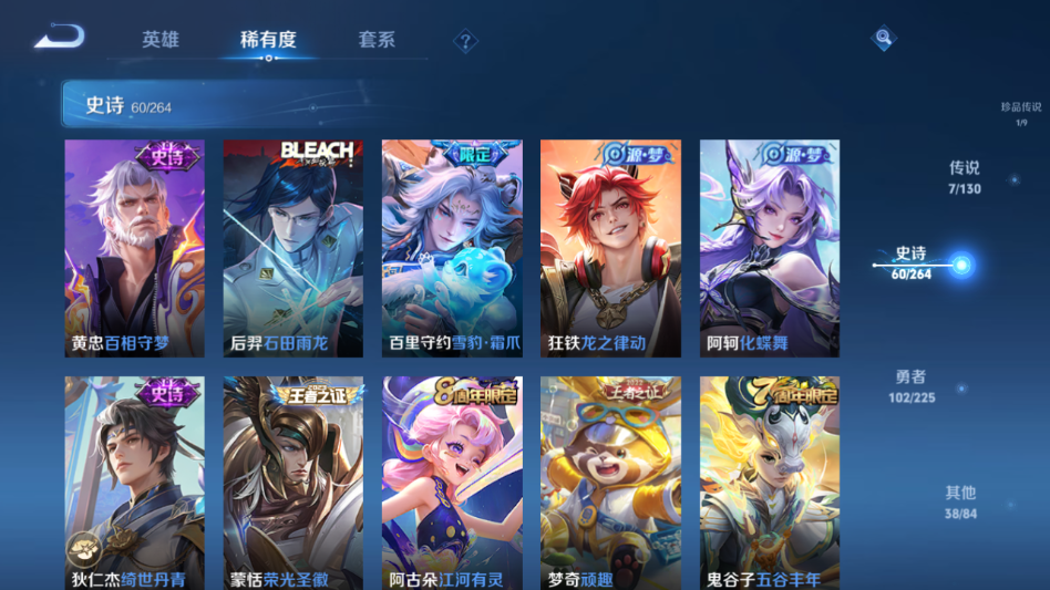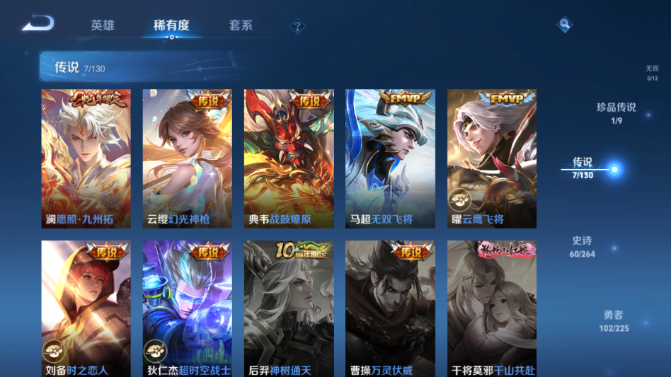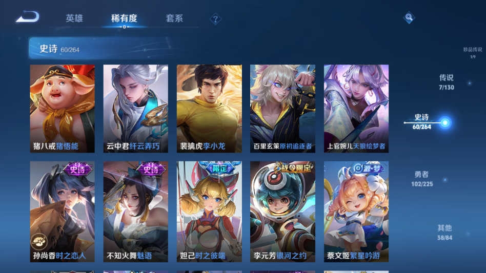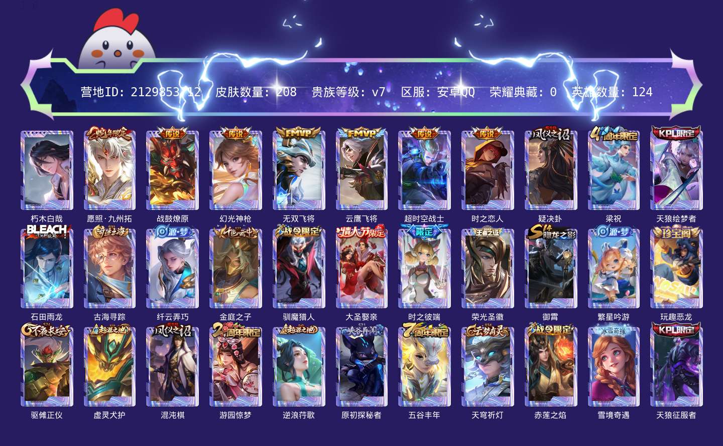 贵族等级:v7皮肤数:208传说品质7 生肖限定1 情人节限定1 珍品传说1 英雄数:124