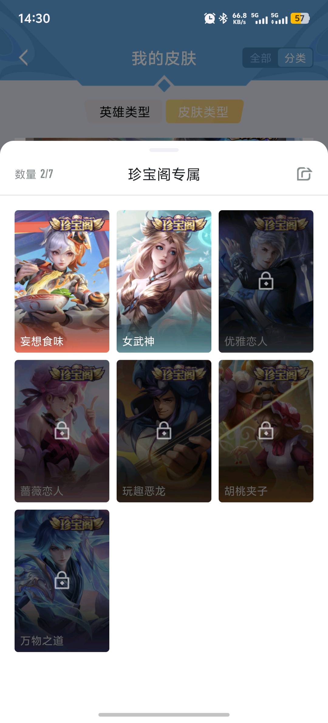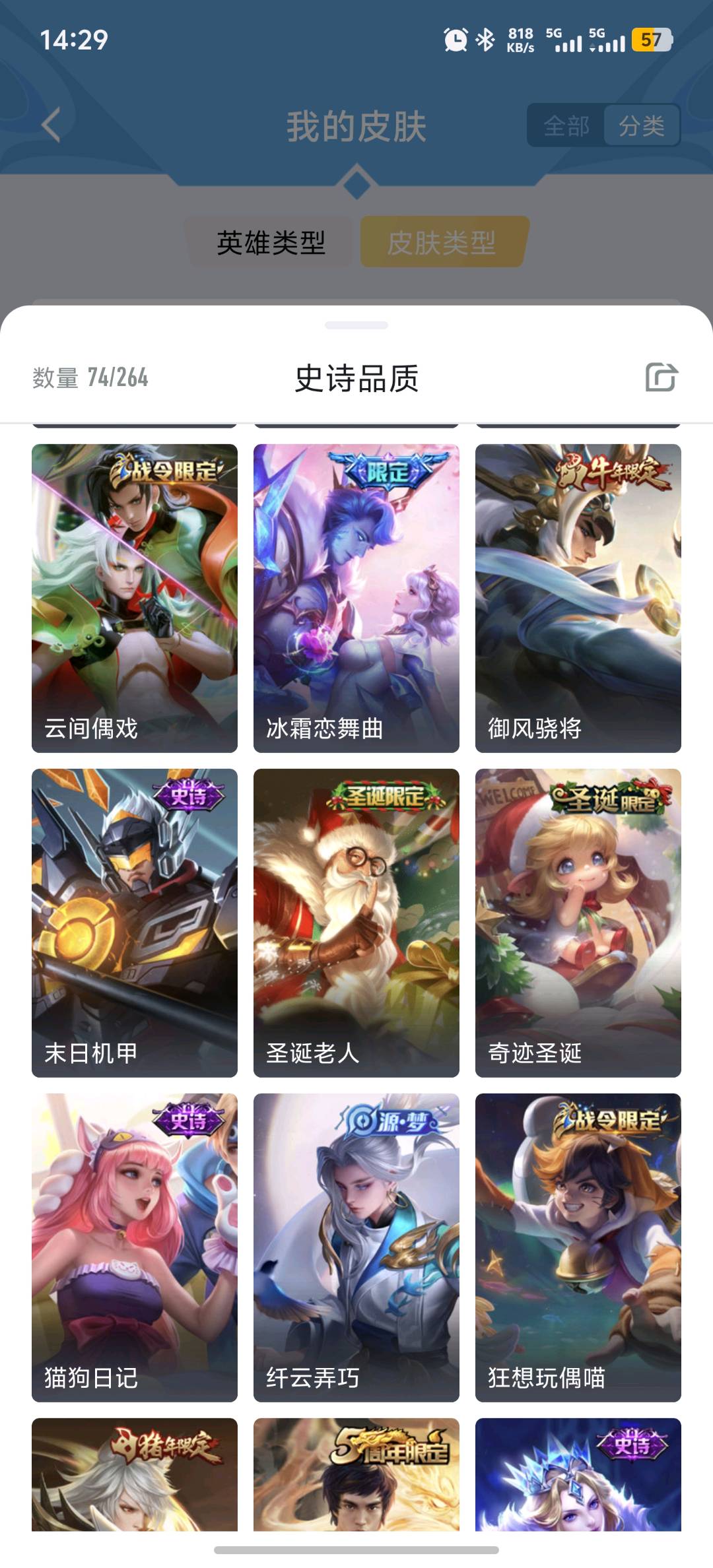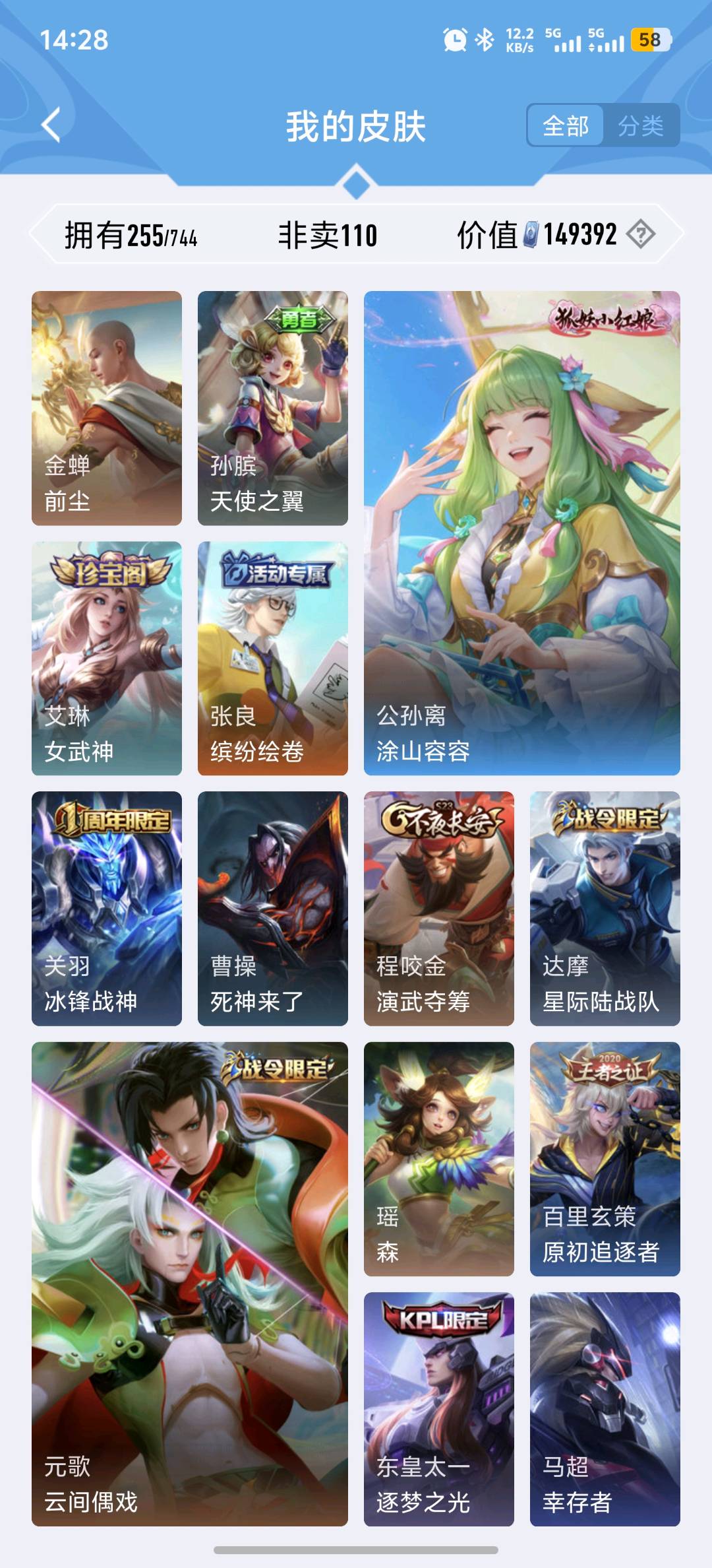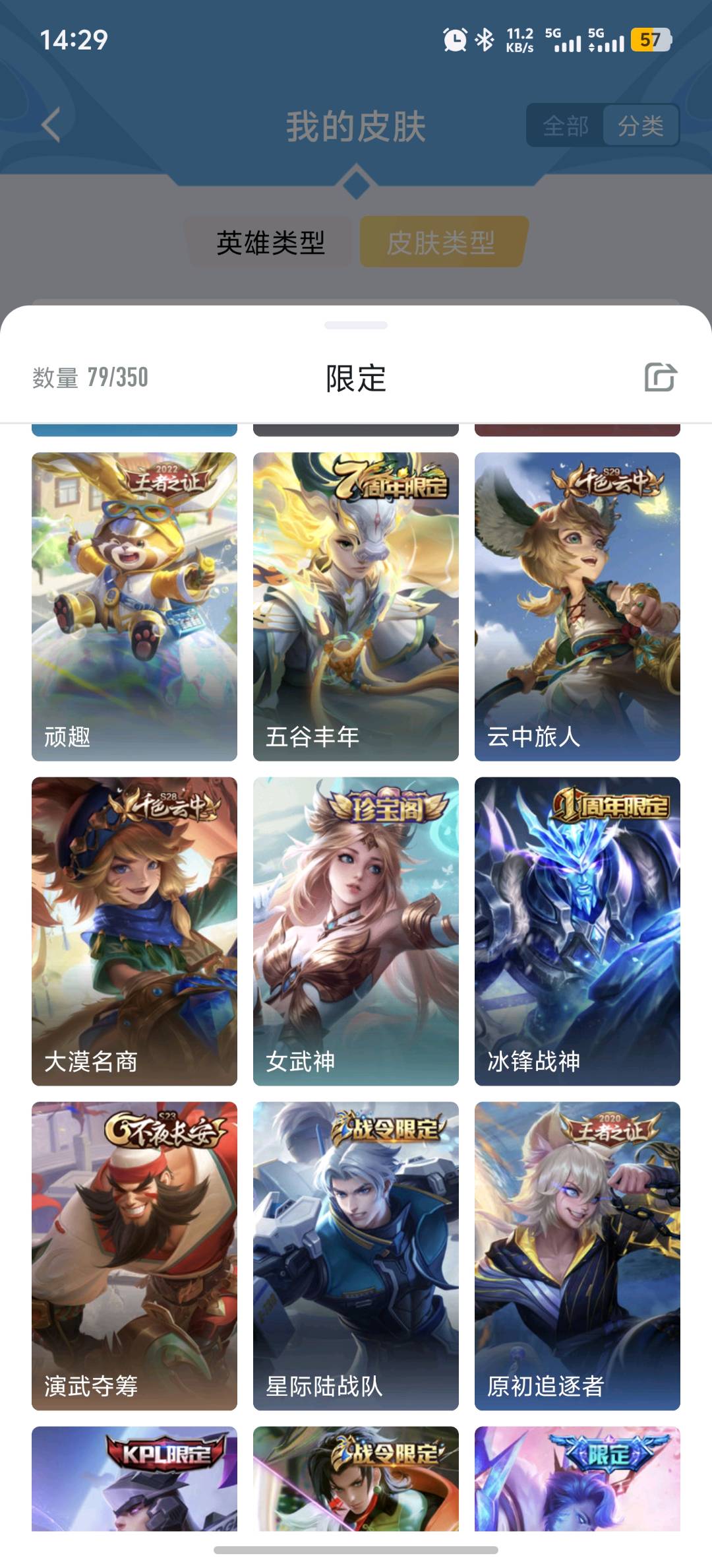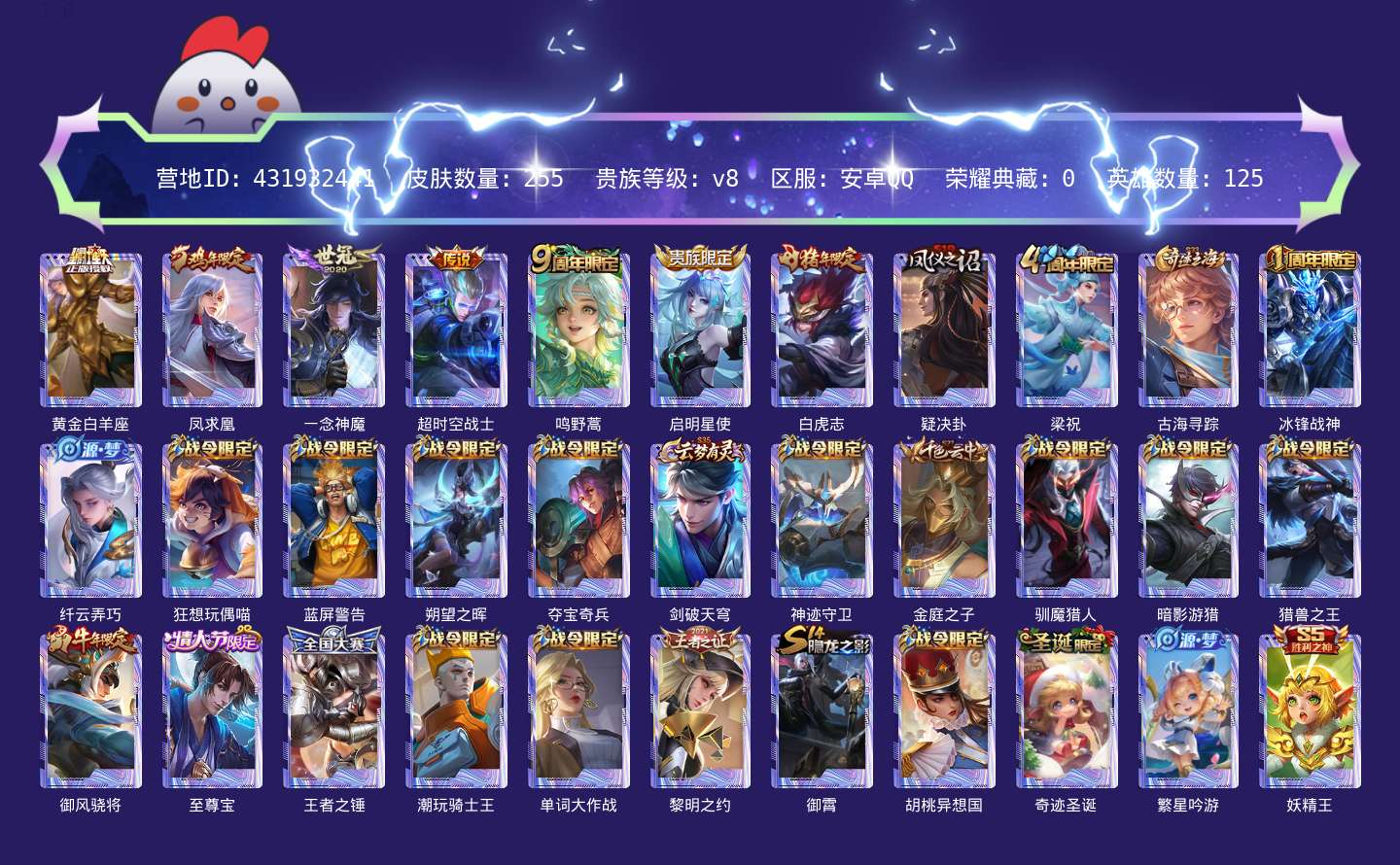 贵族等级:v8皮肤数:255传说品质7 生肖限定4 情人节限定1 英雄数:125