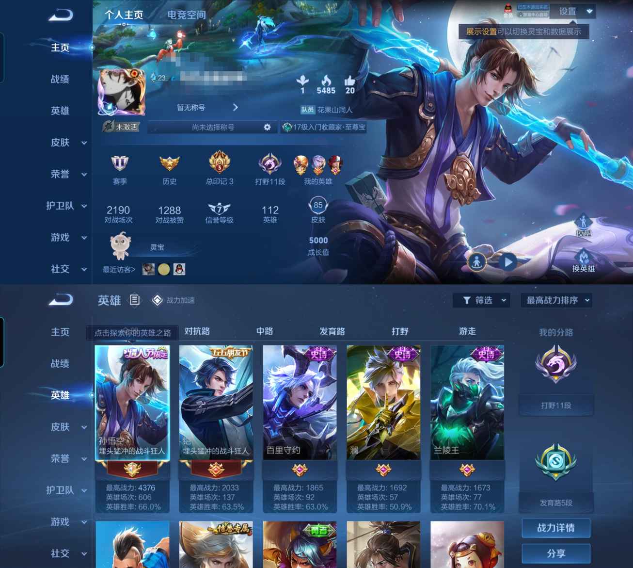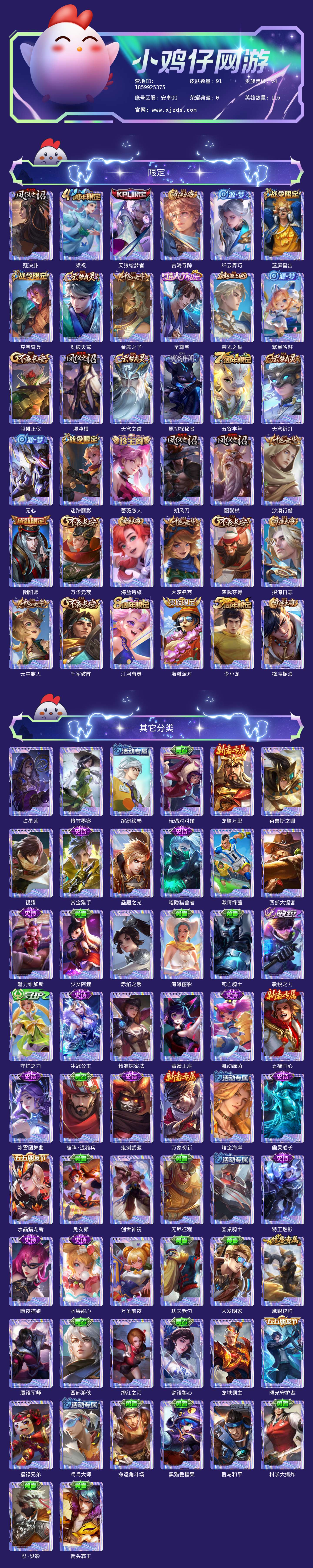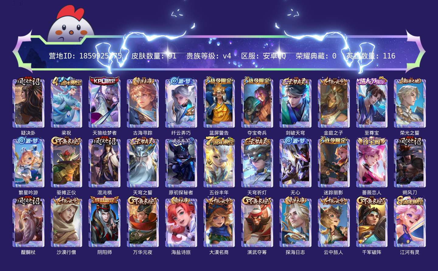 贵族等级:v4皮肤数:92情人节限定1 英雄数:116