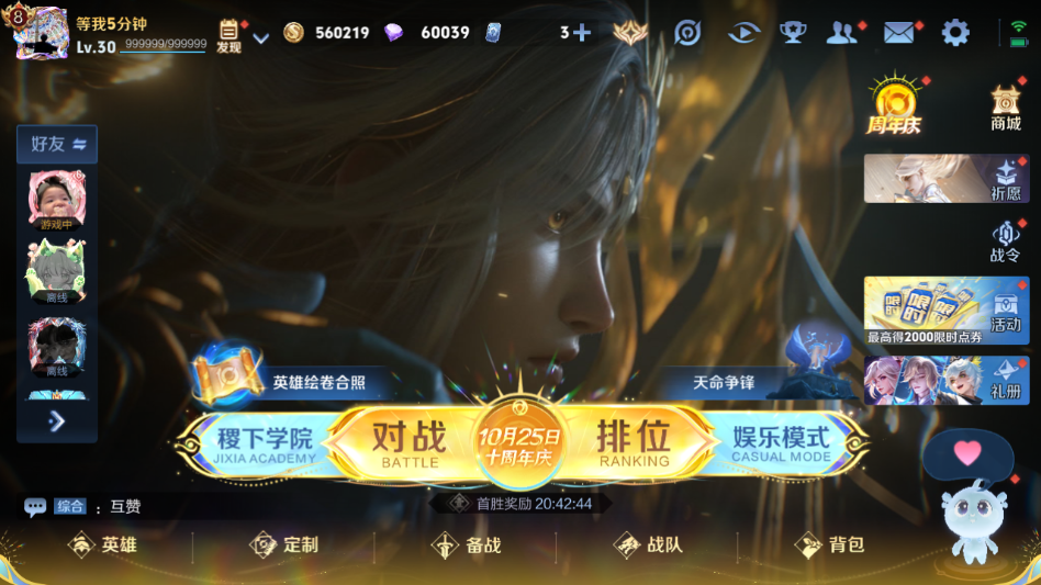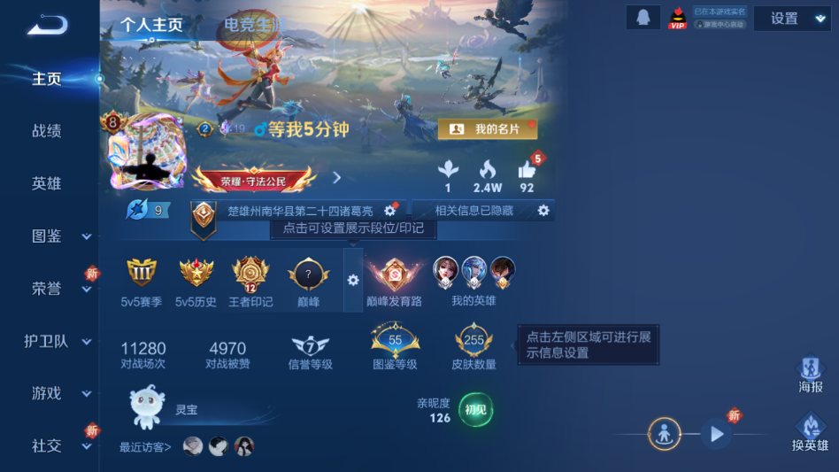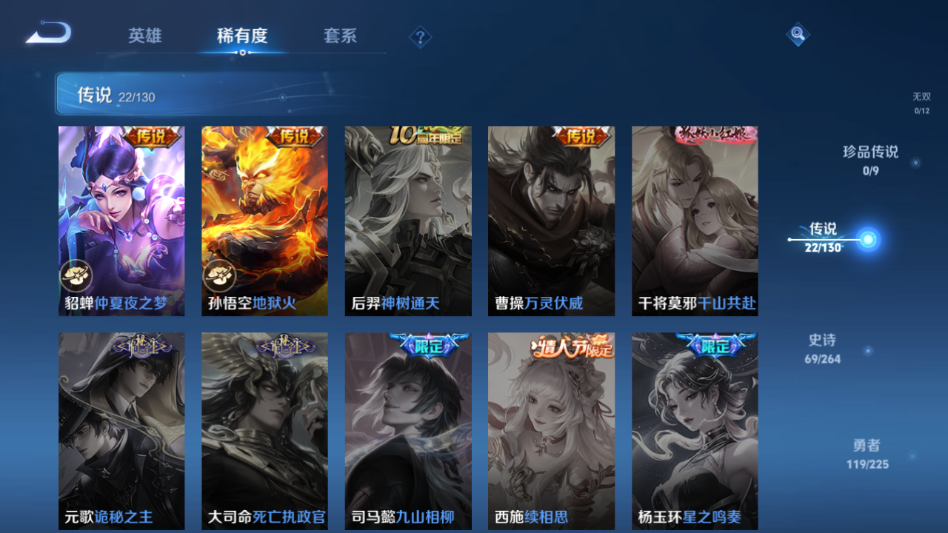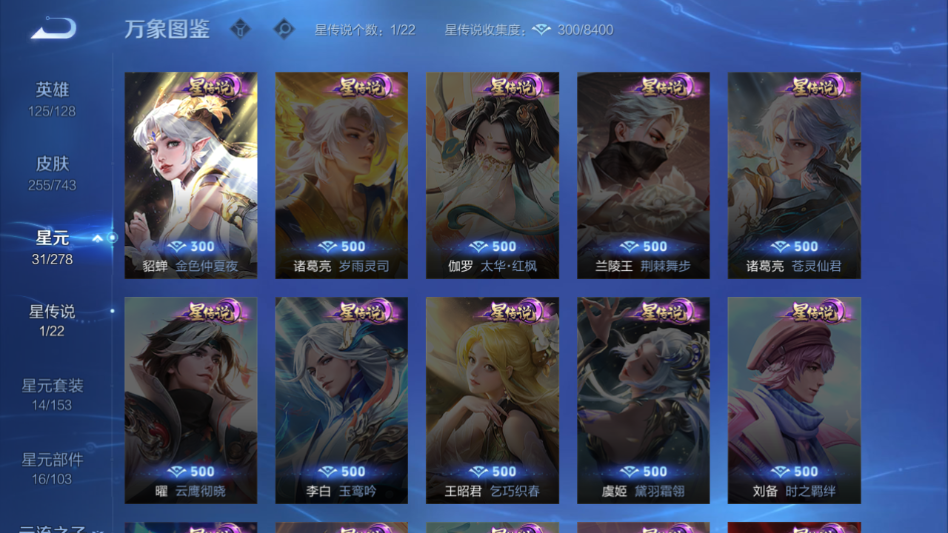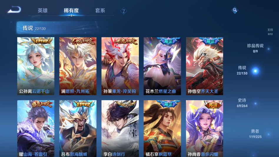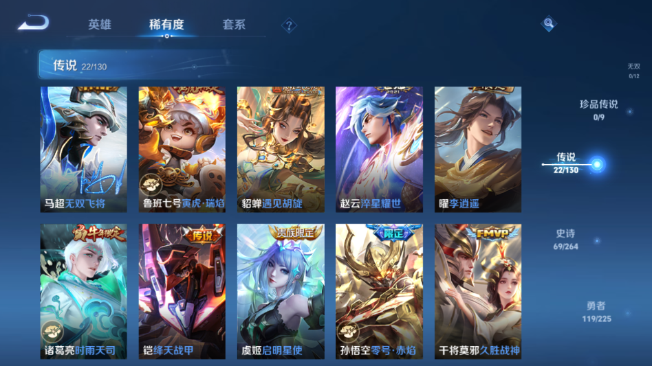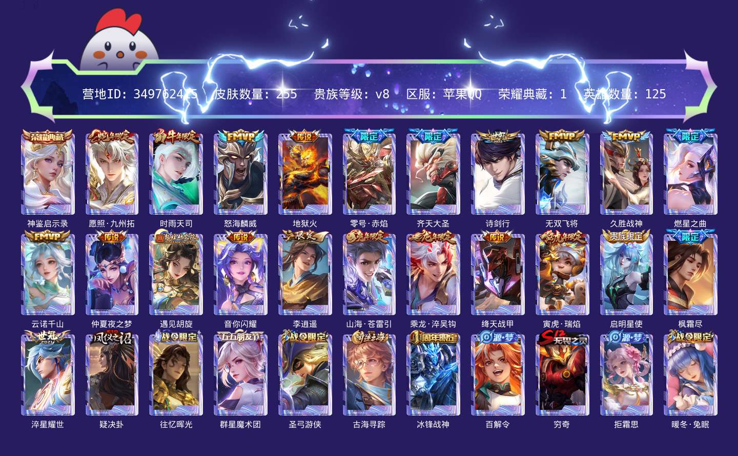 贵族等级:v8皮肤数:255传说品质22 生肖限定6 情人节限定2 荣耀典藏1 英雄数:125