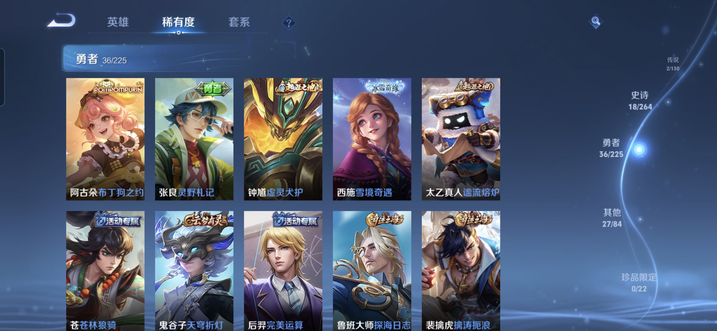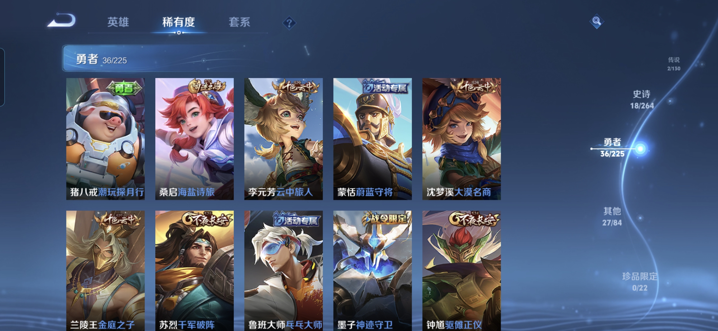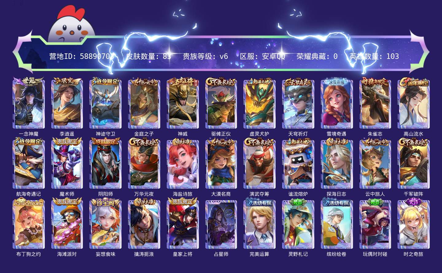 贵族等级:v6皮肤数:83生肖限定1 传说品质2 英雄数:103