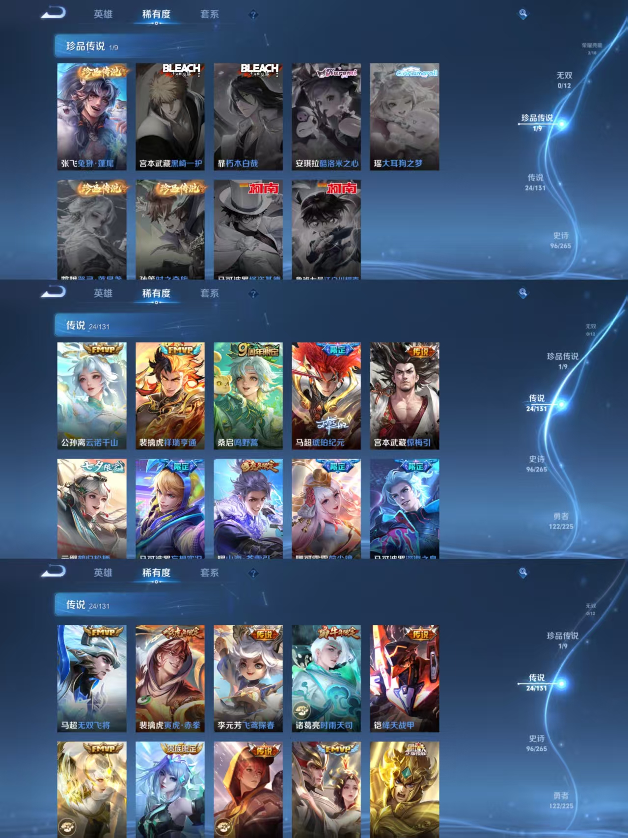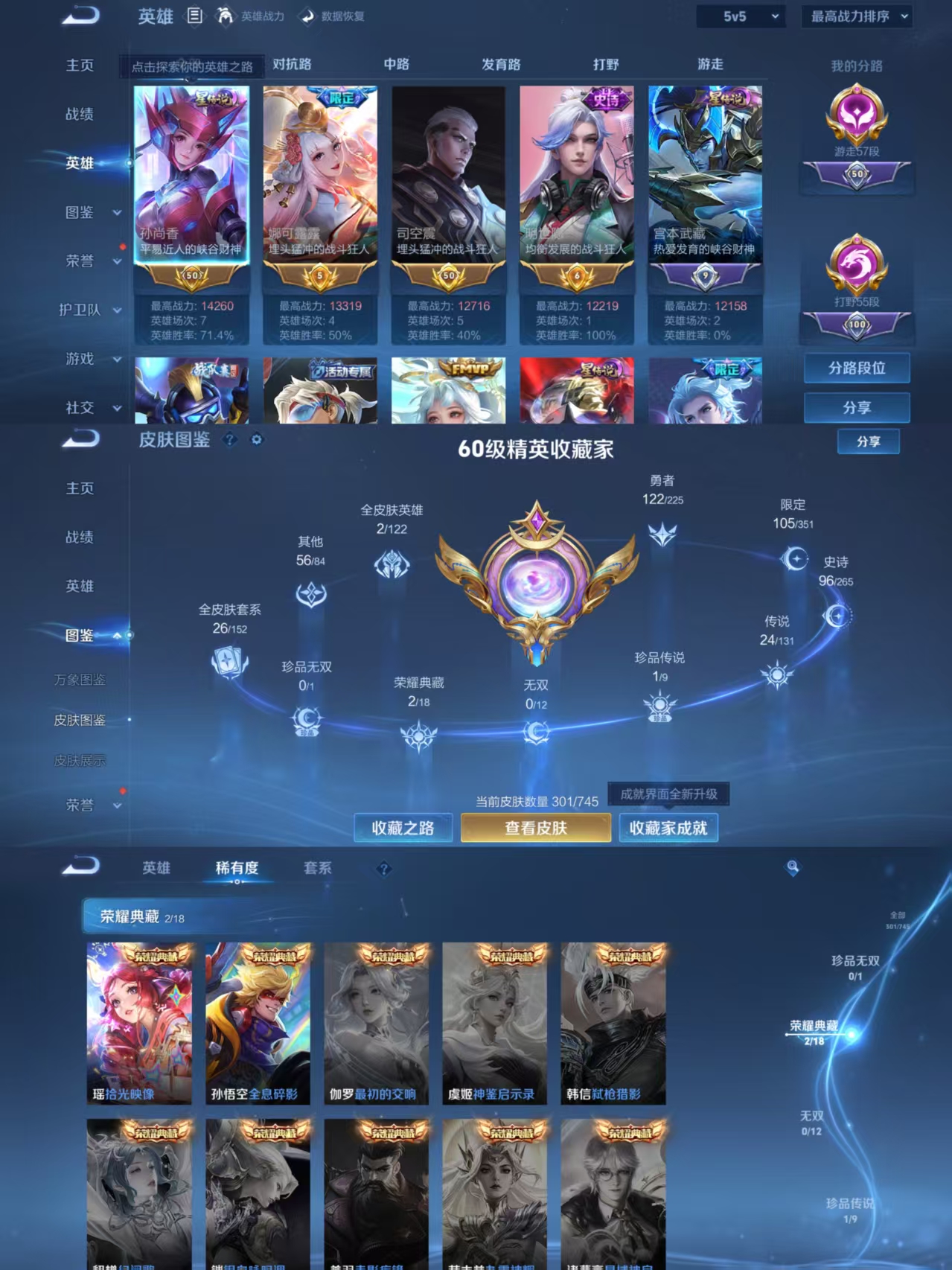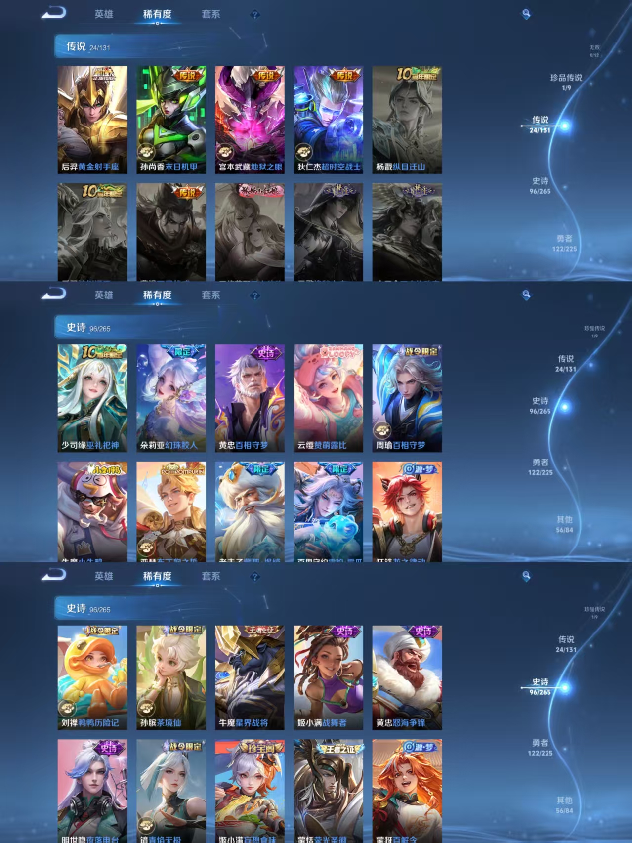贵族等级:v8皮肤数:301传说品质24 情人节限定2 生肖限定4 荣耀典藏2 珍品传说1 英雄数:127