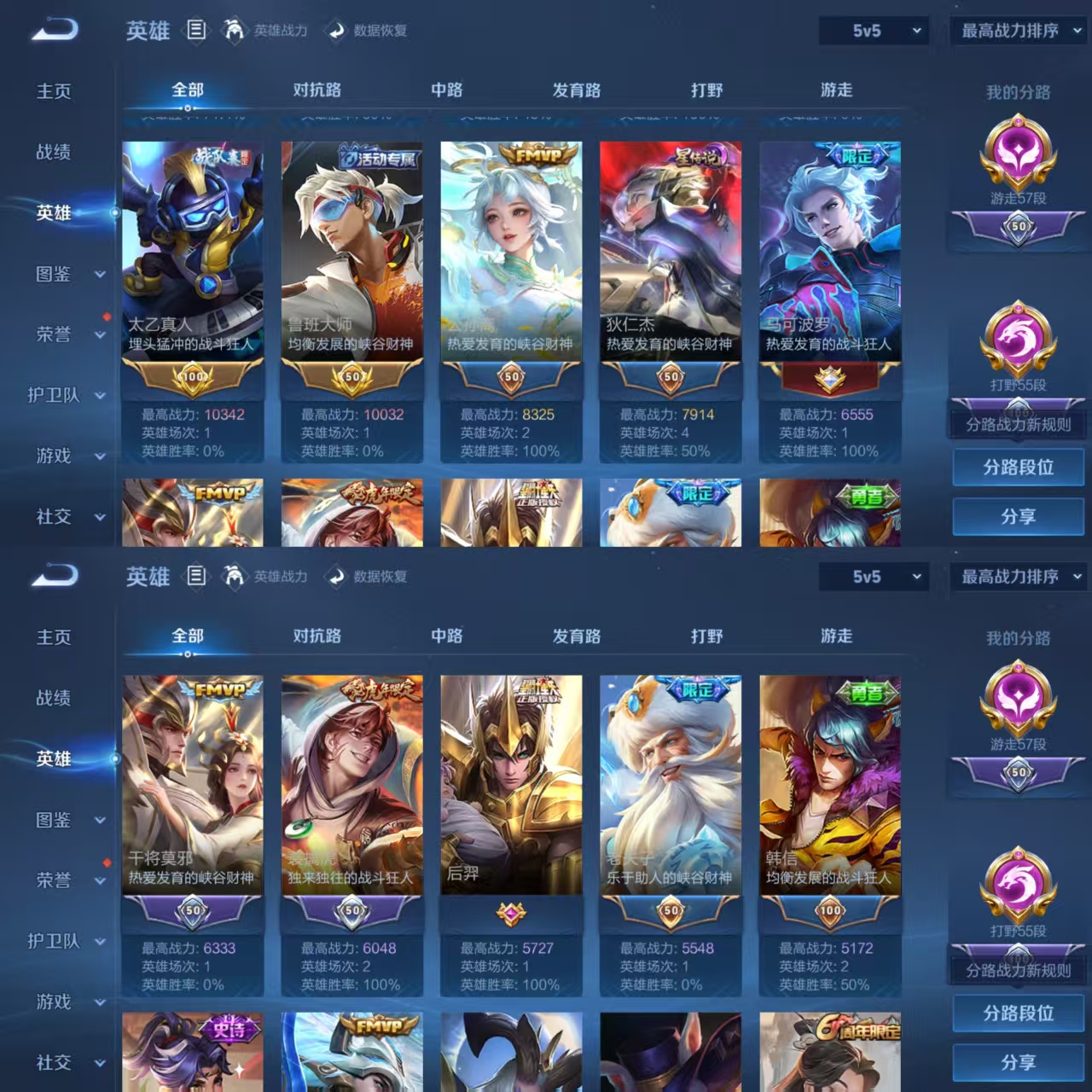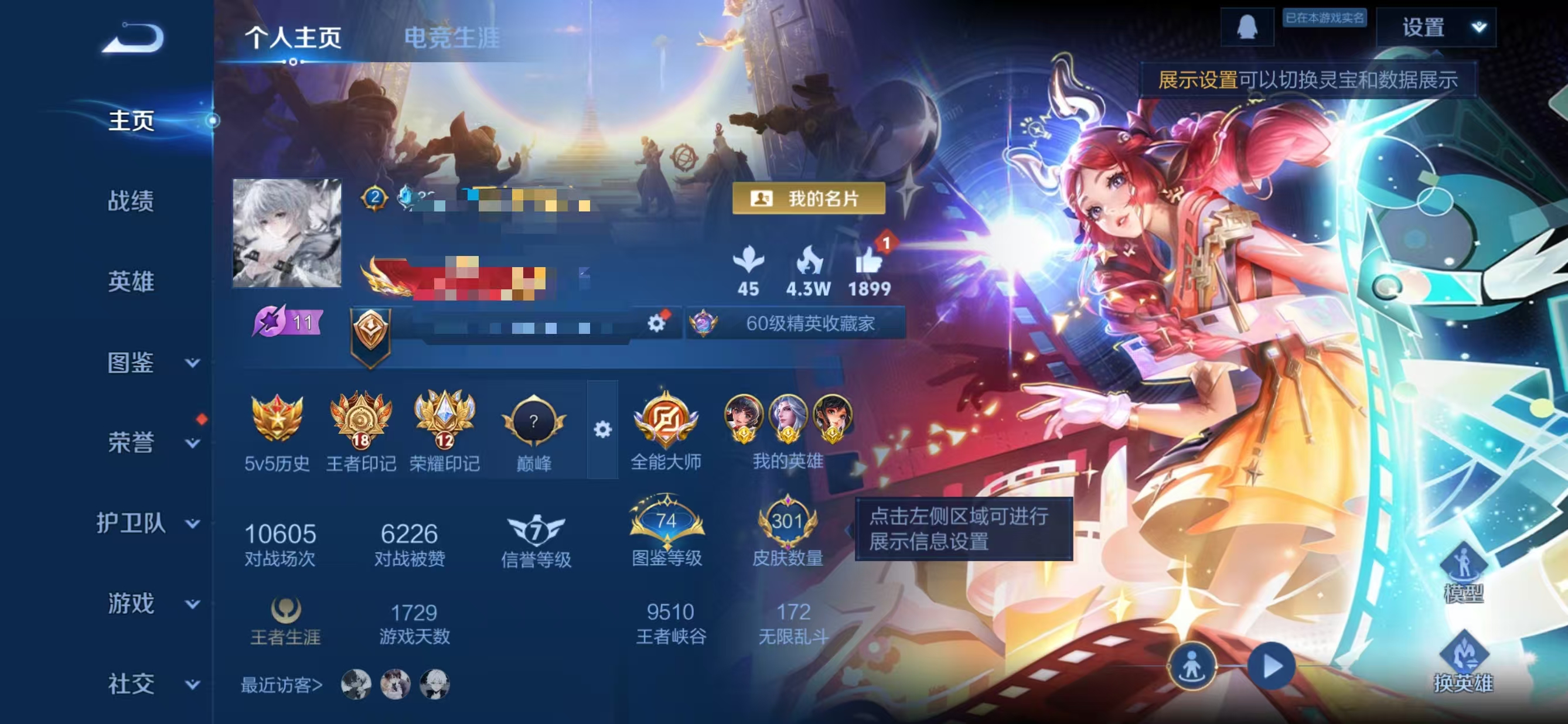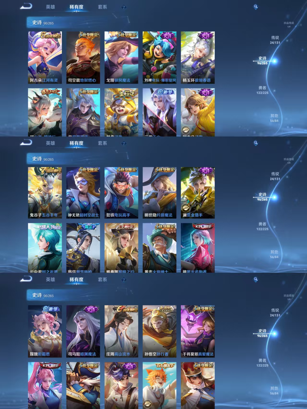 贵族等级:v8皮肤数:301传说品质24 情人节限定2 生肖限定4 荣耀典藏2 珍品传说1 英雄数:127