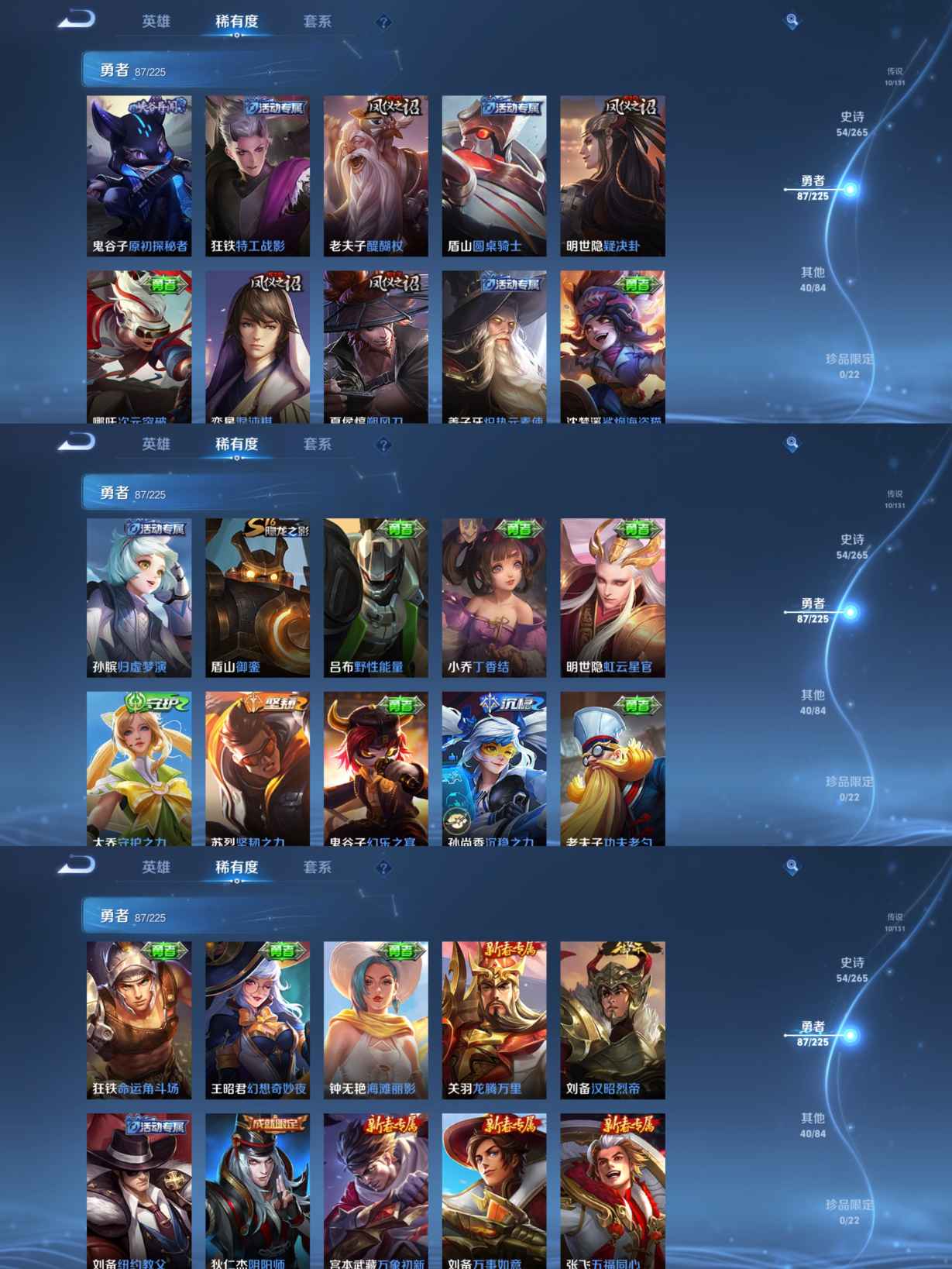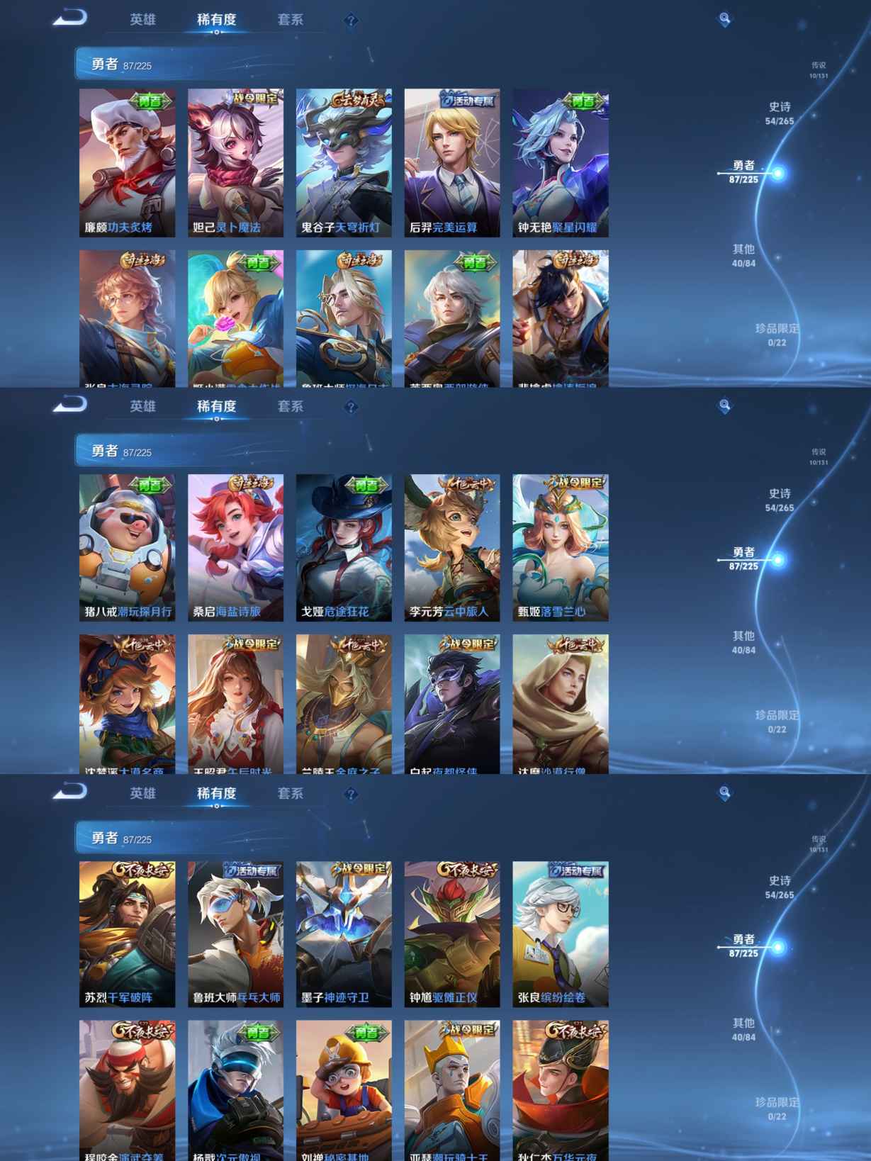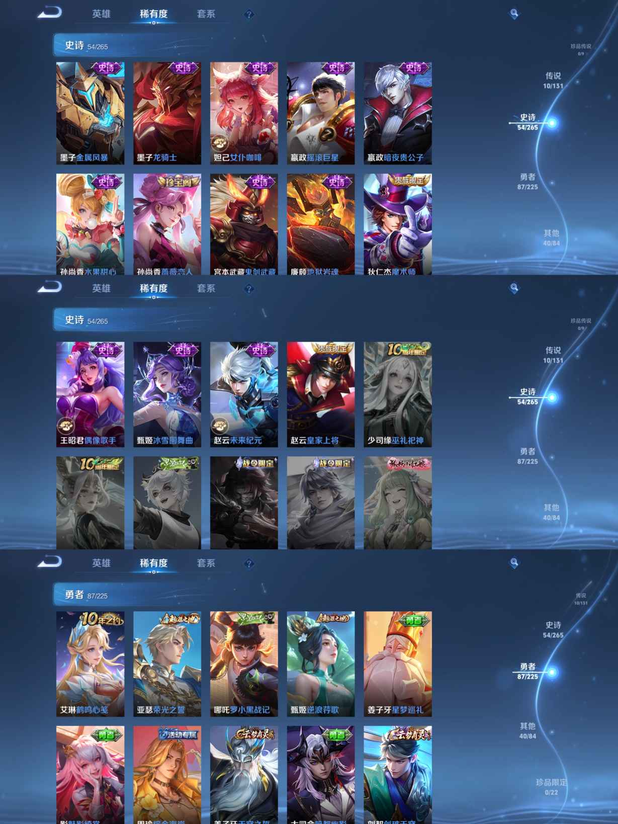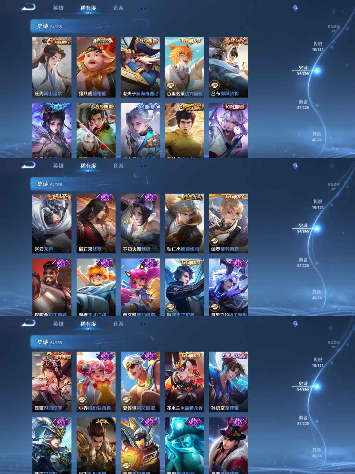 贵族等级:v7皮肤数:193传说品质10 生肖限定3 情人节限定1 荣耀典藏1 英雄数:126