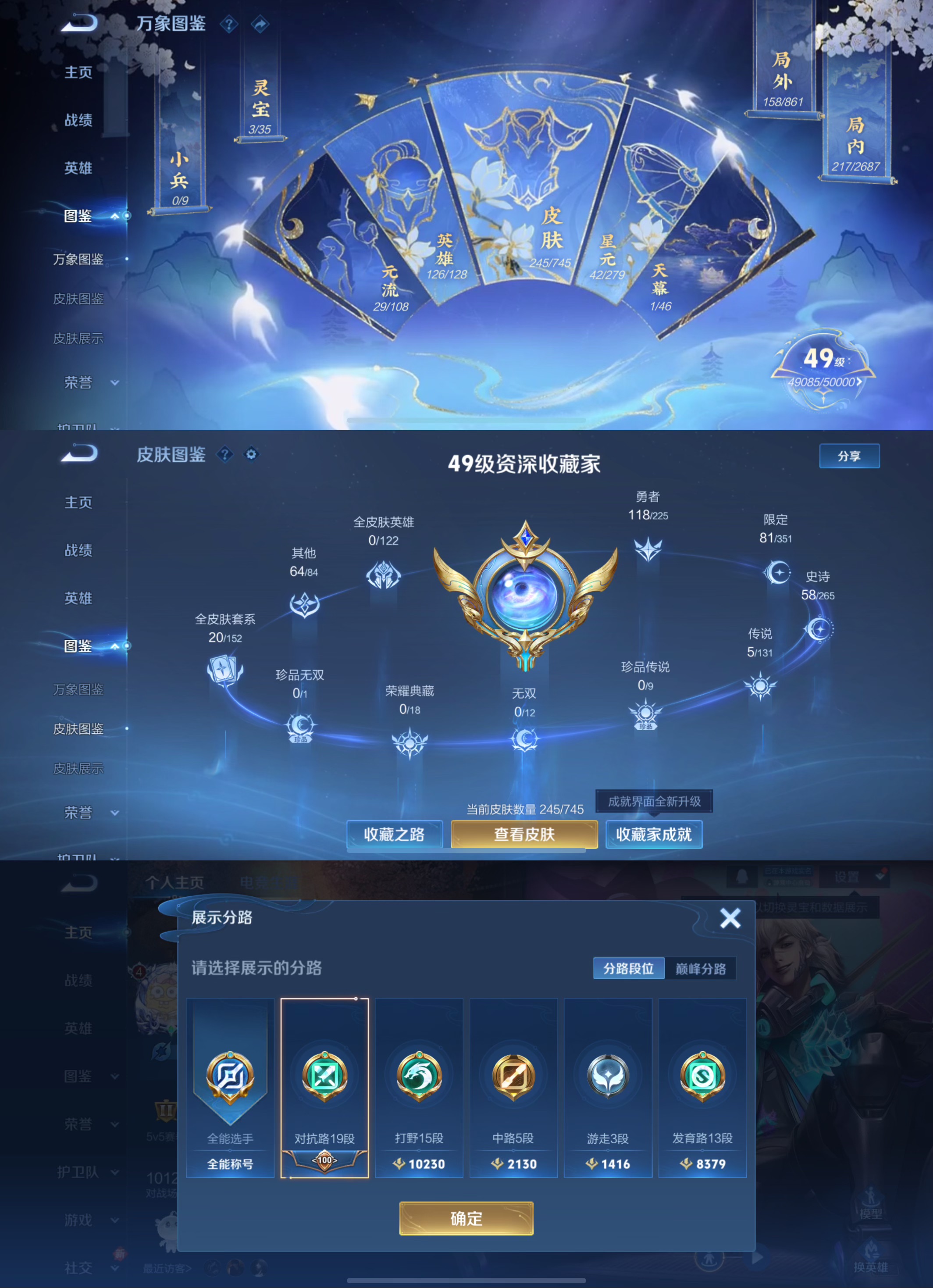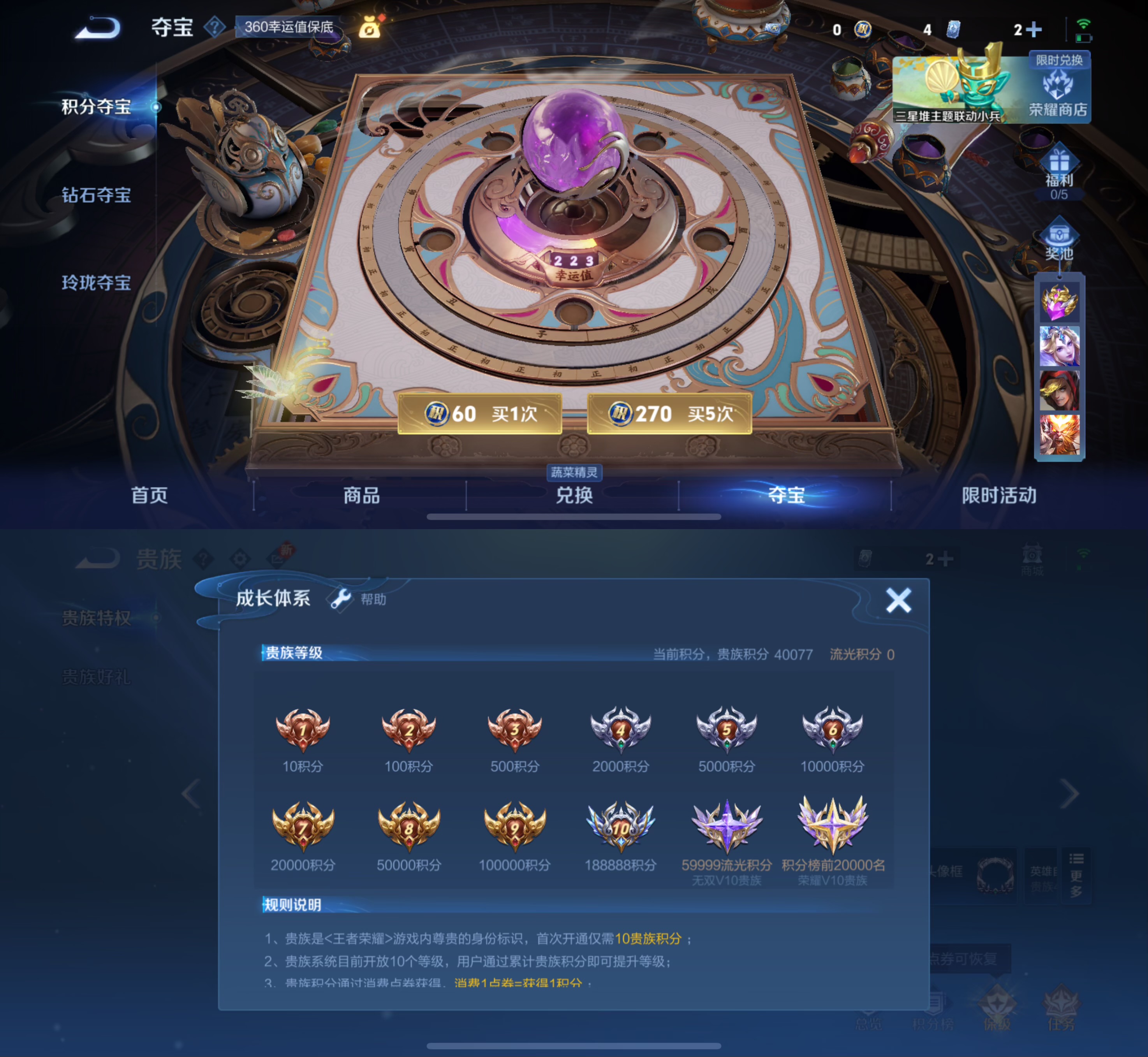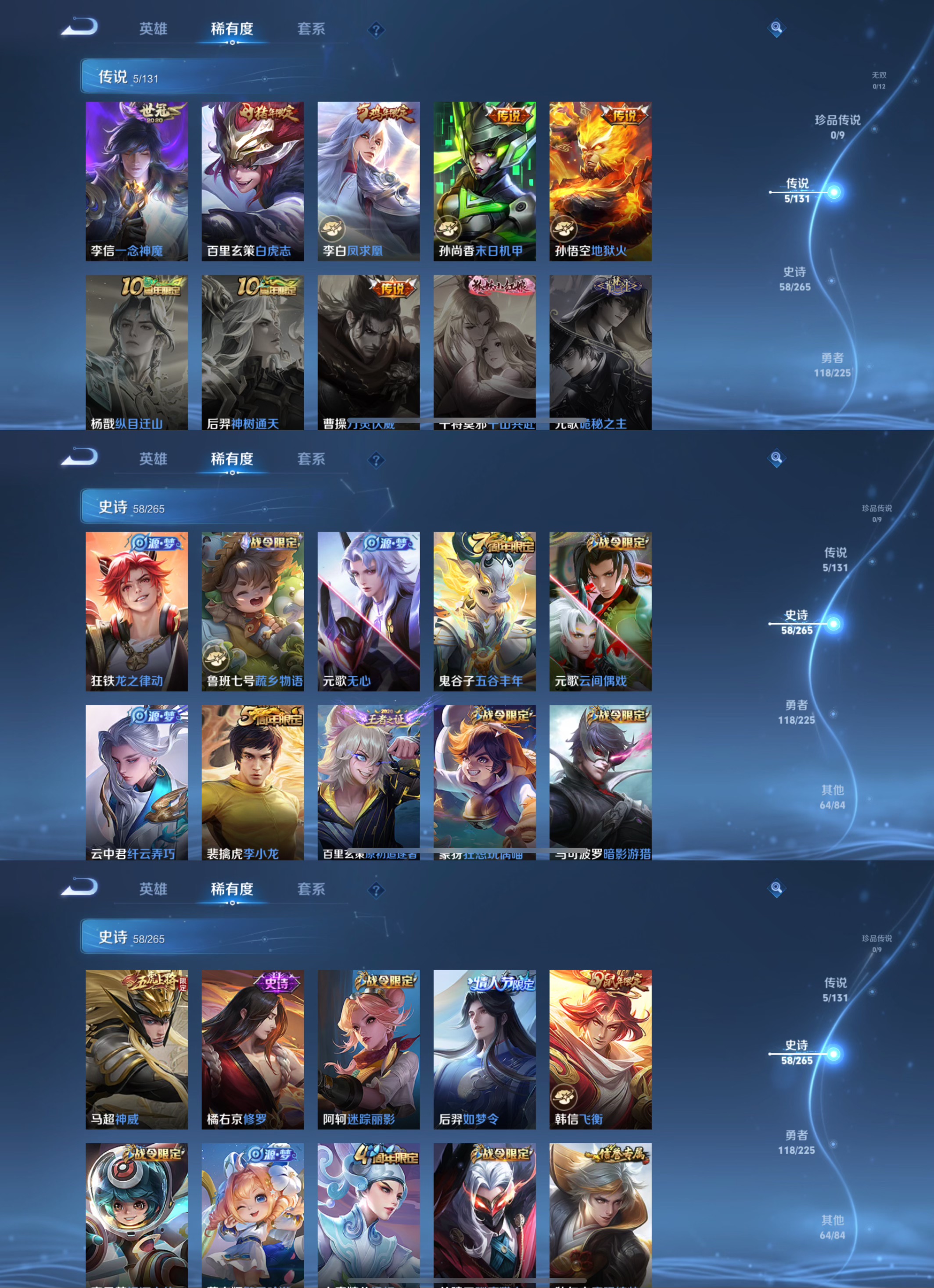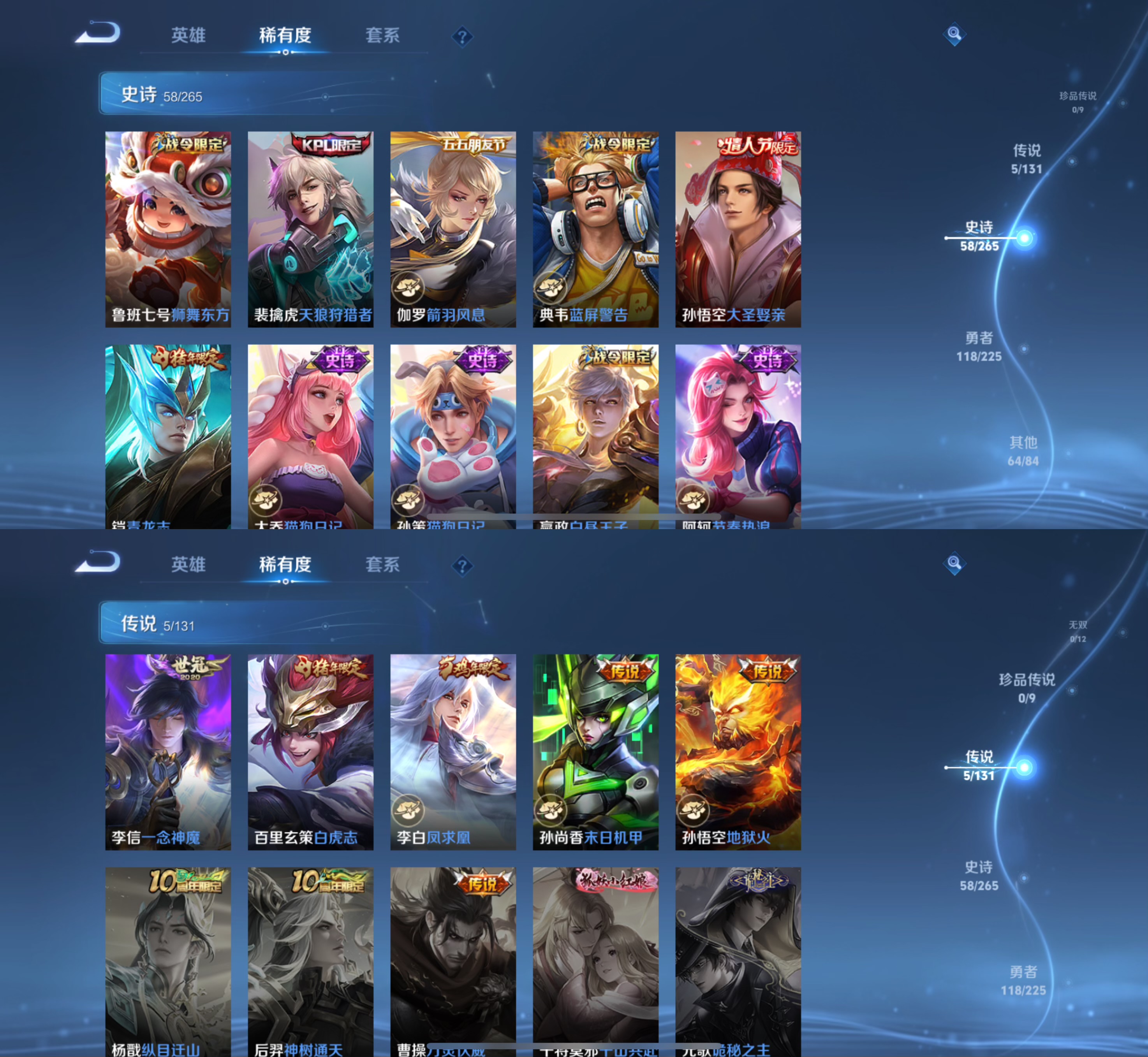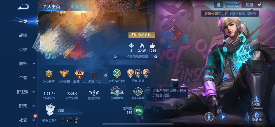 贵族等级:v7皮肤数:246情人节限定3 传说品质5 生肖限定4 英雄数:126