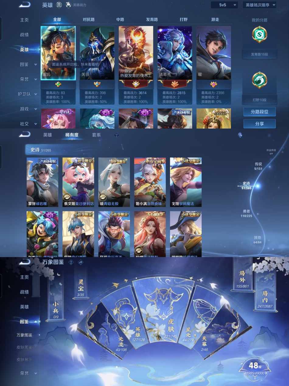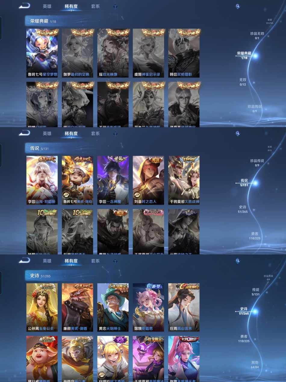 贵族等级:v7皮肤数:231生肖限定5 情人节限定1 传说品质5 荣耀典藏1 英雄数:127