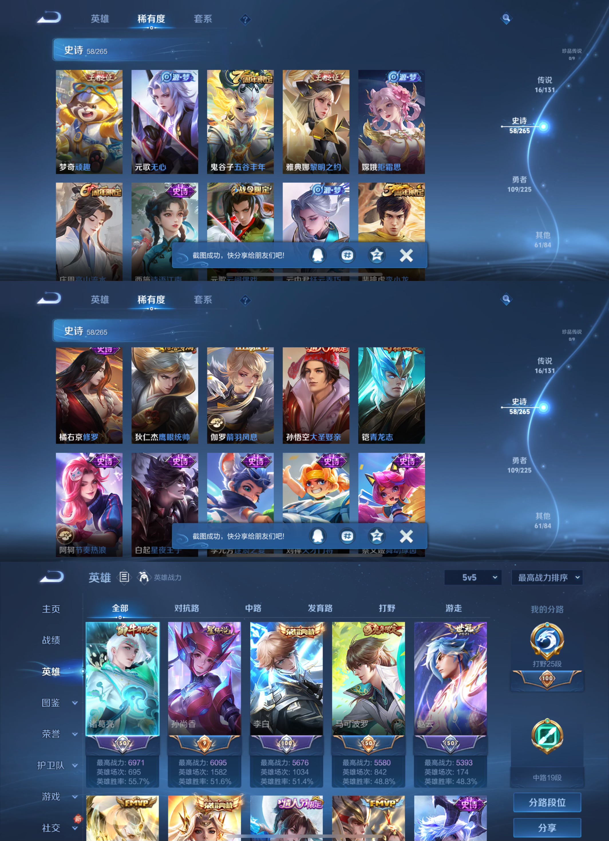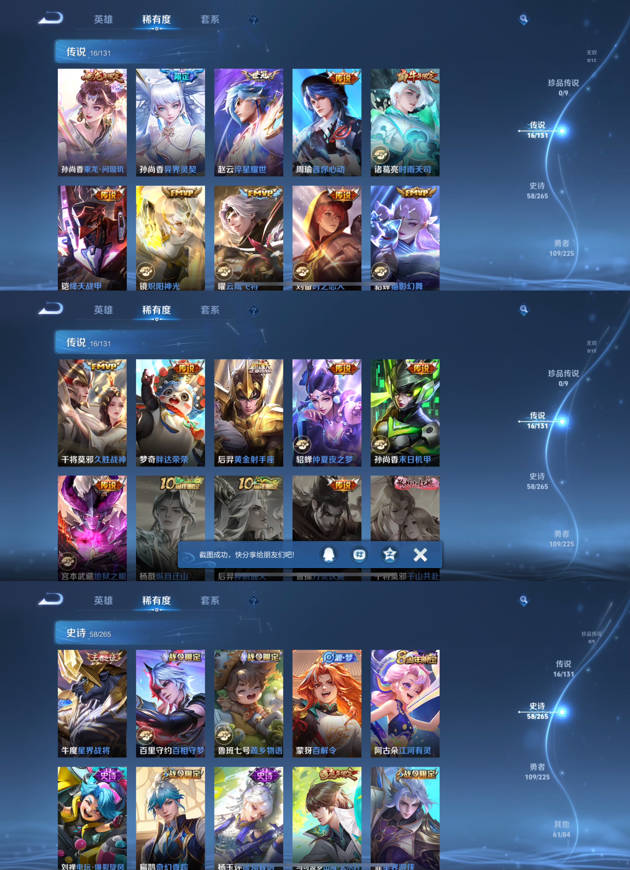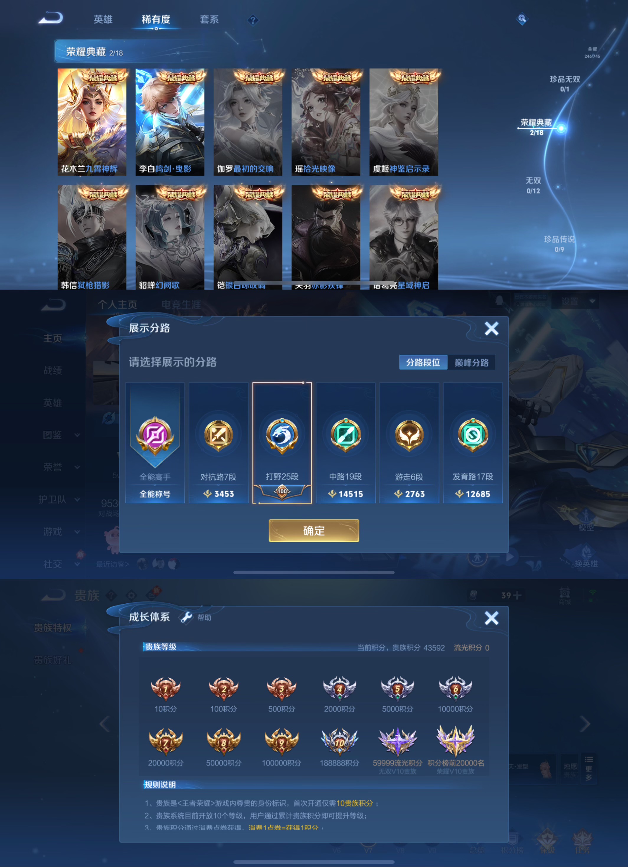 贵族等级:v7皮肤数:246传说品质16 生肖限定4 情人节限定2 荣耀典藏2 英雄数:123