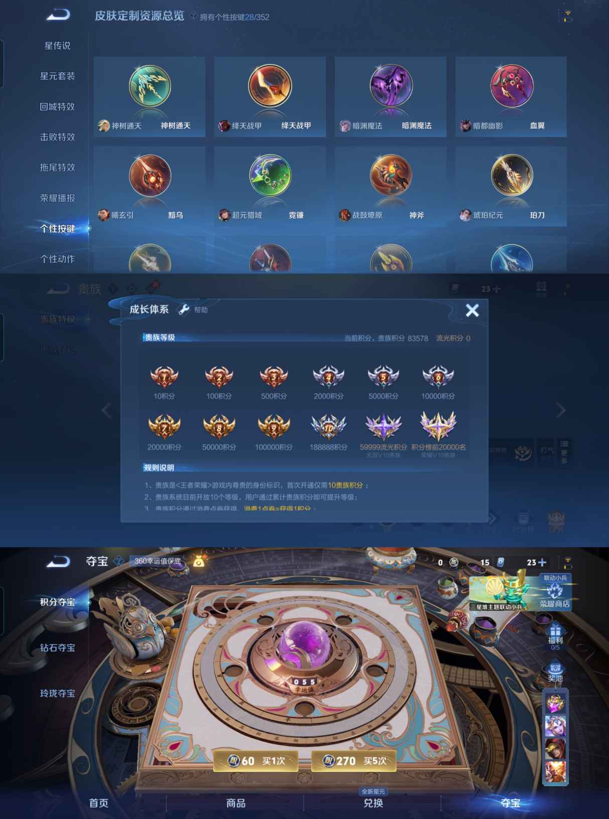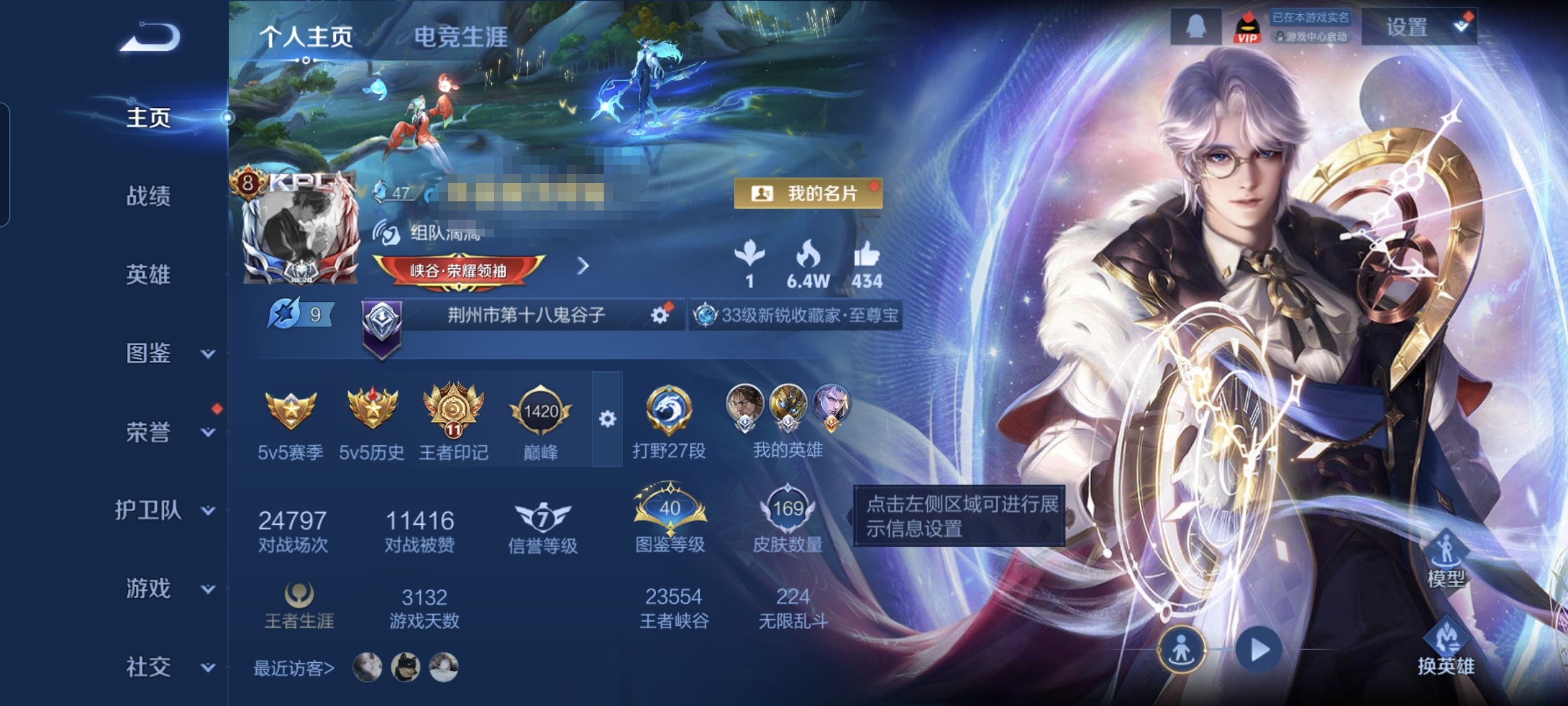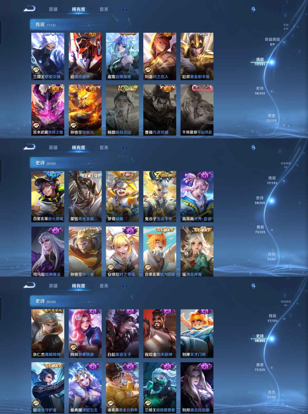 贵族等级:v8皮肤数:169传说品质17 荣耀典藏2 情人节限定3 英雄数:122