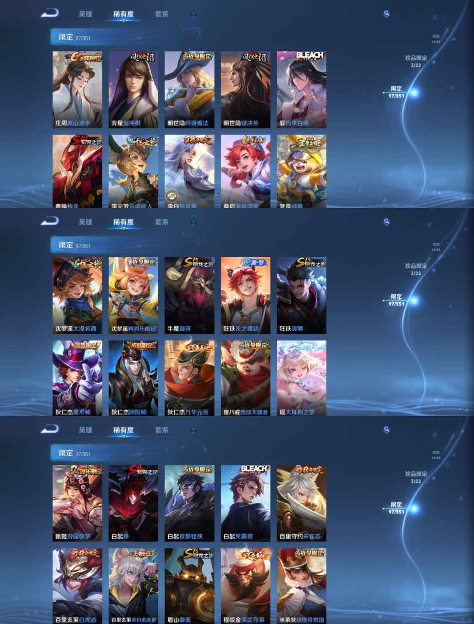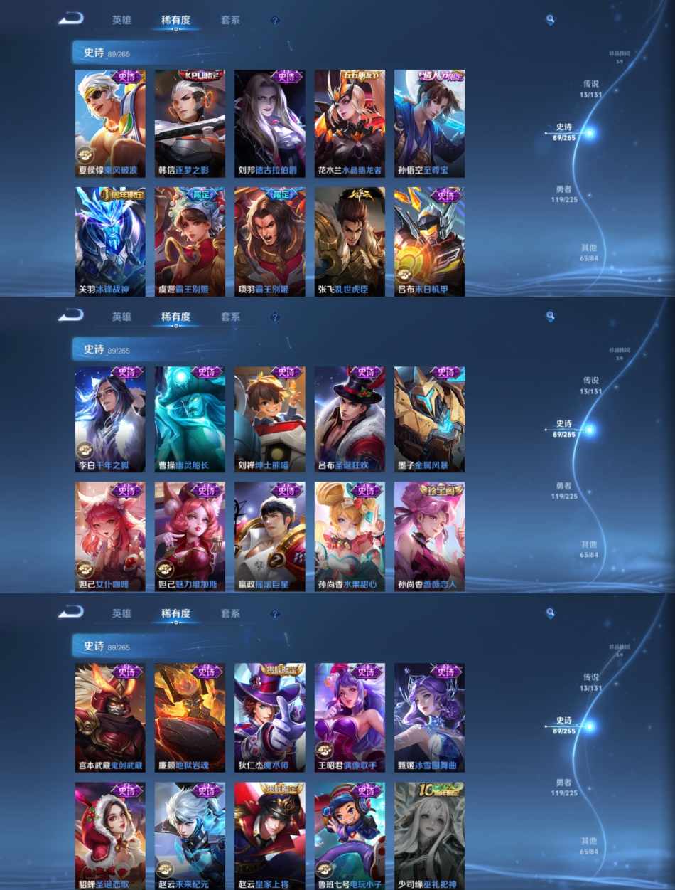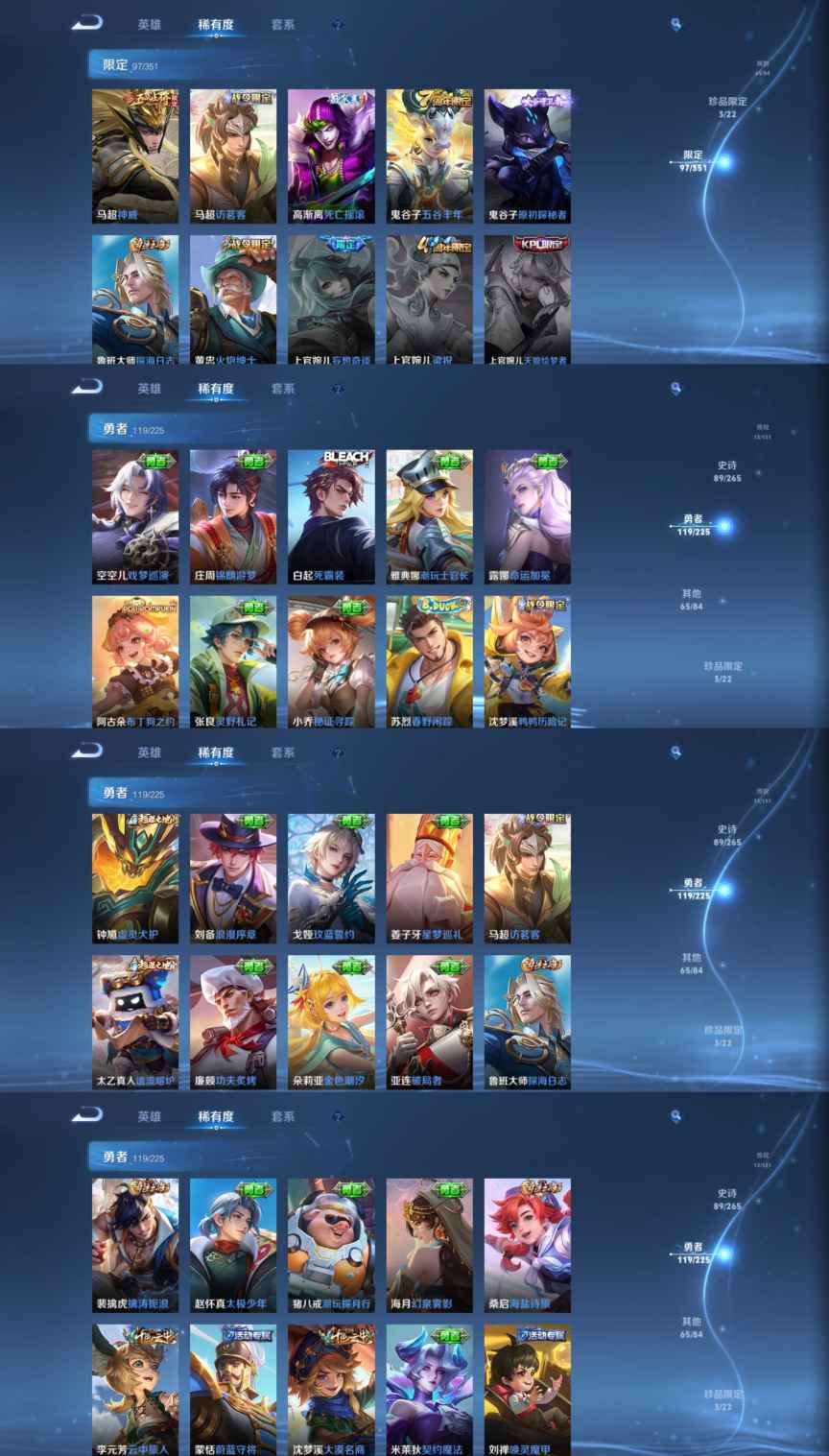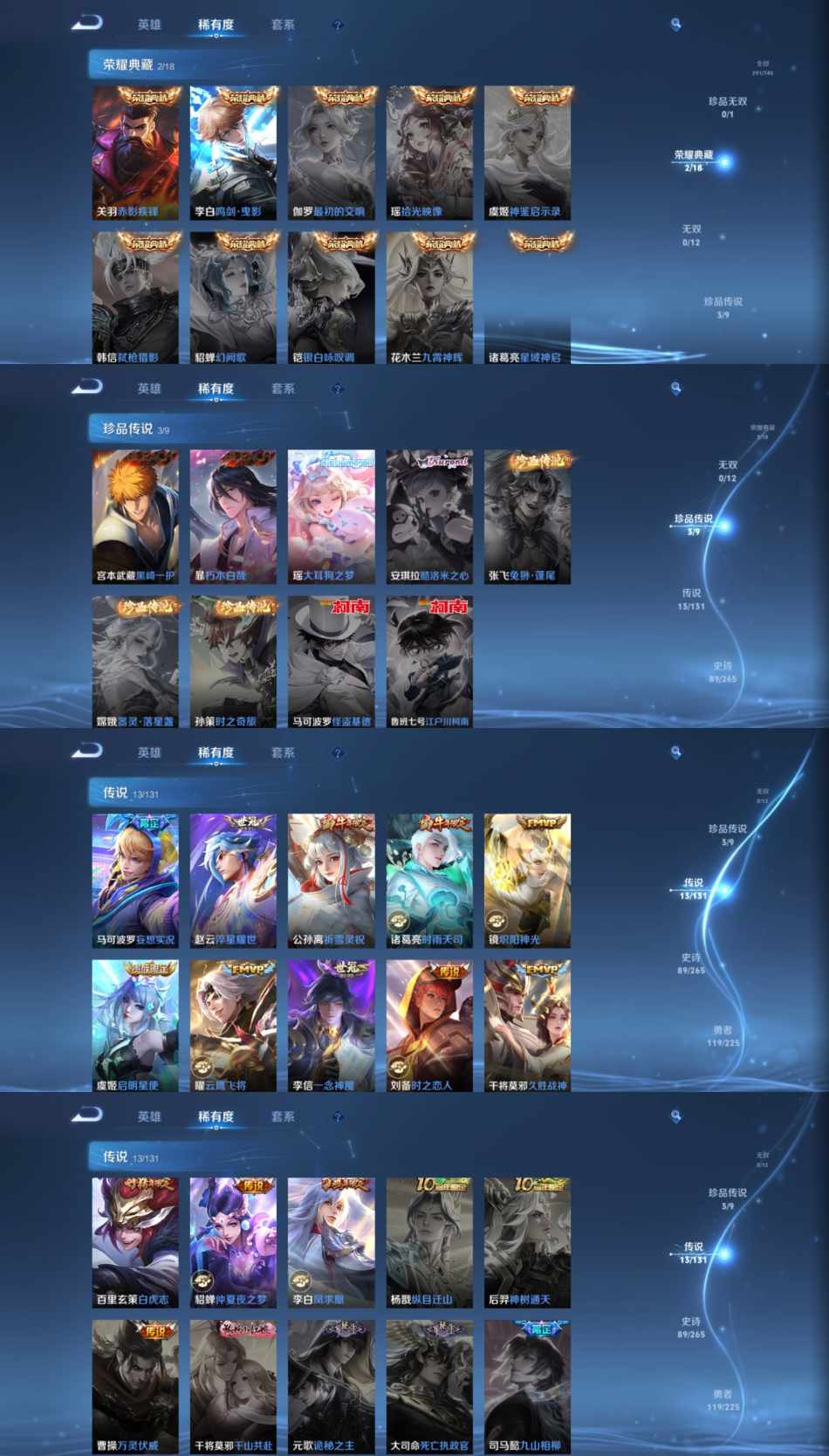 贵族等级:v8皮肤数:291生肖限定8 荣耀典藏2 传说品质13 情人节限定1 珍品传说3 英雄数:126