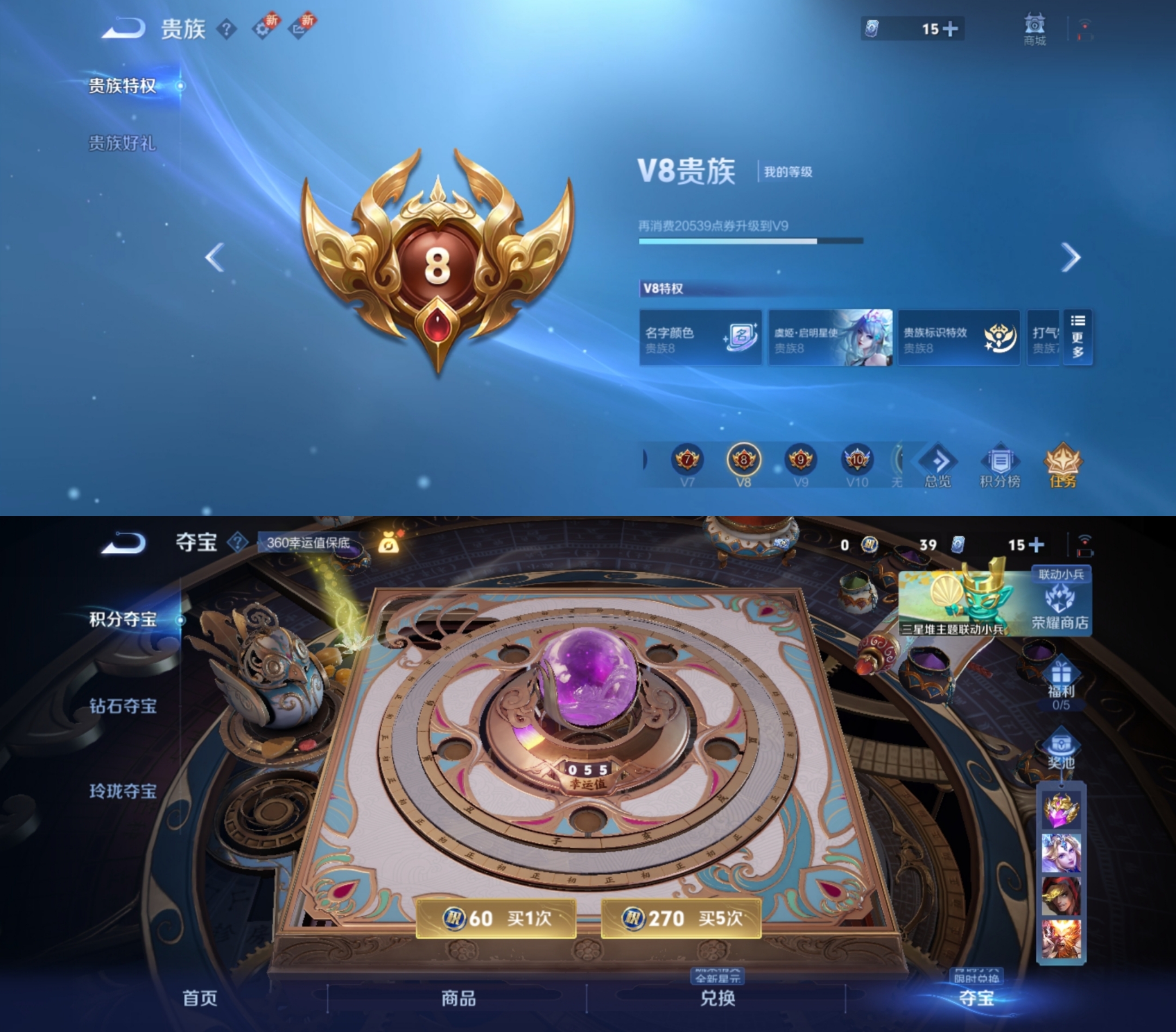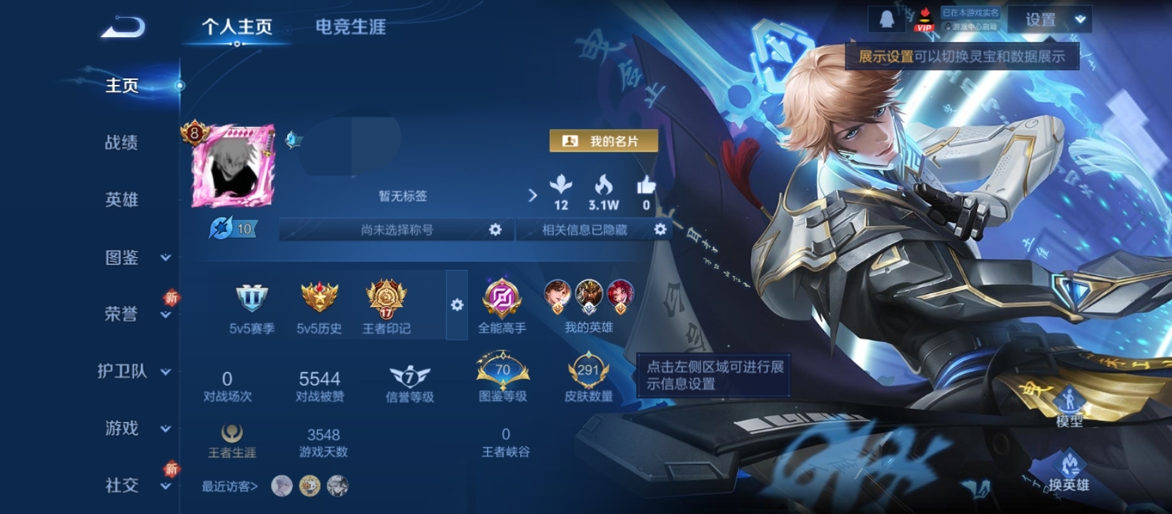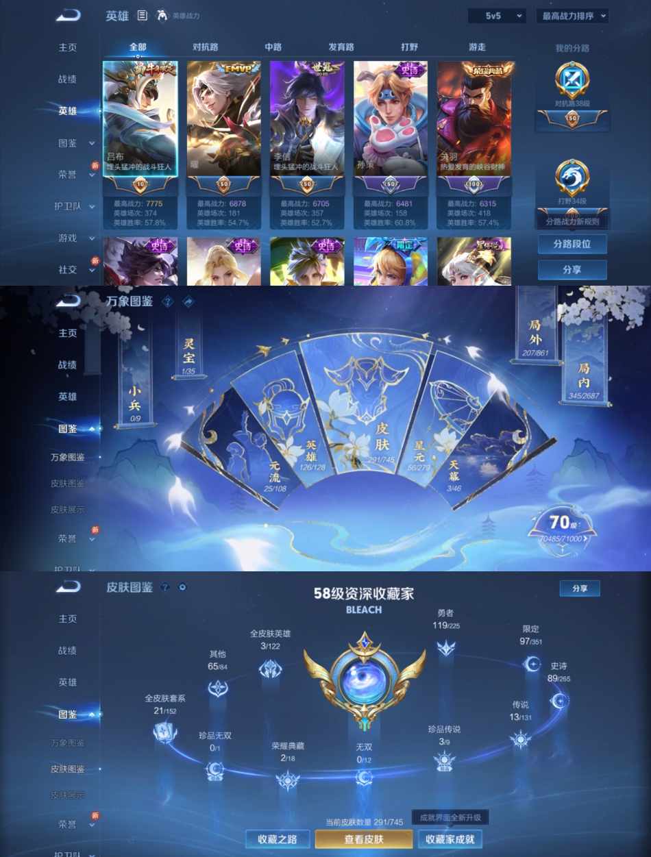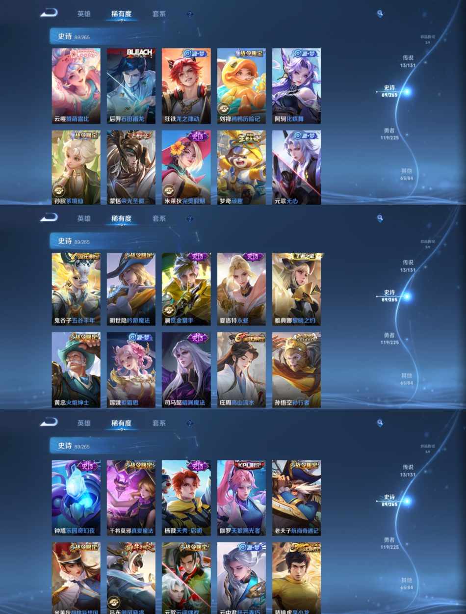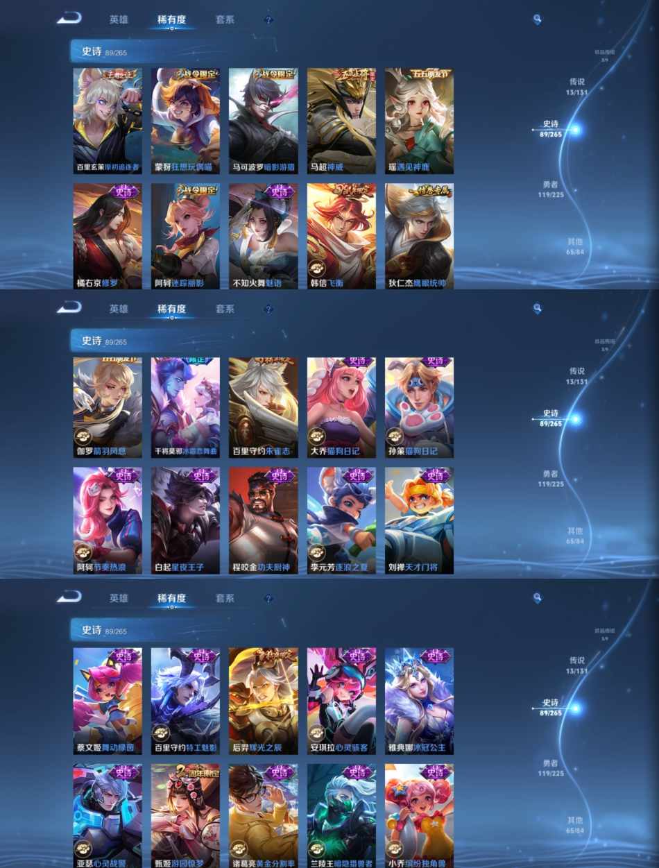 贵族等级:v8皮肤数:291生肖限定8 荣耀典藏2 传说品质13 情人节限定1 珍品传说3 英雄数:126