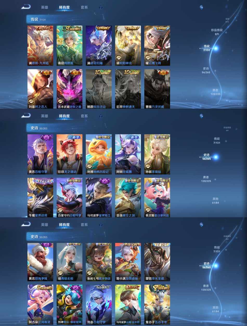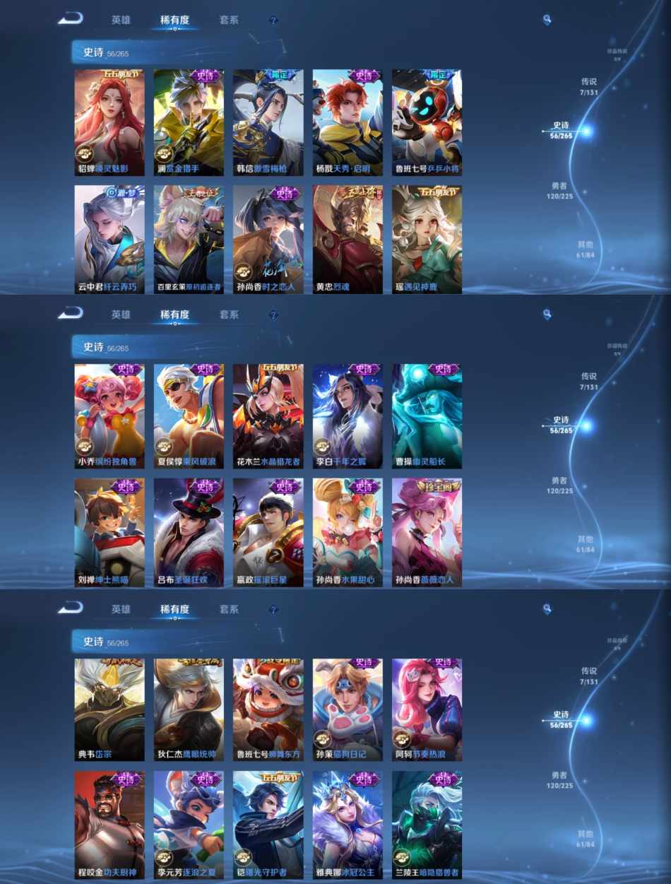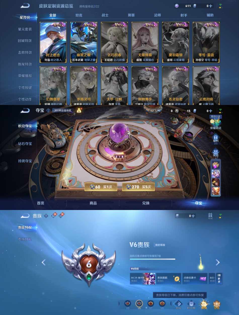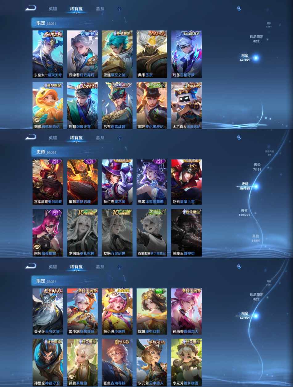 贵族等级:v7皮肤数:244传说品质7 生肖限定3 英雄数:124