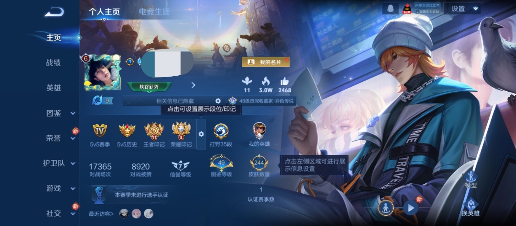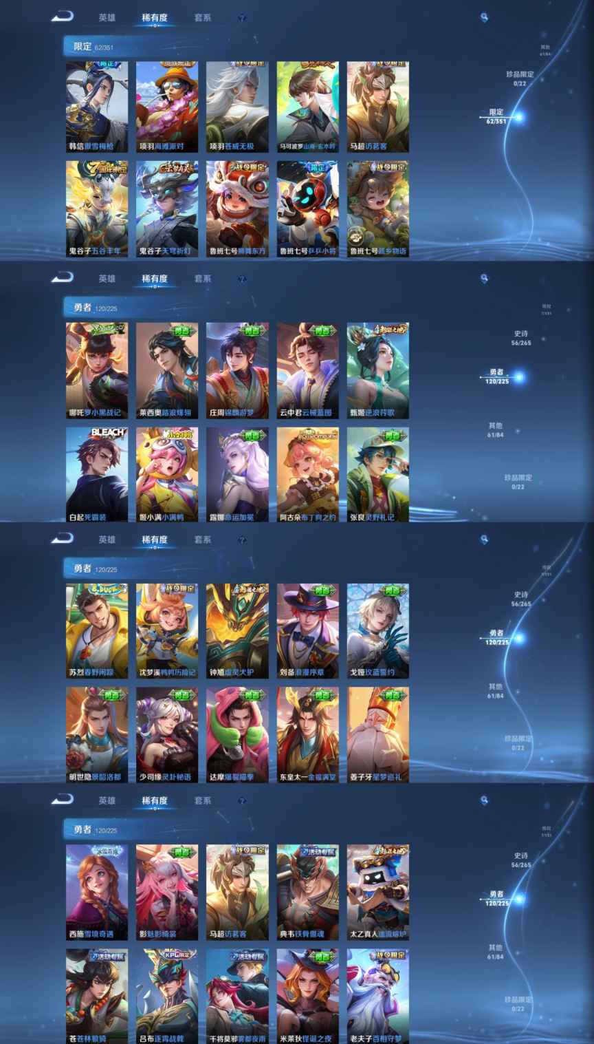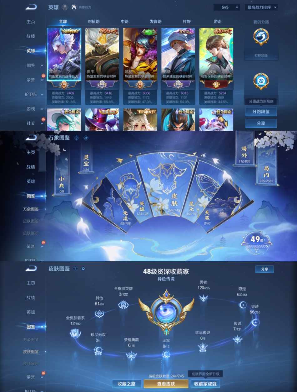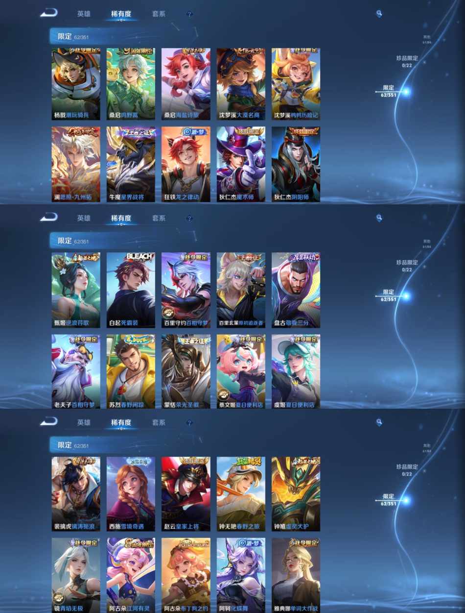 贵族等级:v7皮肤数:244传说品质7 生肖限定3 英雄数:124