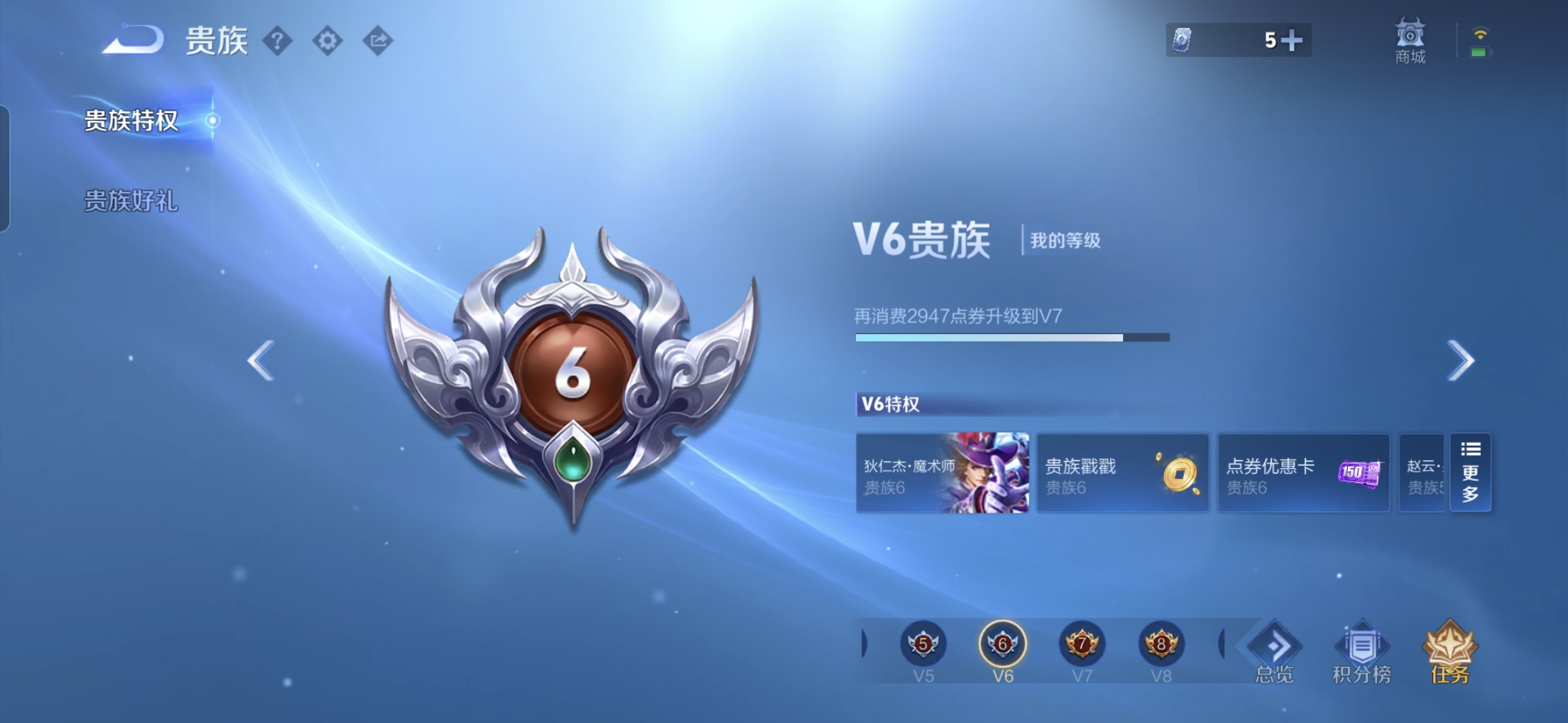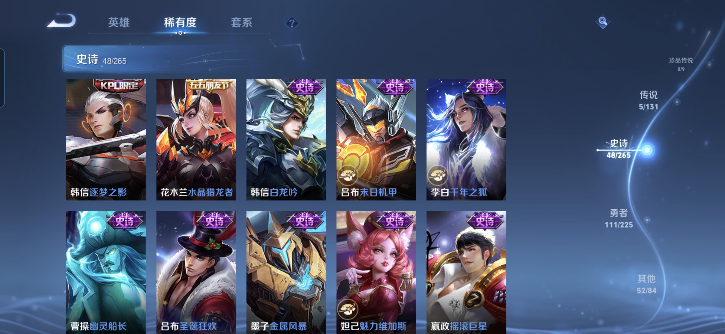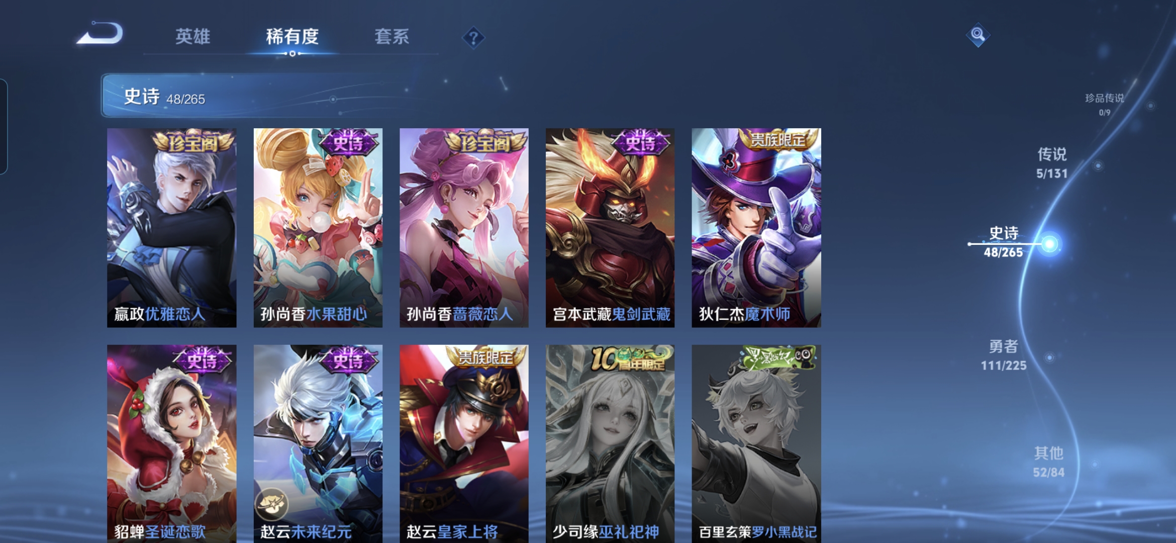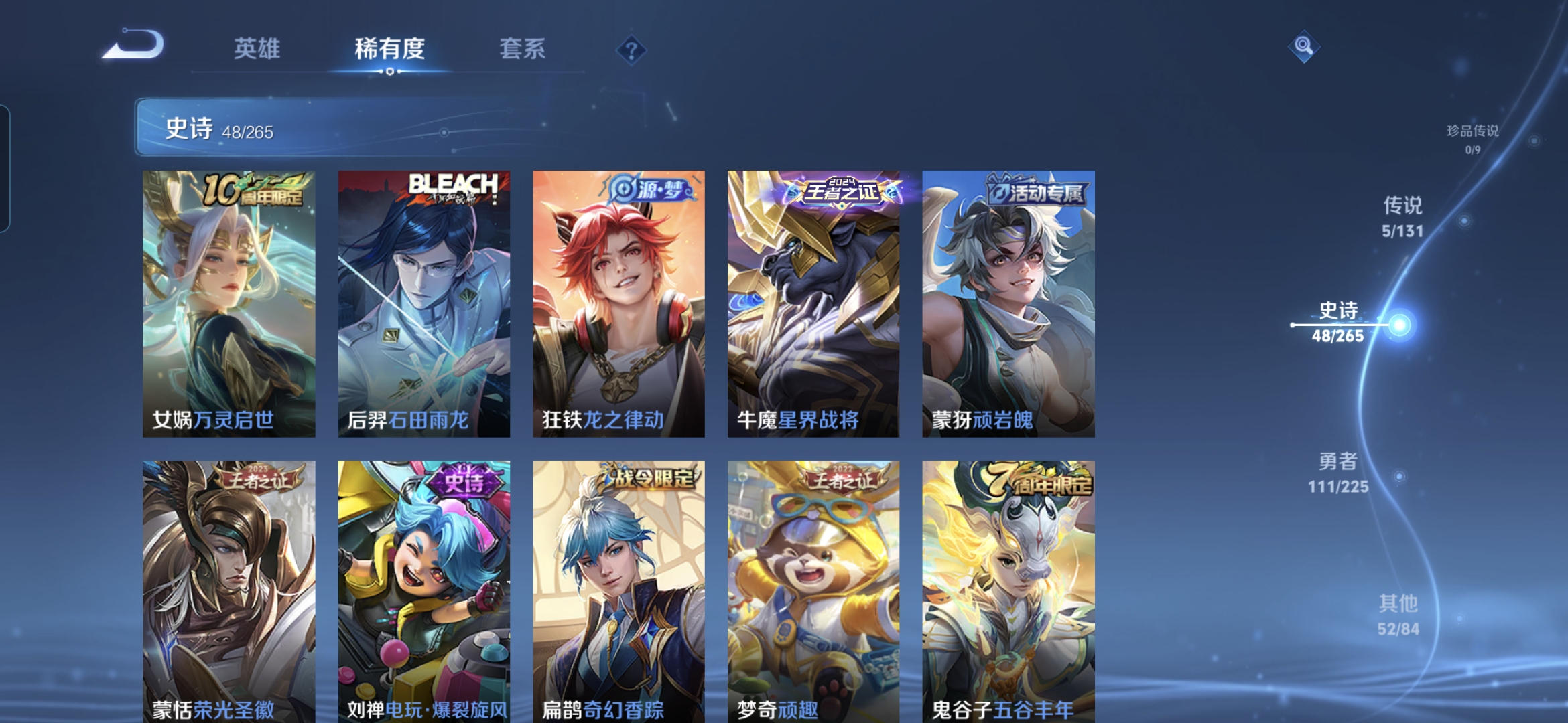 贵族等级:v6皮肤数:217传说品质5 情人节限定1 生肖限定1 荣耀典藏1 英雄数:126