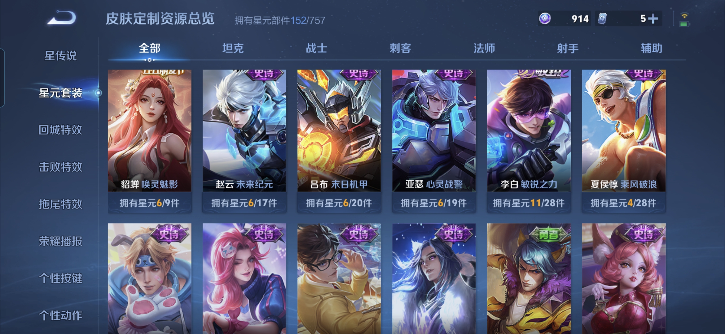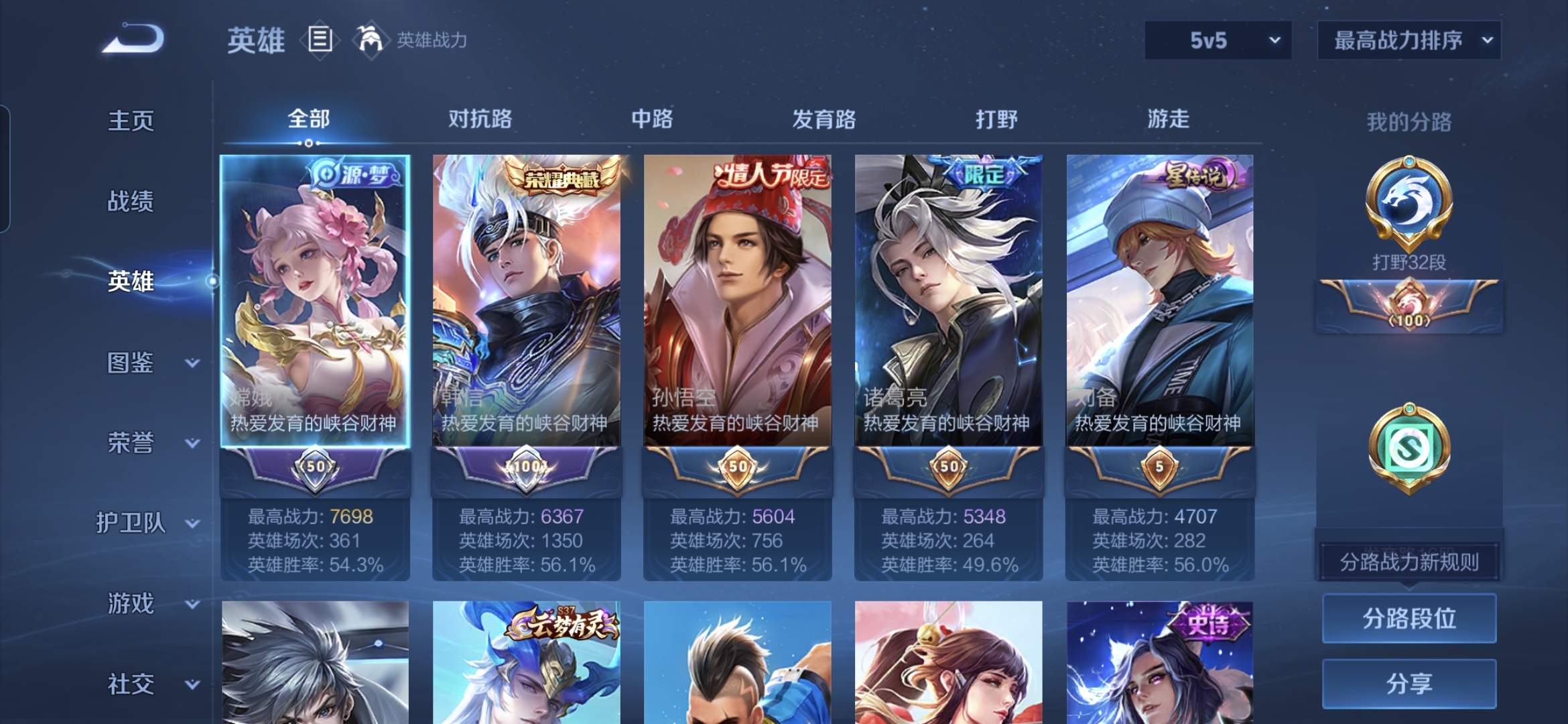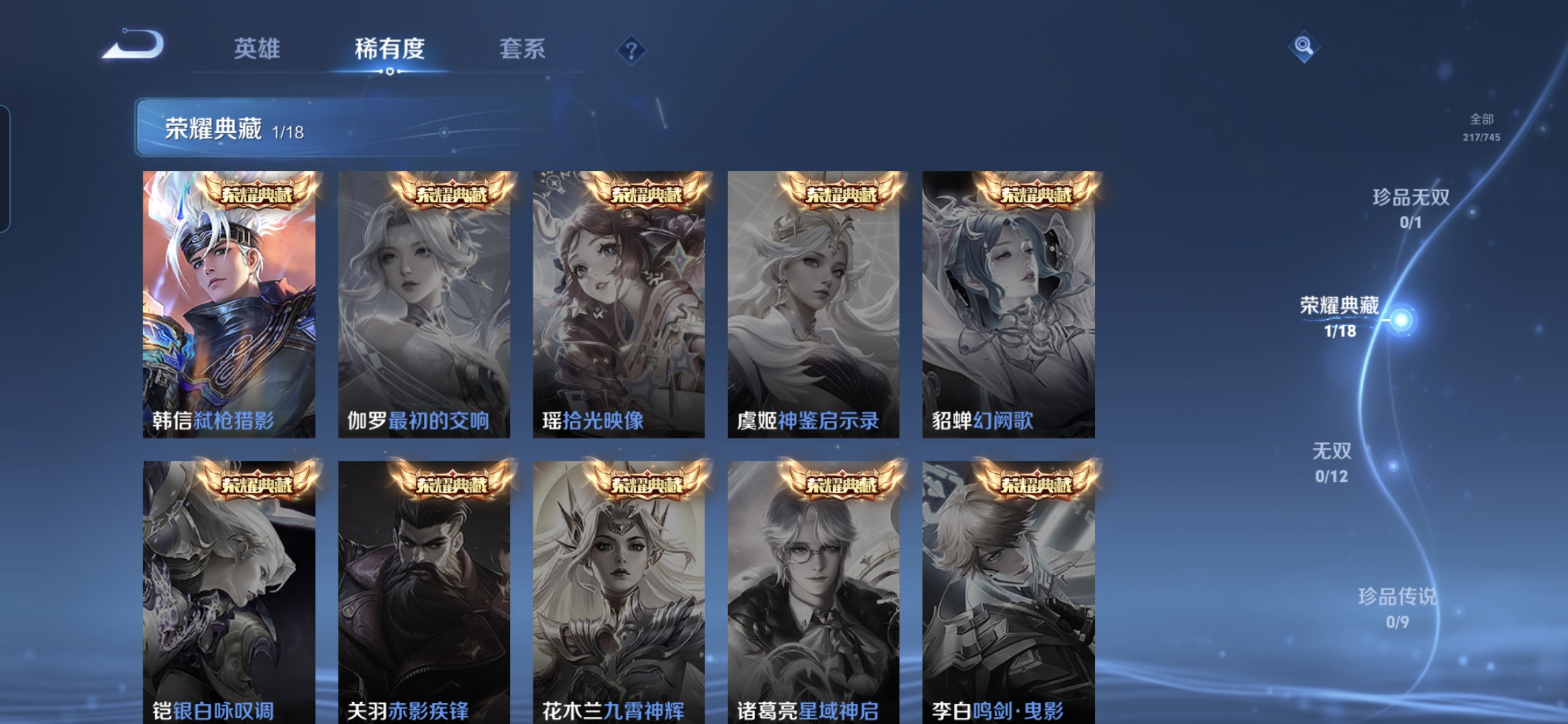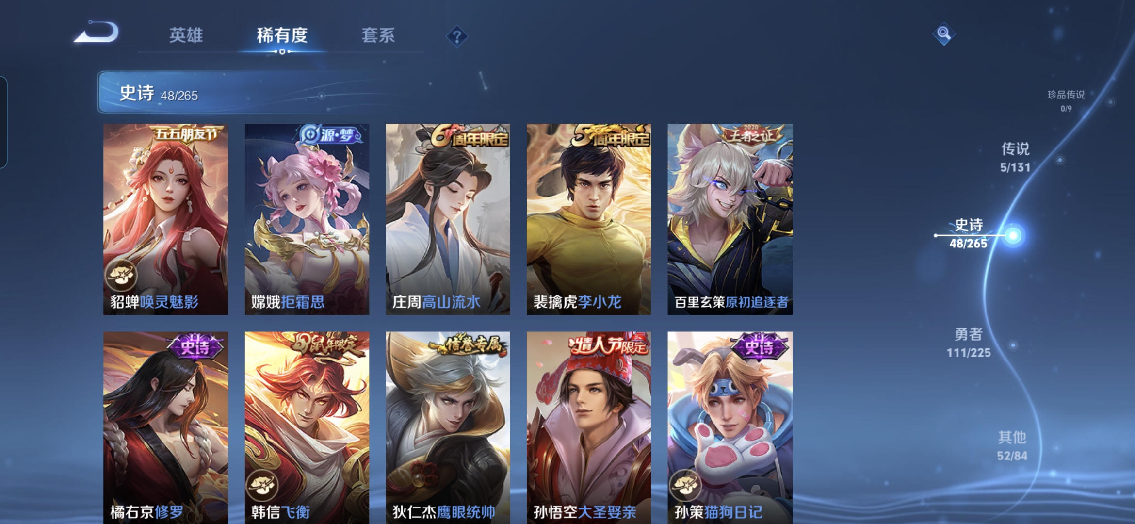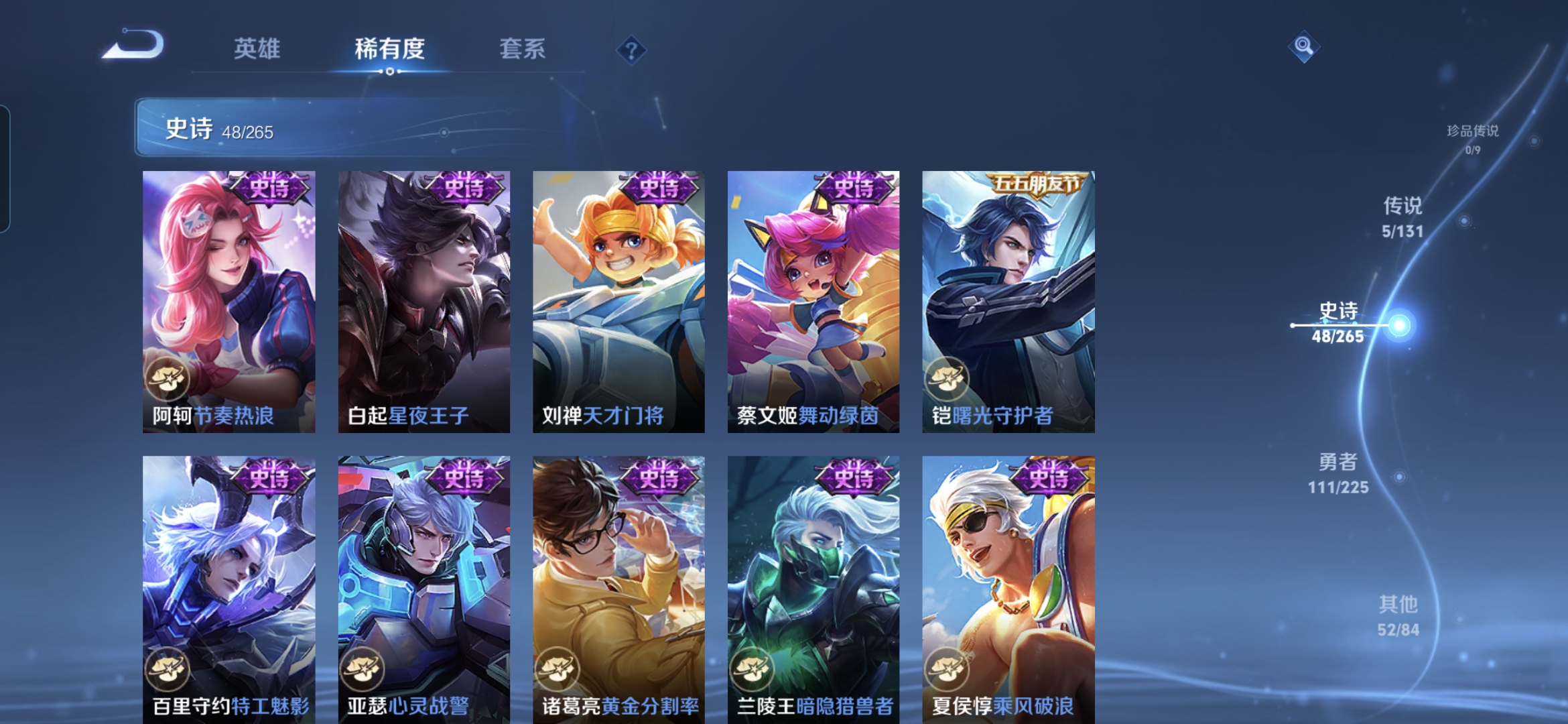 贵族等级:v6皮肤数:217传说品质5 情人节限定1 生肖限定1 荣耀典藏1 英雄数:126