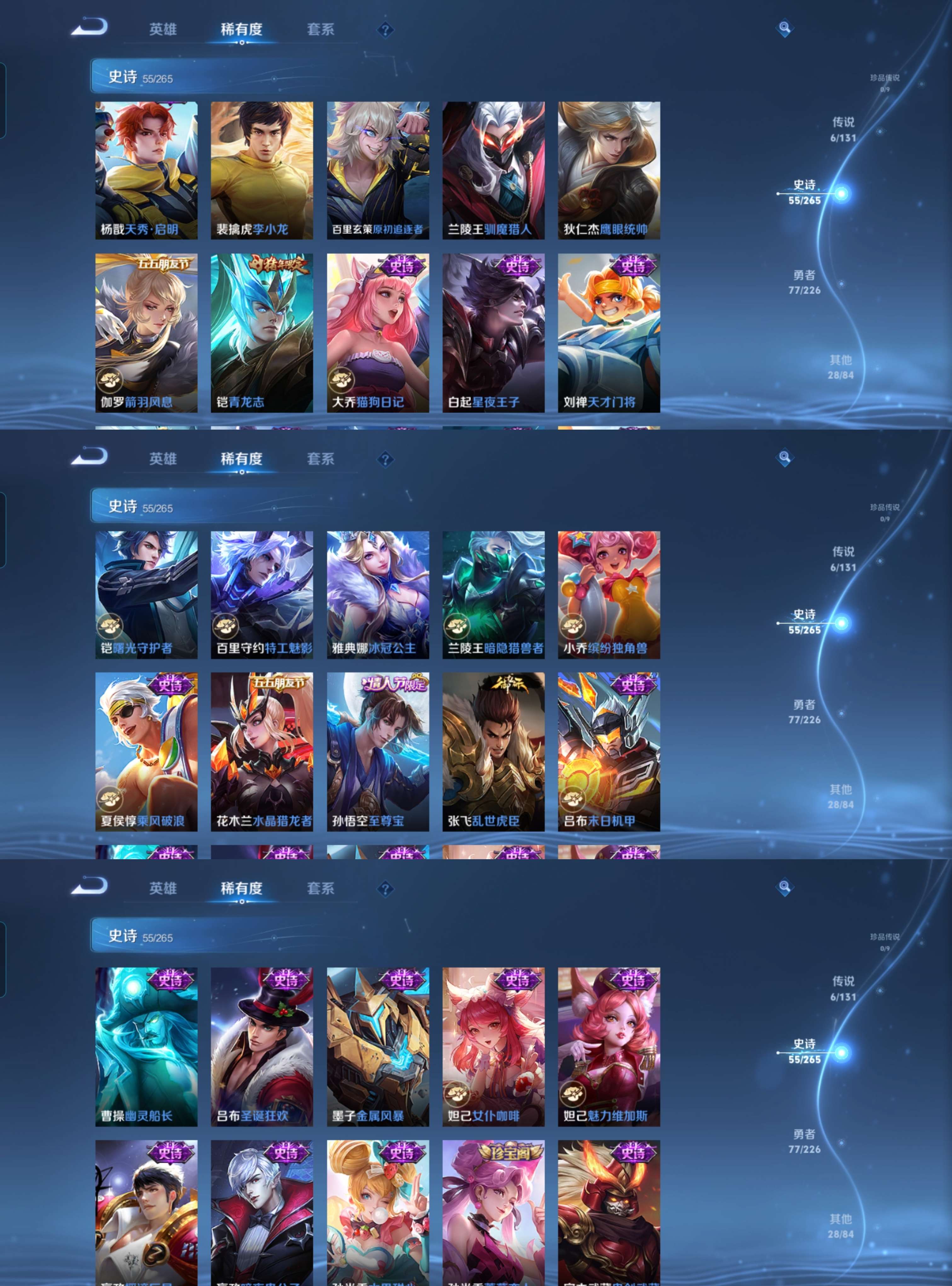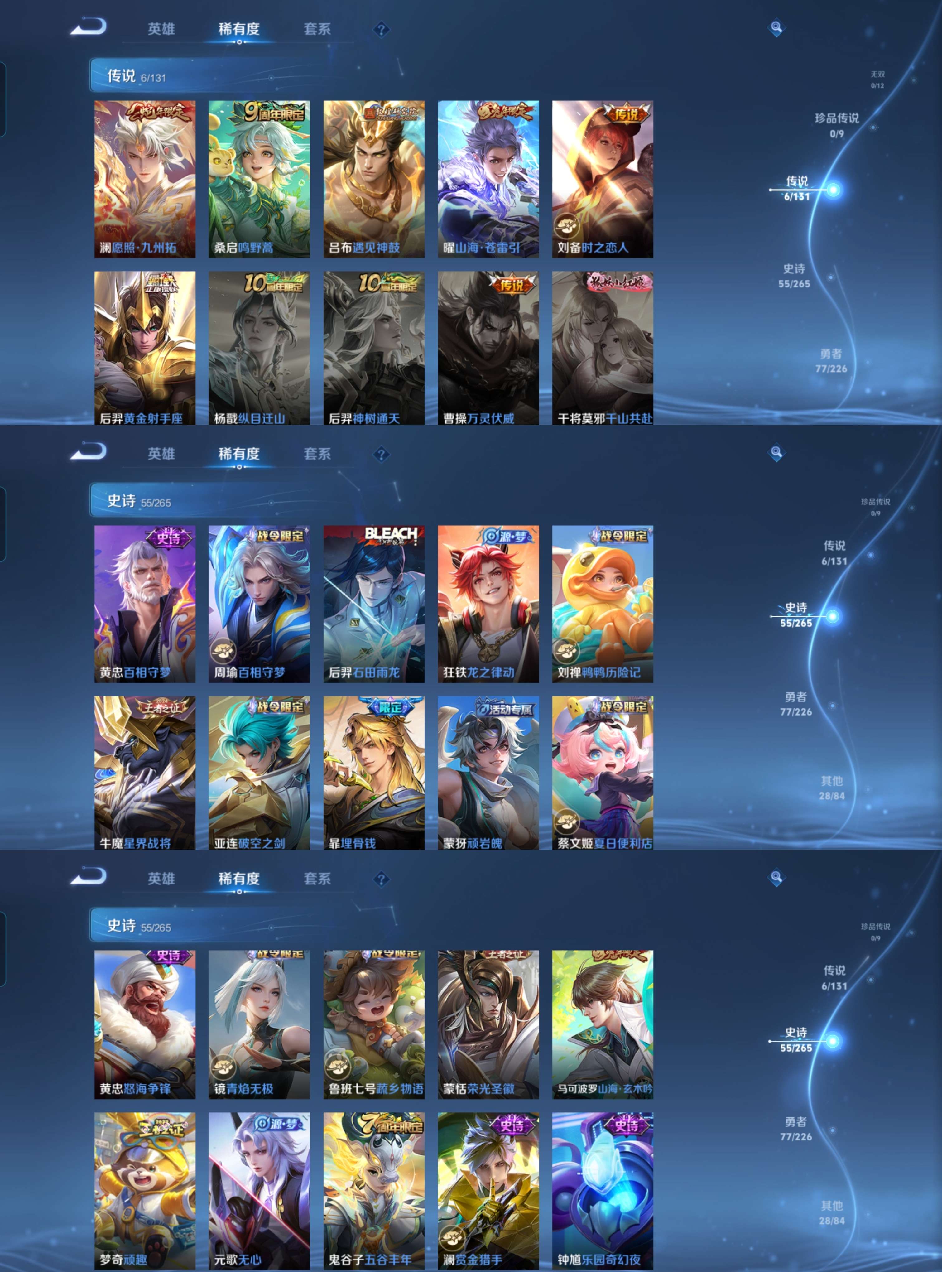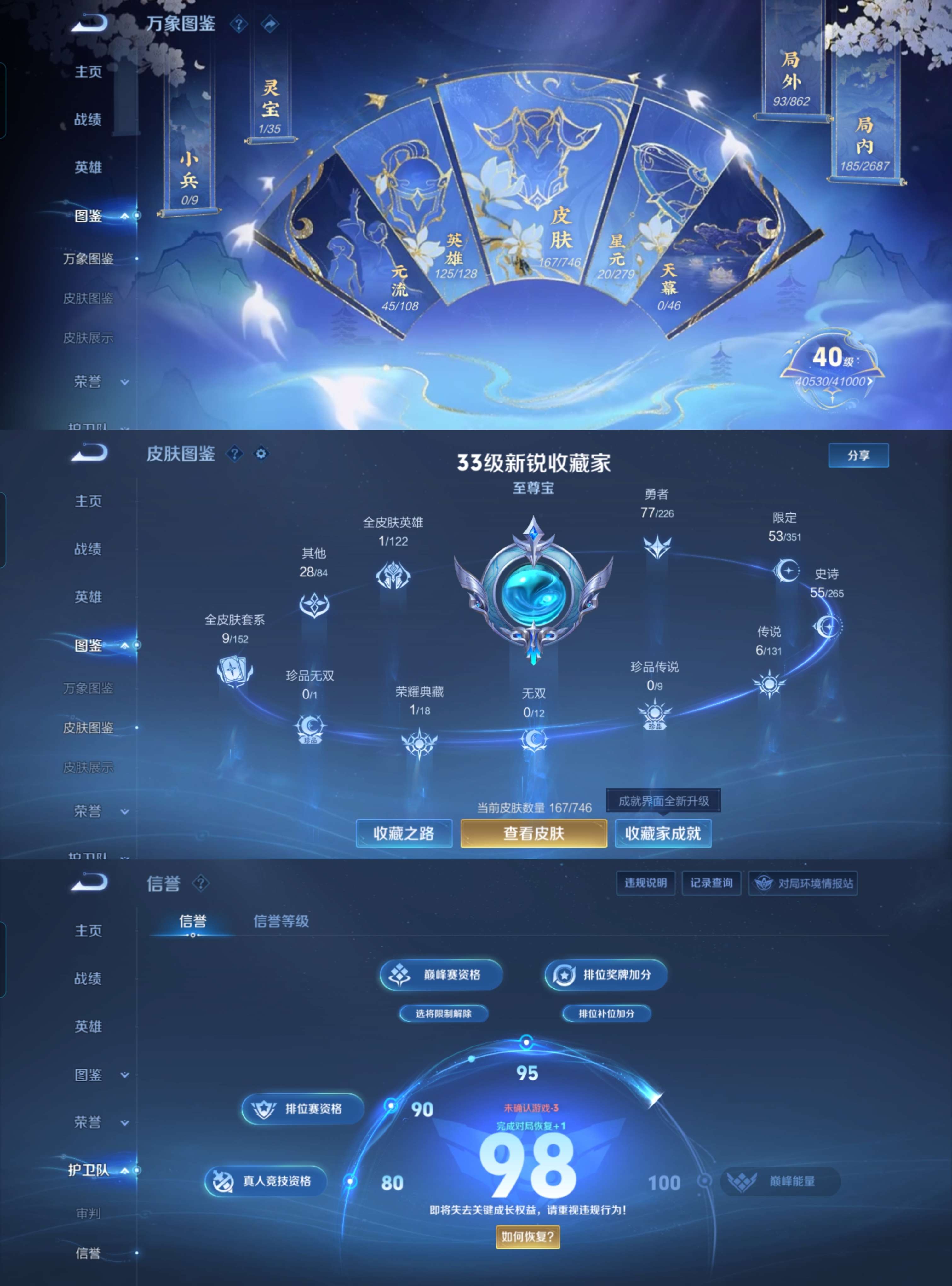 贵族等级:v7皮肤数:167传说品质6 生肖限定4 情人节限定1 荣耀典藏1 英雄数:125