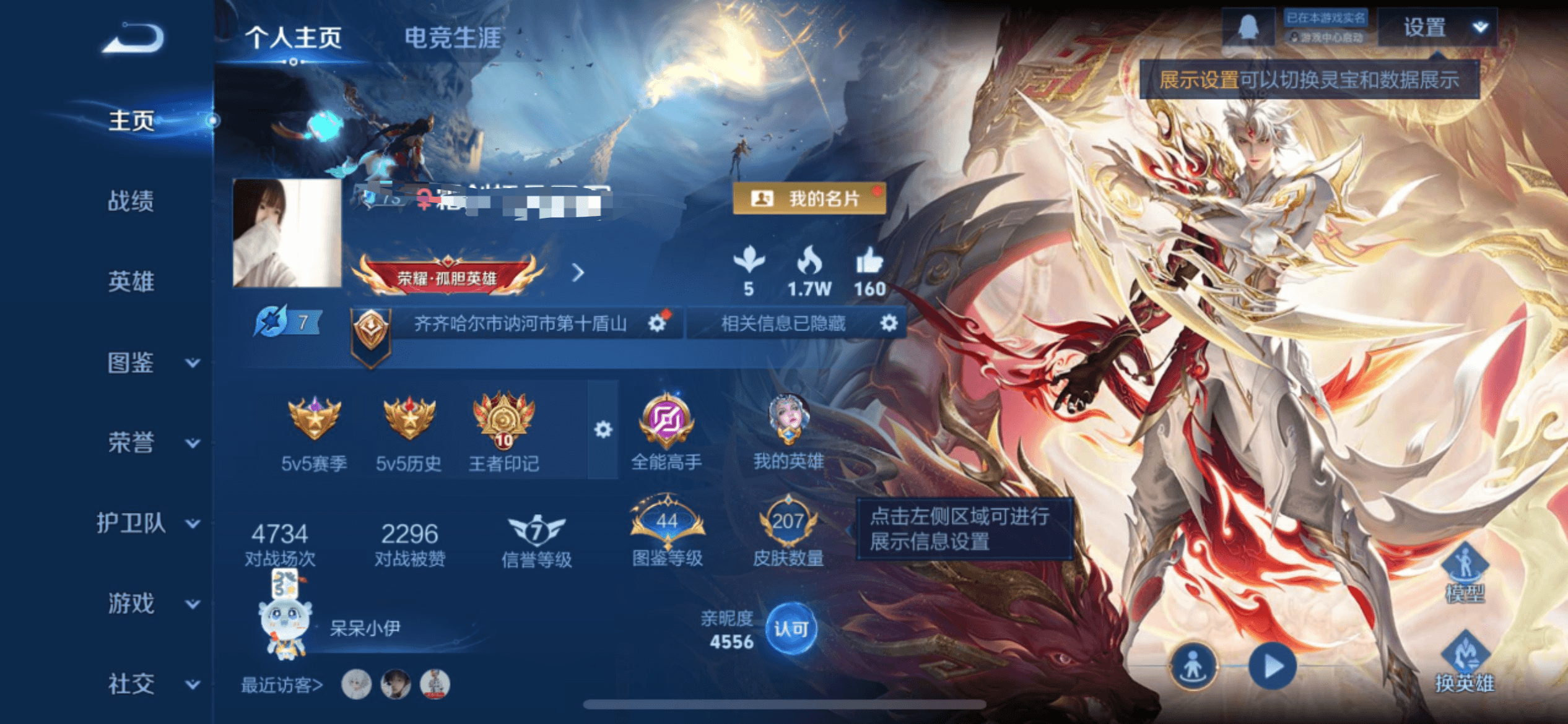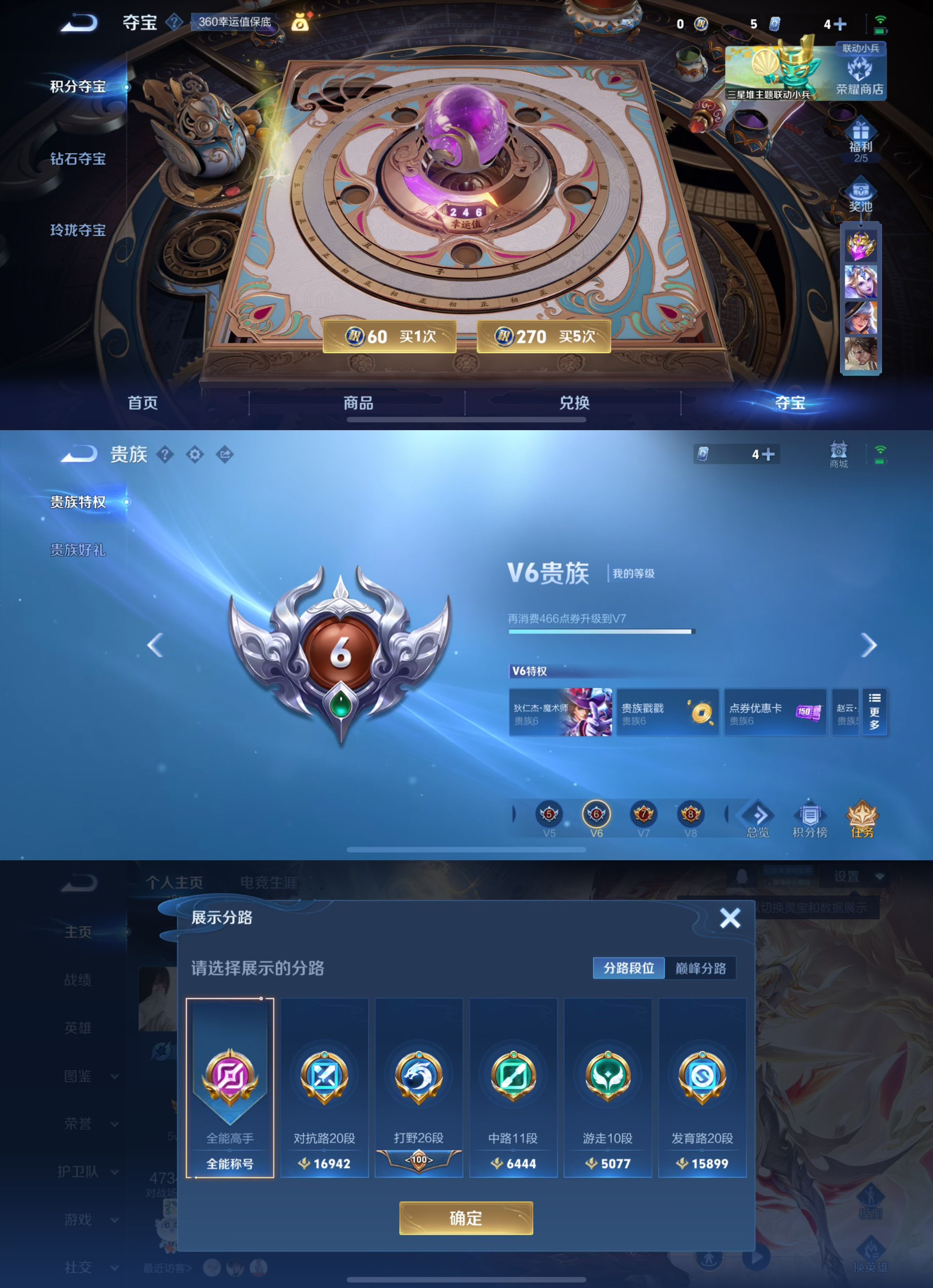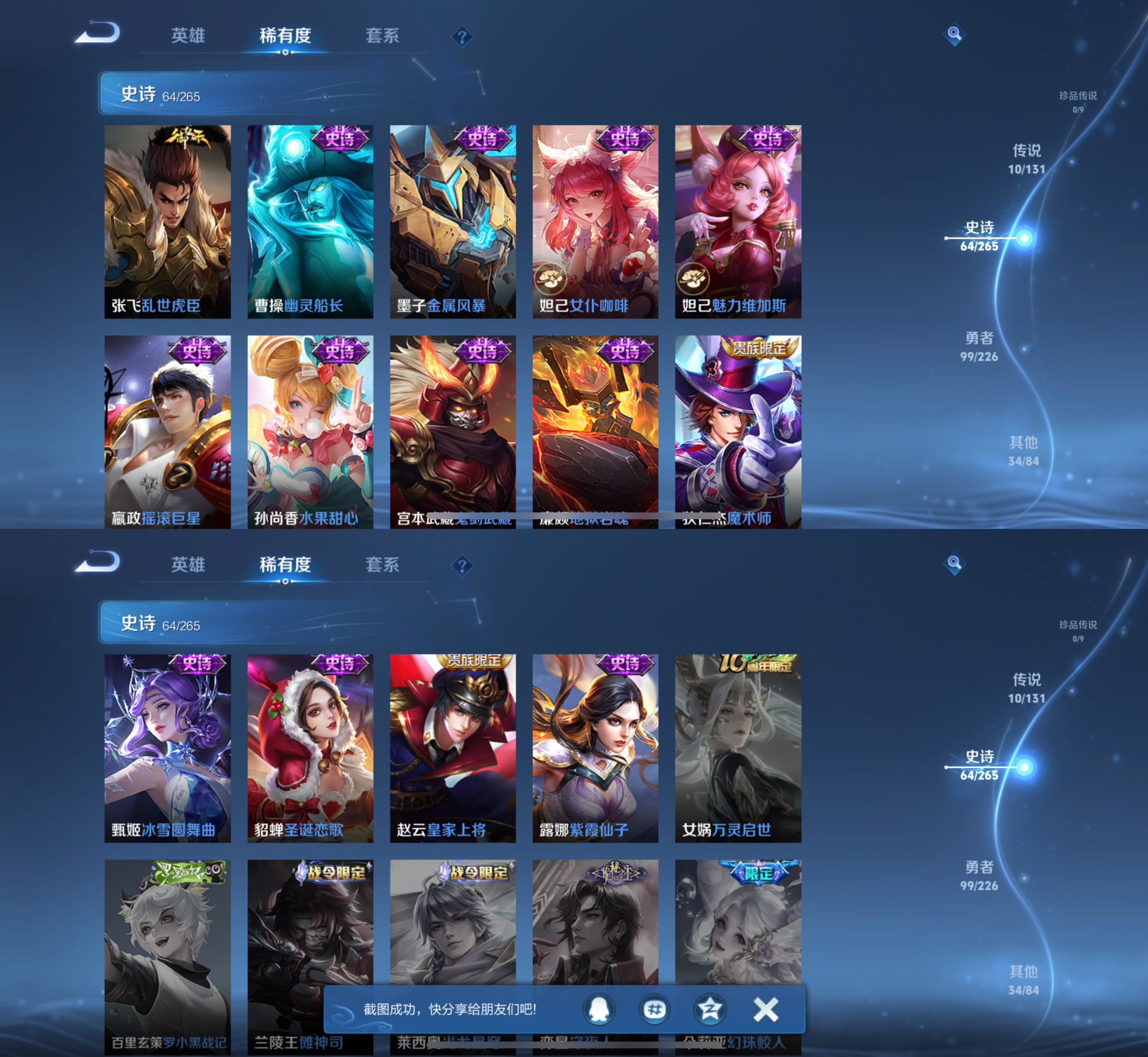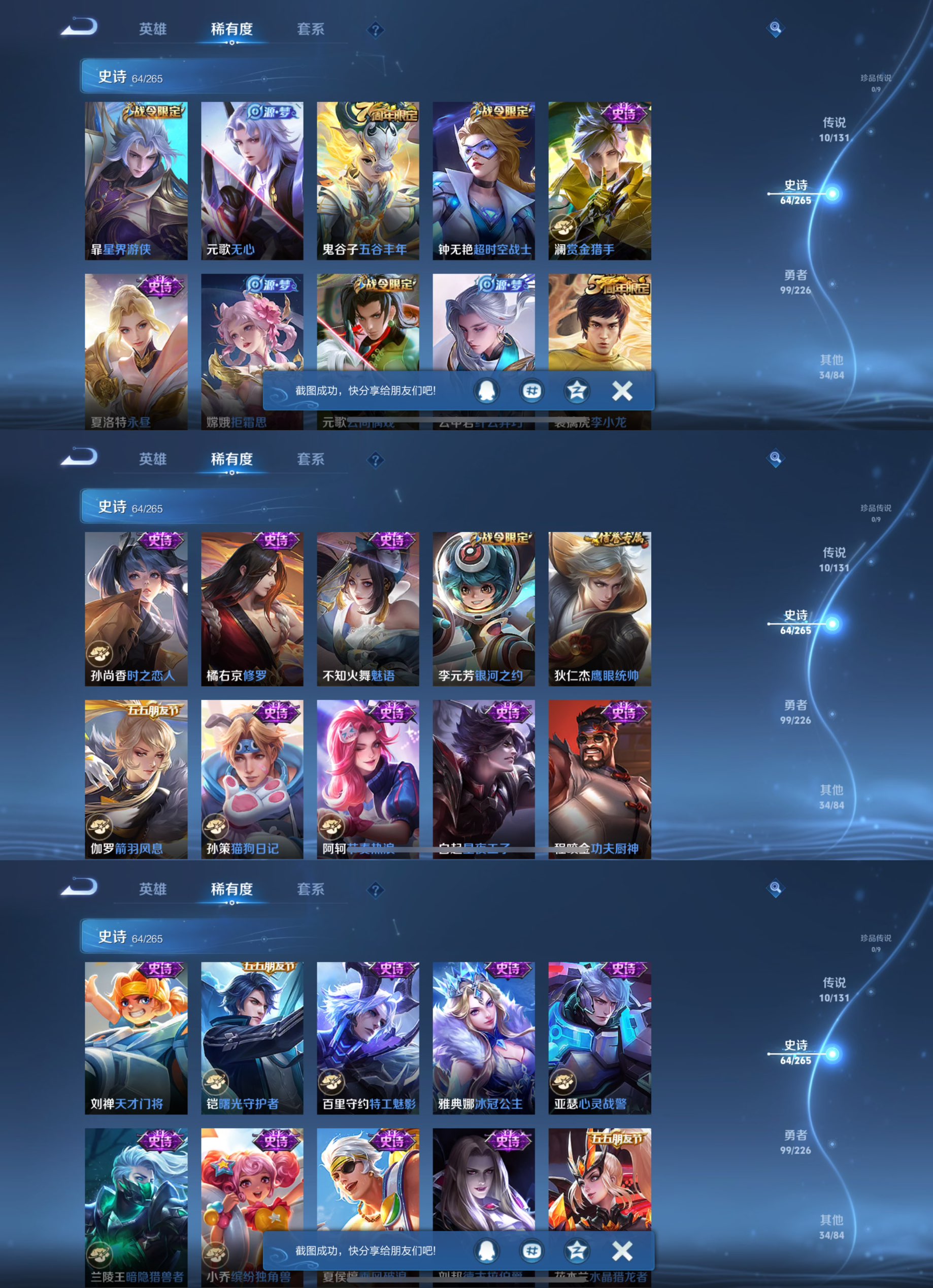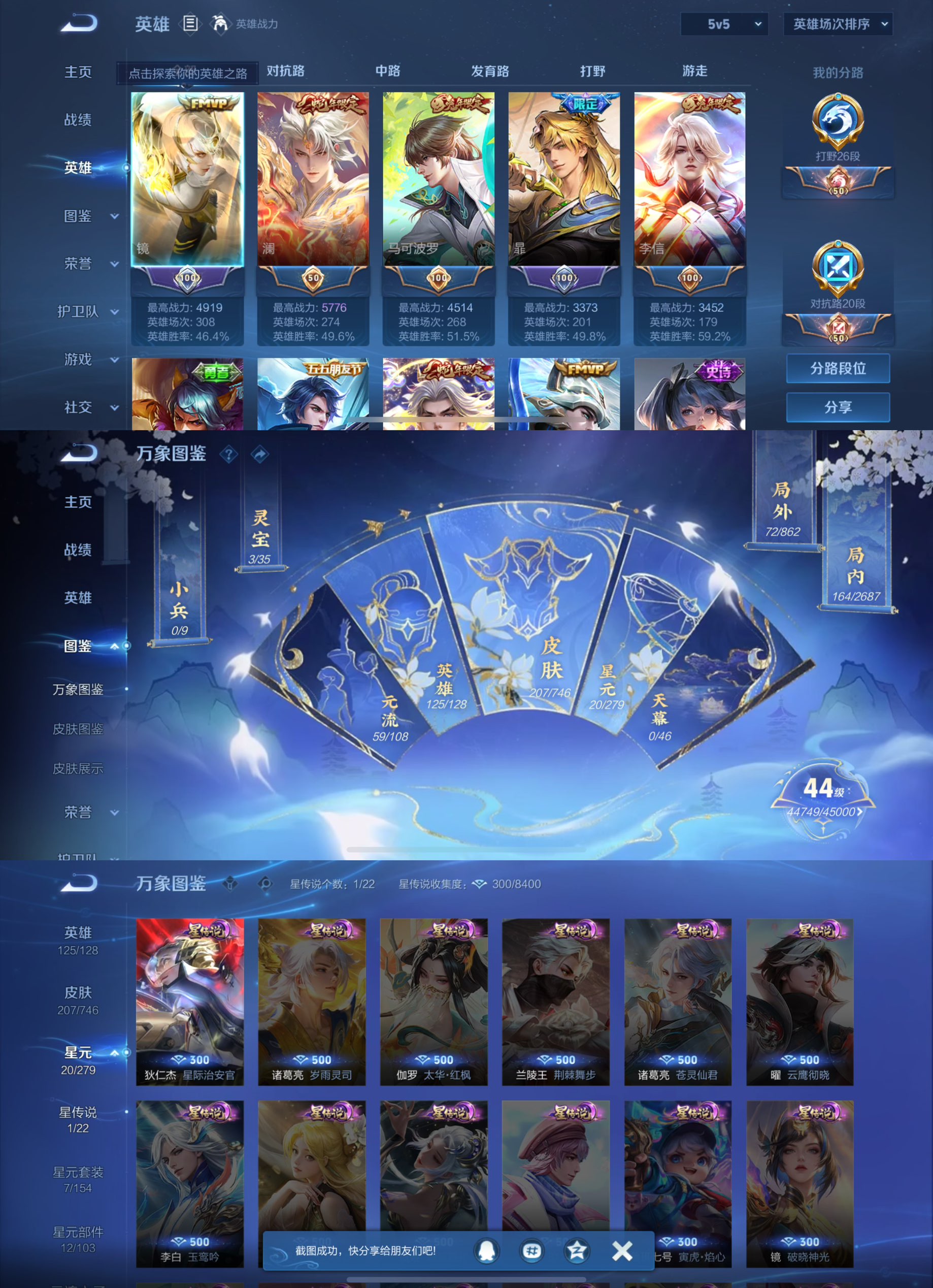 贵族等级:v7皮肤数:207传说品质10 生肖限定4 英雄数:125