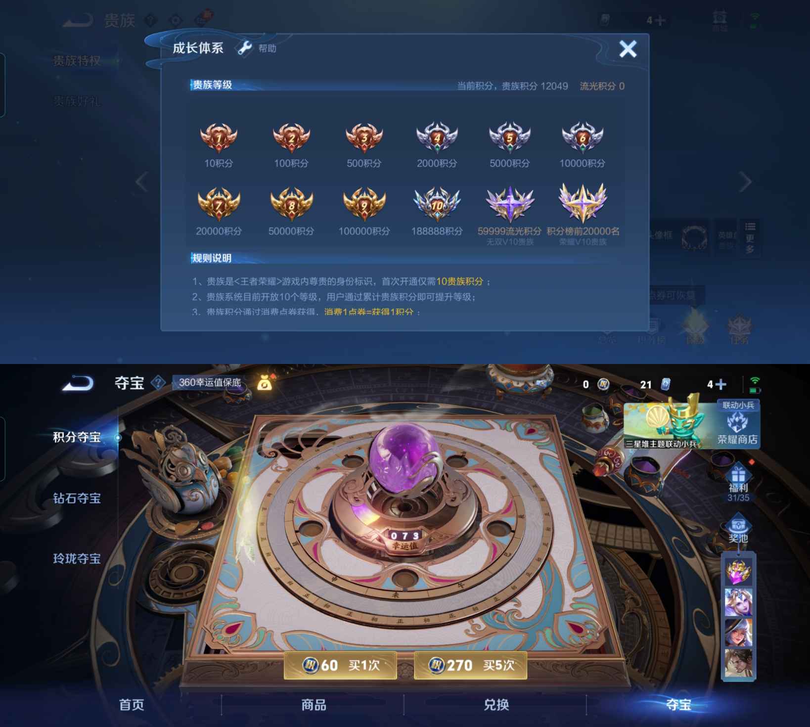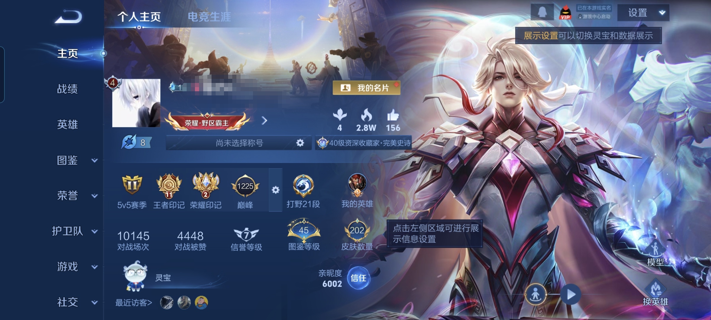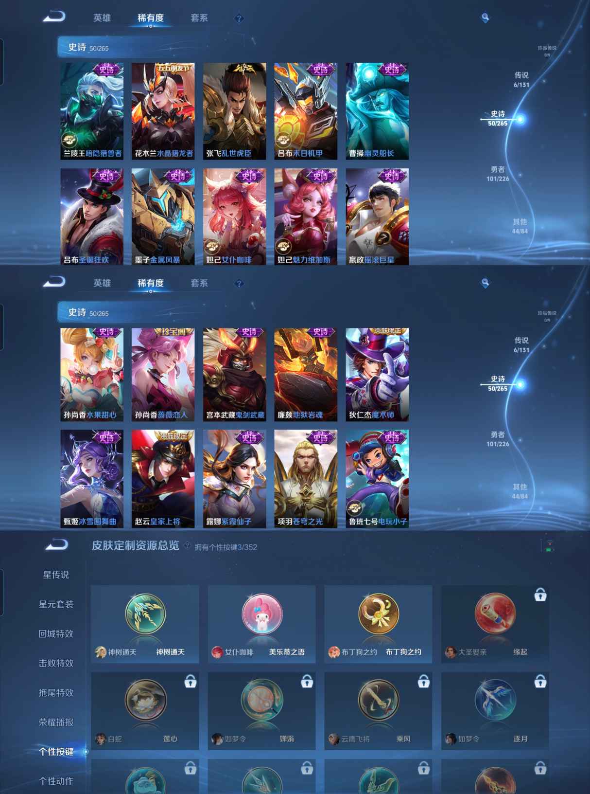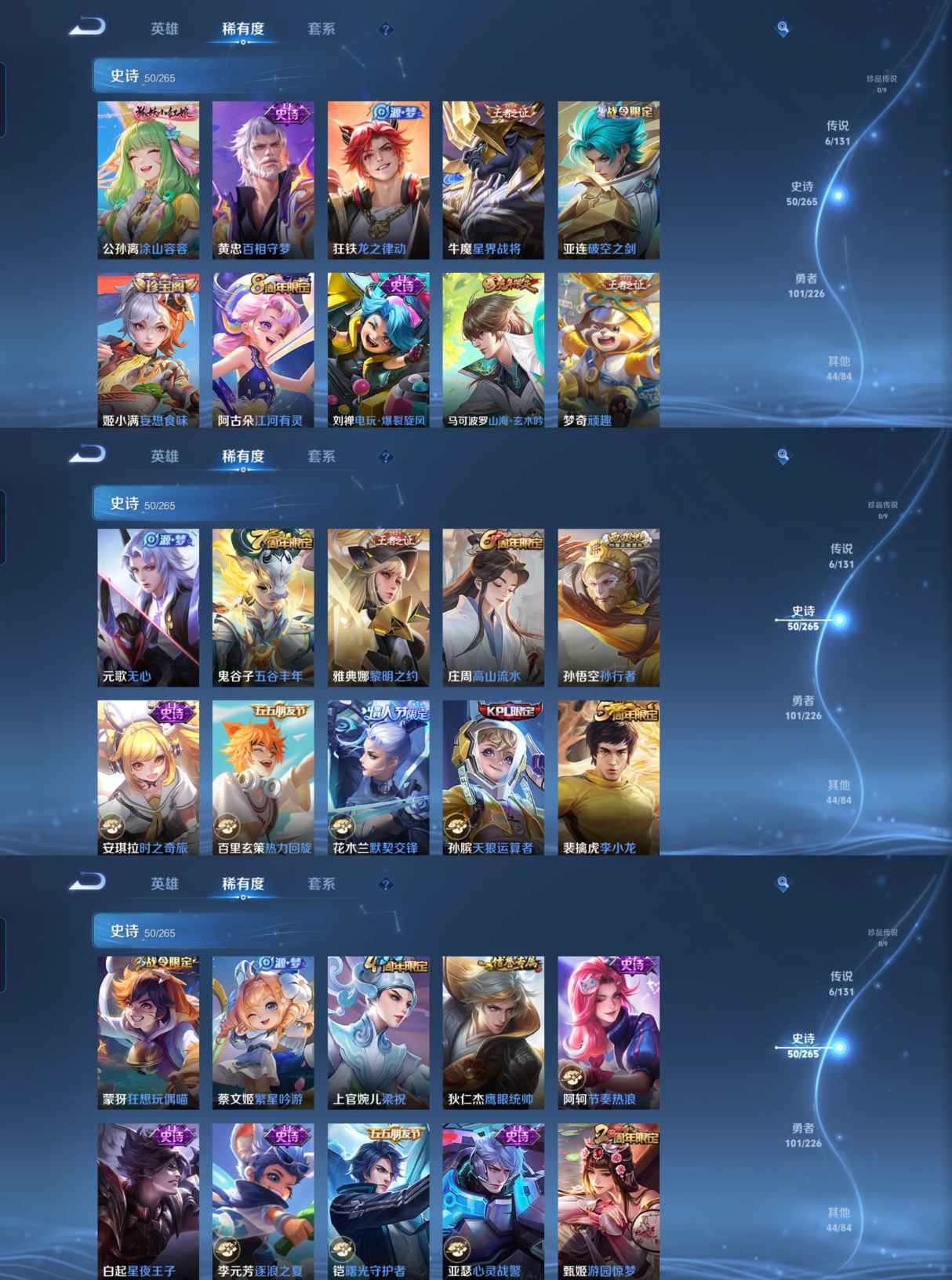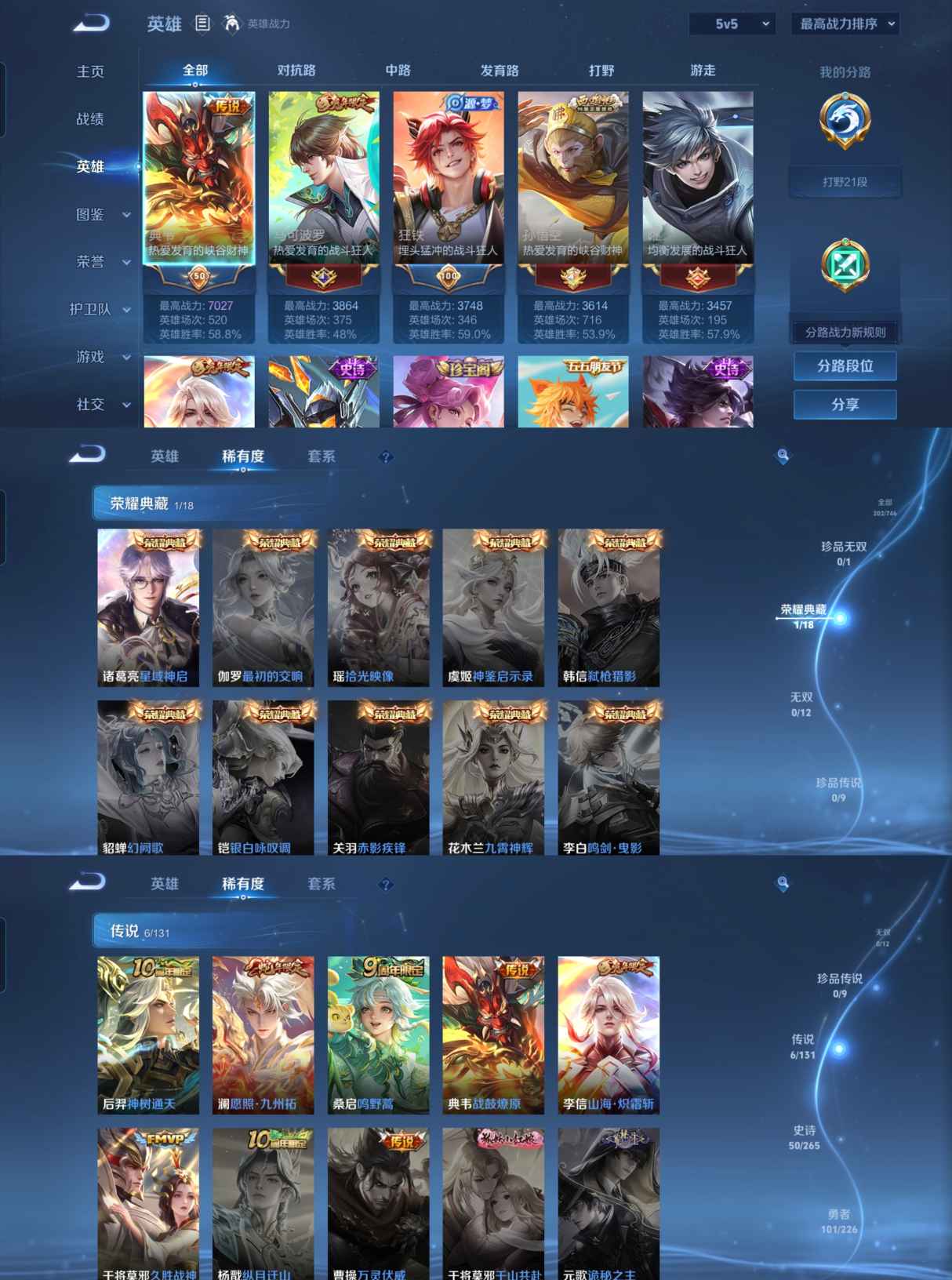 贵族等级:v6皮肤数:202传说品质6 生肖限定3 荣耀典藏1 情人节限定1 英雄数:125
