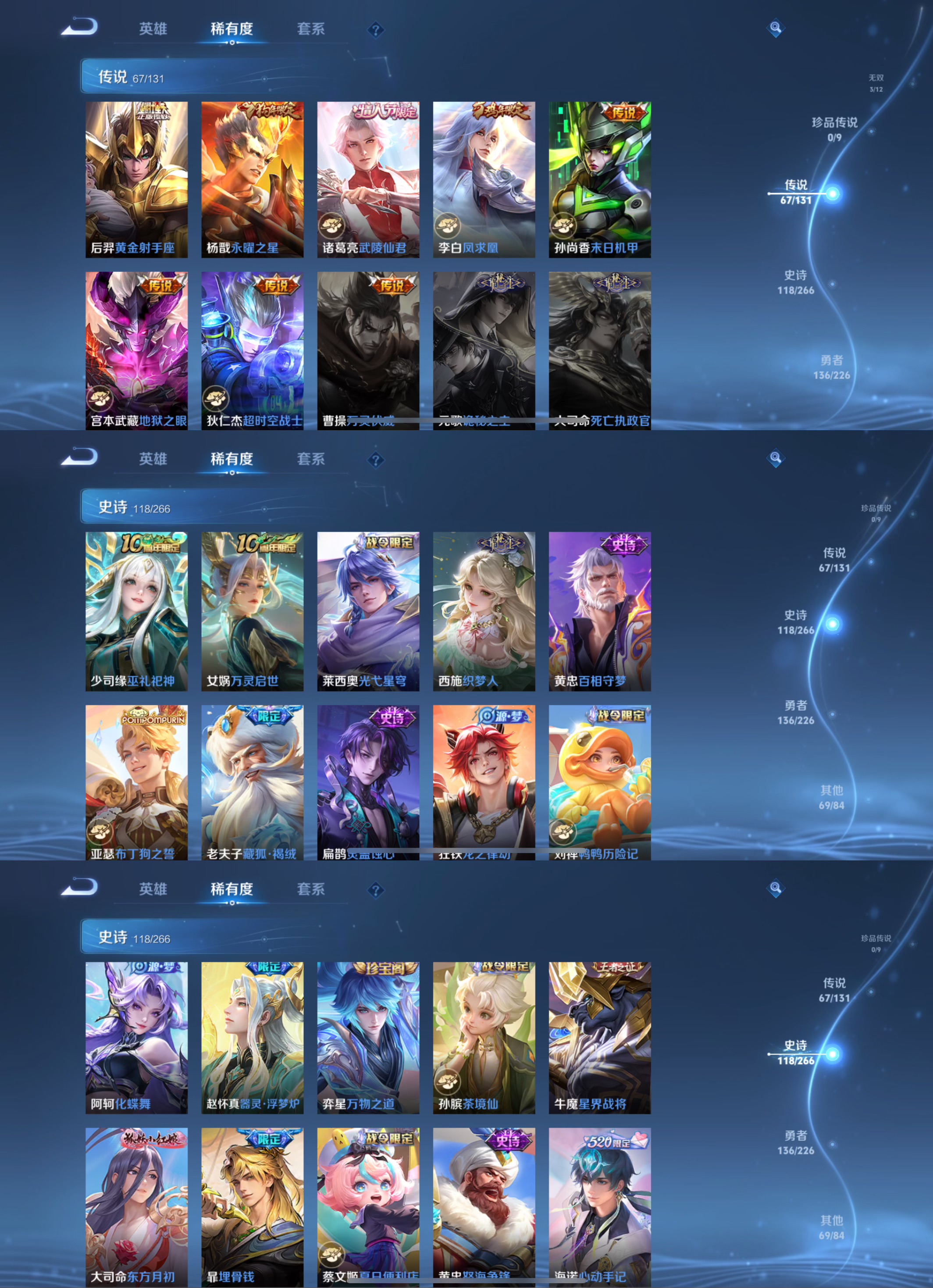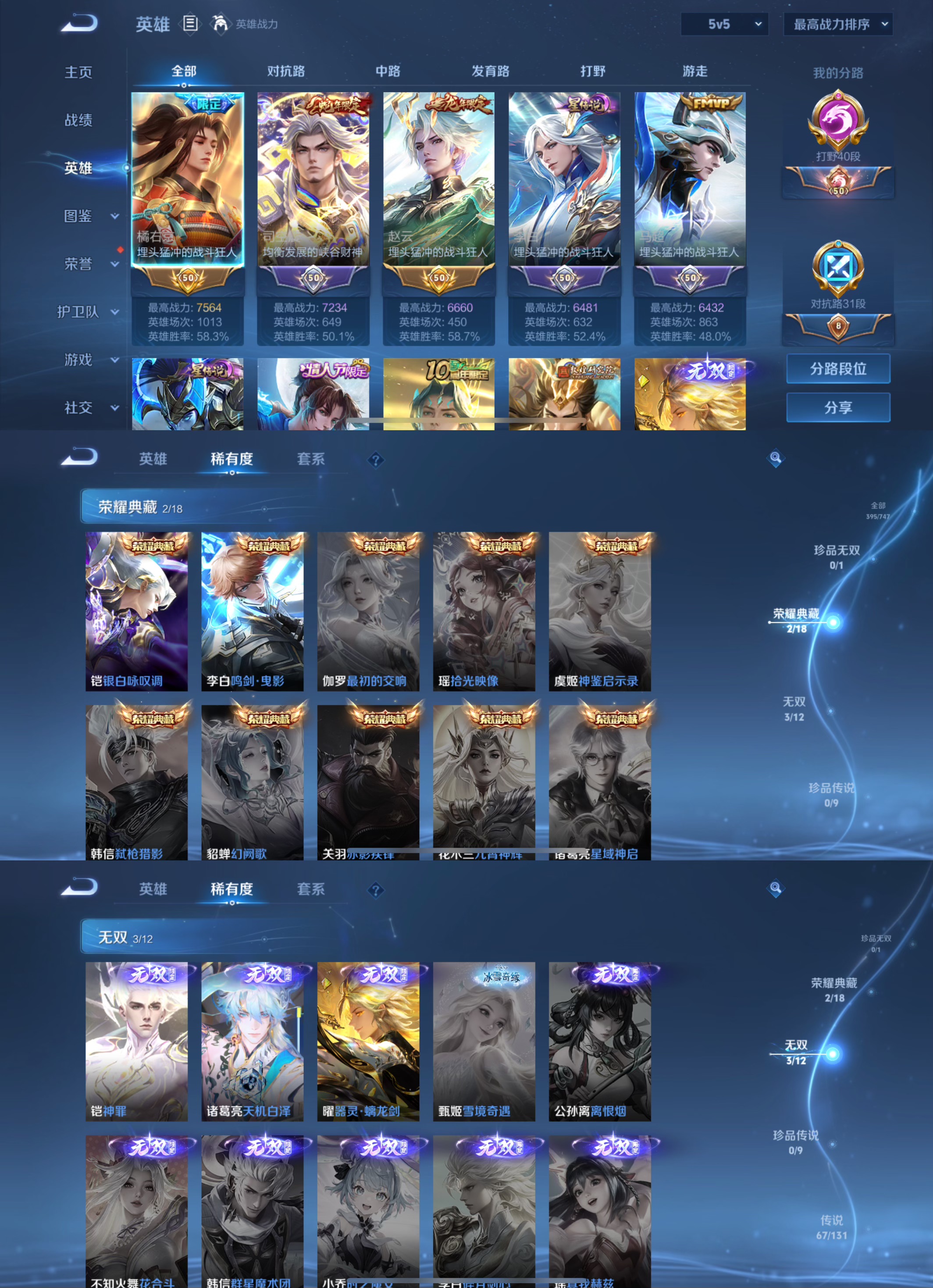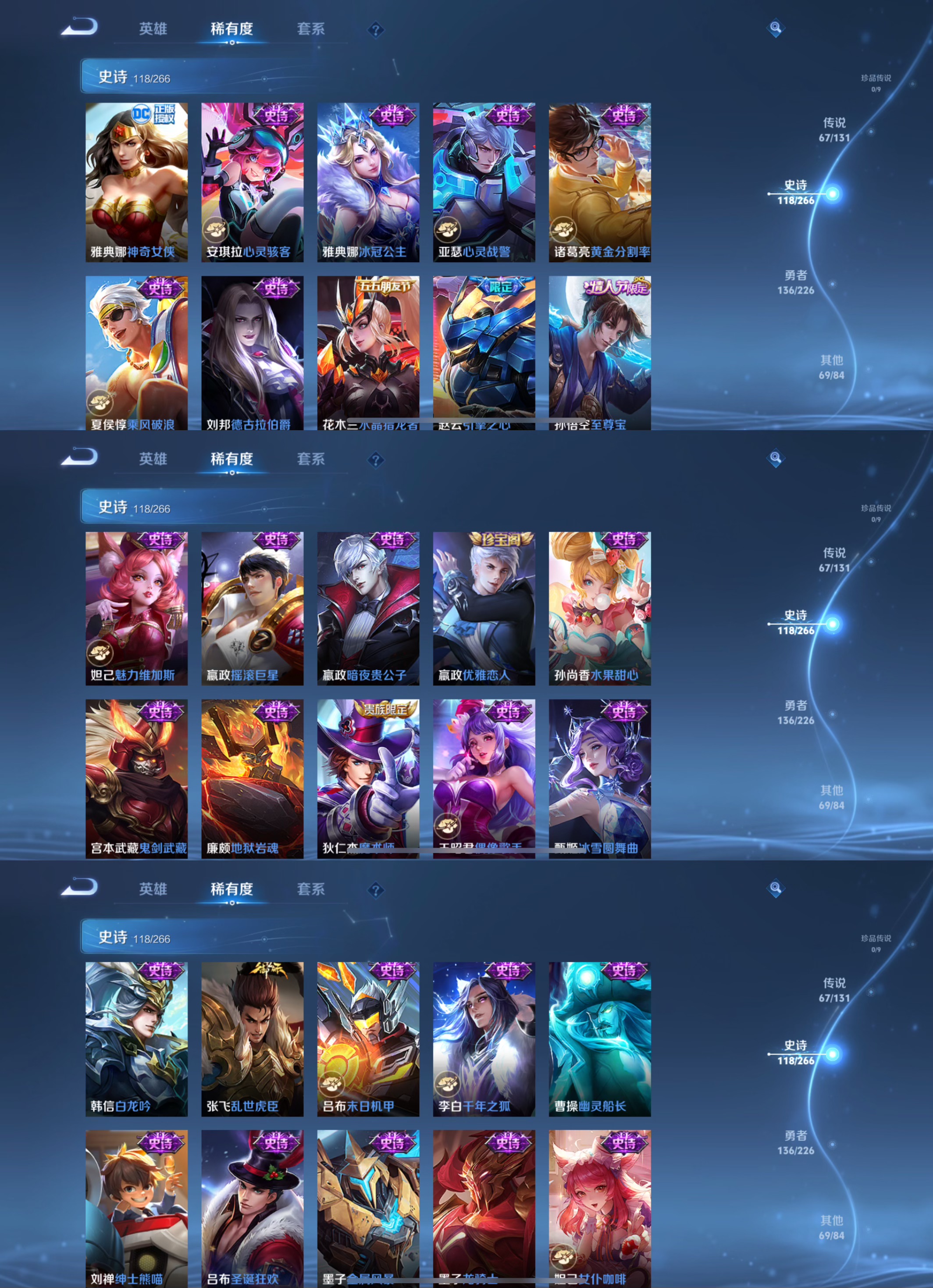 贵族等级:v10皮肤数:396传说品质67 生肖限定17 情人节限定6 无双3 荣耀典藏2 英雄数:127