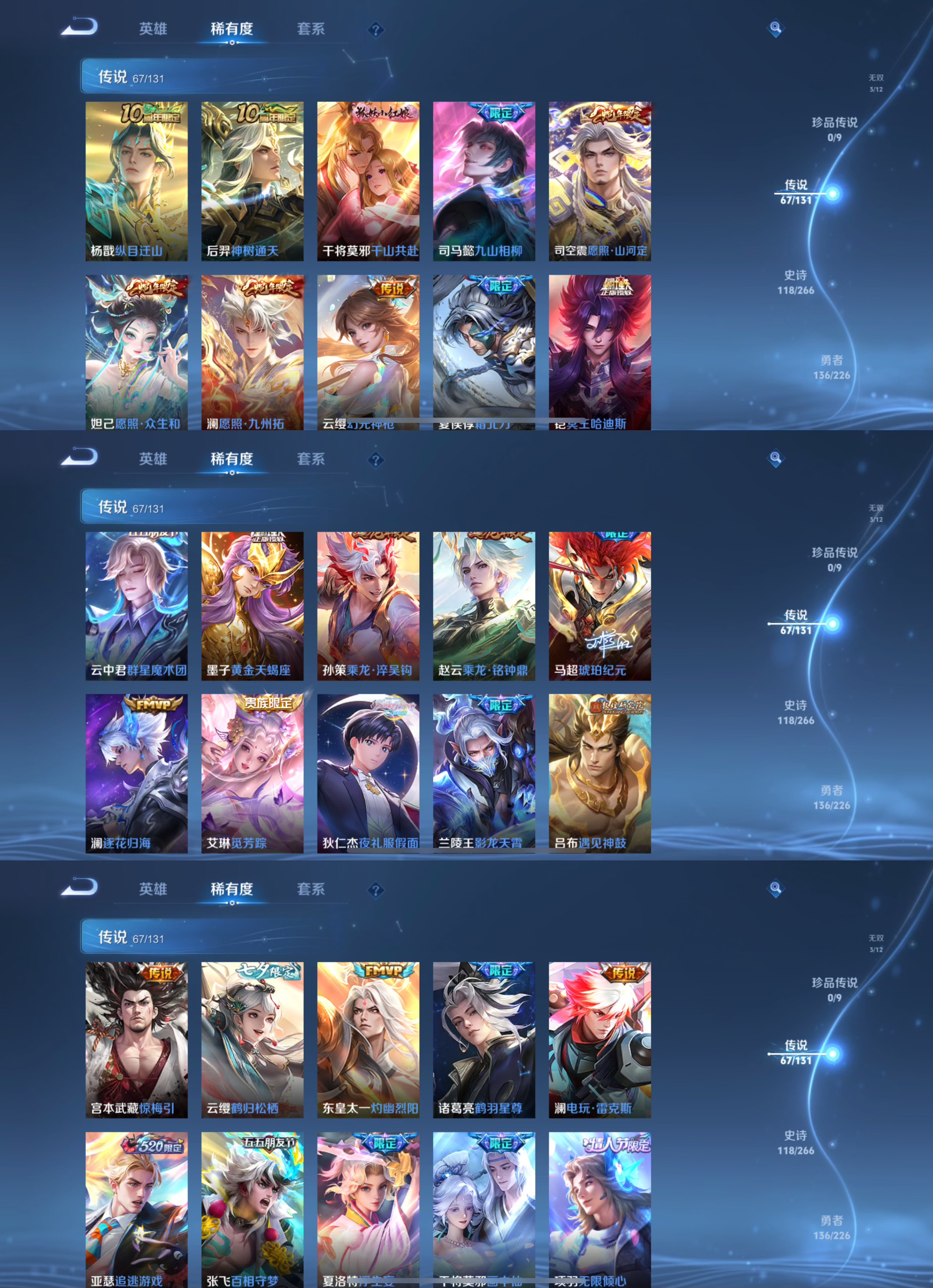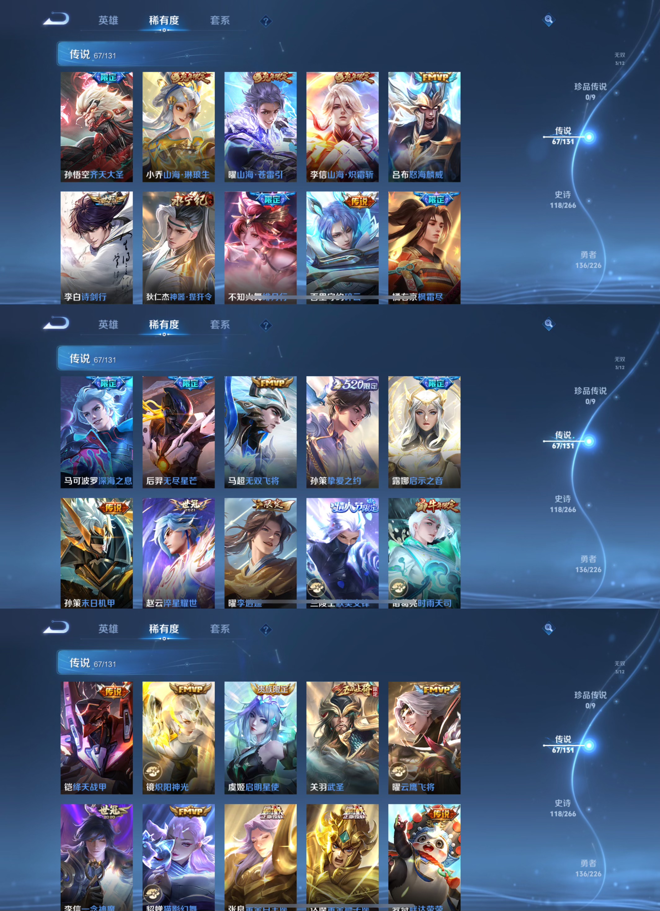 传说品质_后羿_黄金射手座传说品质_后羿_无尽星芒传说品质_后羿_神树通天传说品质_张良_黄金白羊座传说品质_艾琳_觅芳踪传说品质_司空震_愿照·山河定传说品质_关羽_武圣传说品质_云中君_群星魔术团传说品质_澜_电玩·雷克斯传说品质_澜_逐花归海传说品质_澜_愿照·九州拓传说品质_墨子_黄金天蝎座传说品质_诸葛亮_武陵仙君传说品质_诸葛亮_时雨天司传说品质_诸葛亮_鹤羽星尊传说品质_兰陵王_影龙天霄传说品质_兰陵王_默契交锋传说品质_马可波罗_深海之息传说品质_吕布_怒海麟威传说品质_吕布_遇见神鼓传说品质_孙悟空_齐天大圣传说品质_妲己_愿照·众生和传说品质_云缨_鹤归松栖传说品质_云缨_幻光神枪传说品质_亚瑟_追逃游戏传说品质_李白_凤求凰传说品质_李白_诗剑行传说品质_马超_无双飞将传说品质_马超_琥珀纪元传说品质_张飞_百相守梦传说品质_杨戬_永曜之星传说品质_杨戬_纵目迁山传说品质_干将莫邪_千山共赴传说品质_干将莫邪_画中仙传说品质_宫本武藏_地狱之眼传说品质_宫本武藏_惊梅引传说品质_镜_炽阳神光传说品质_不知火舞_绯月行传说品质_貂蝉_猫影幻舞传说品质_百里守约_碎云传说品质_李信_山海·炽霜斩传说品质_李信_一念神魔传说品质_夏洛特_浮生妄传说品质_孙尚香_末日机甲传说品质_小乔_山海·琳琅生传说品质_夏侯惇_霜北刀传说品质_曜_云鹰飞将传说品质_曜_李逍遥 传说品质_曜_山海·苍雷引传说品质_梦奇_胖达荣荣传说品质_孙策_末日机甲传说品质_孙策_挚爱之约传说品质_孙策_乘龙·淬吴钩传说品质_达摩_黄金狮子座传说品质_狄仁杰_超时空战士传说品质_狄仁杰_神器·狴犴令传说品质_狄仁杰_夜礼服假面传说品质_司马懿_九山相柳传说品质_露娜_启示之音传说品质_铠_绛天战甲传说品质_铠_冥王哈迪斯传说品质_东皇太一_灼幽烈阳传说品质_虞姬_启明星使传说品质_橘右京_枫霜尽传说品质_项羽_无限倾心传说品质_赵云_乘龙·铭钟鼎传说品质_赵云_淬星耀世