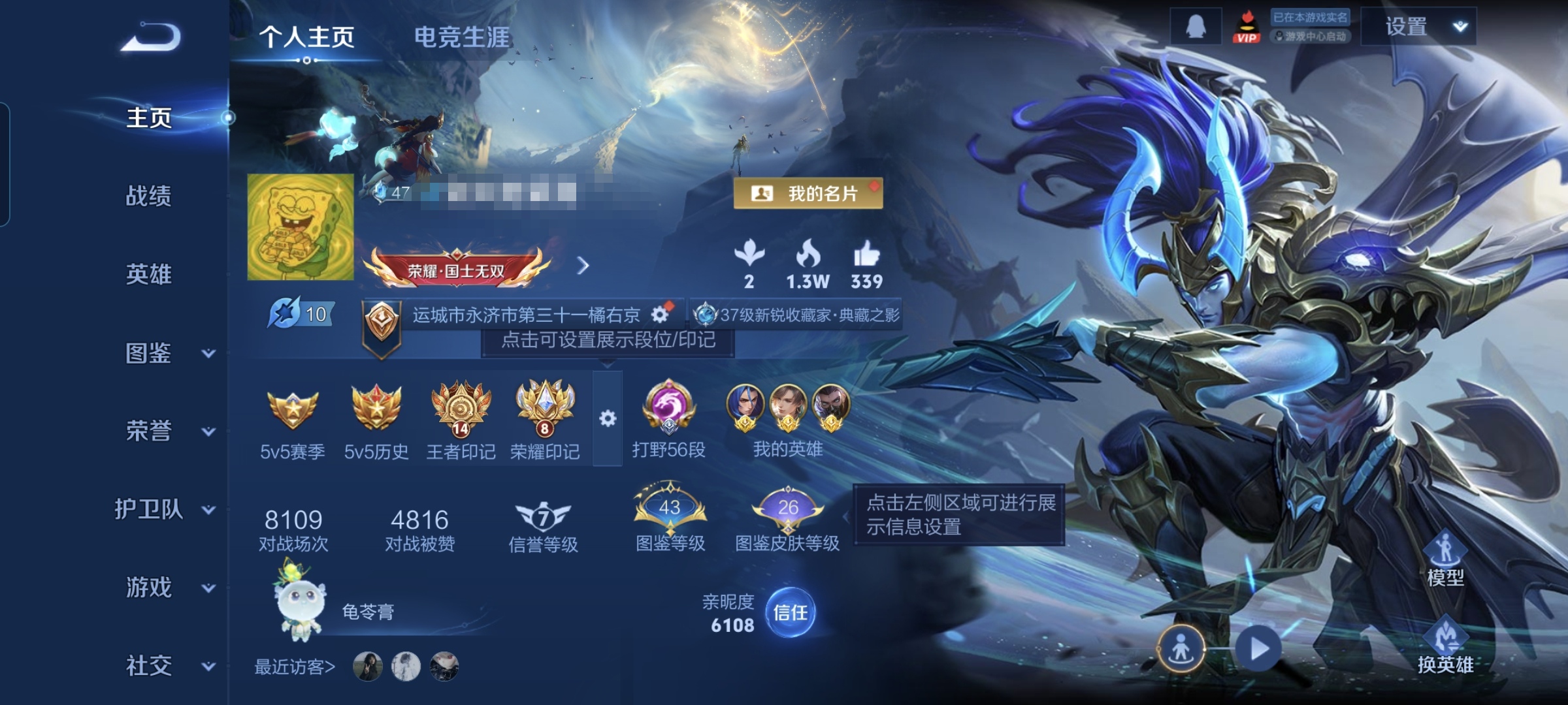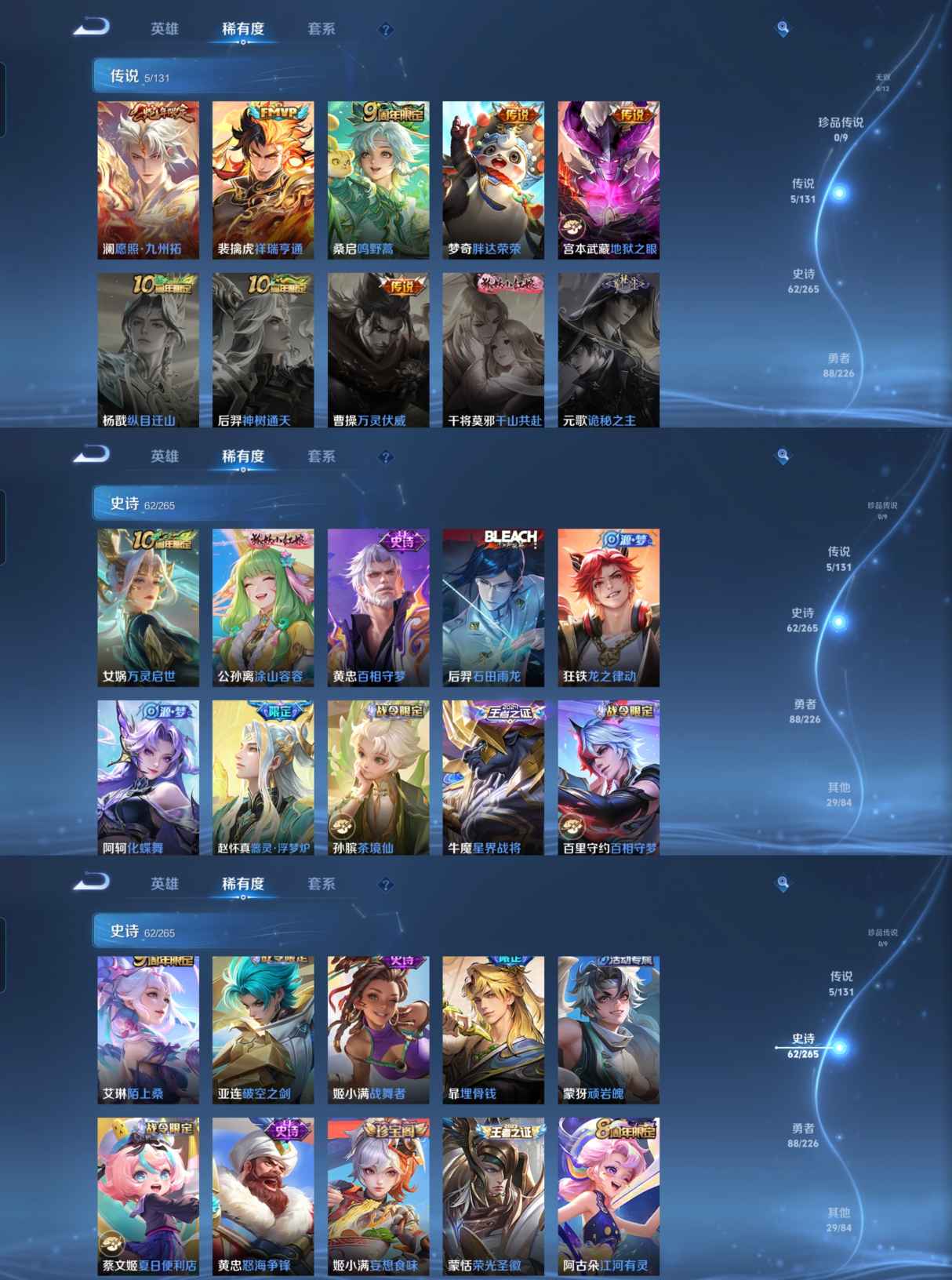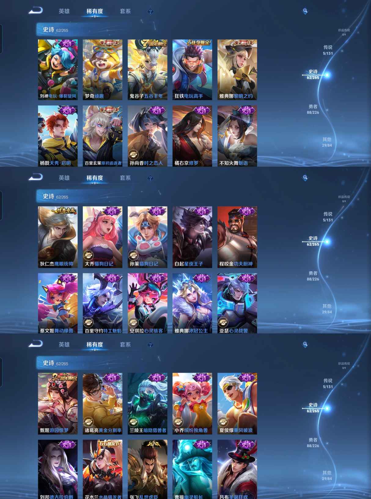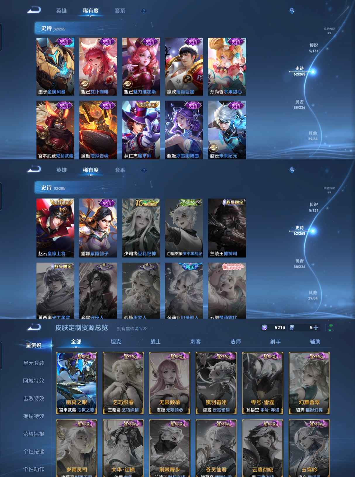 贵族等级:v6皮肤数:185传说品质5 生肖限定1 荣耀典藏1 英雄数:125