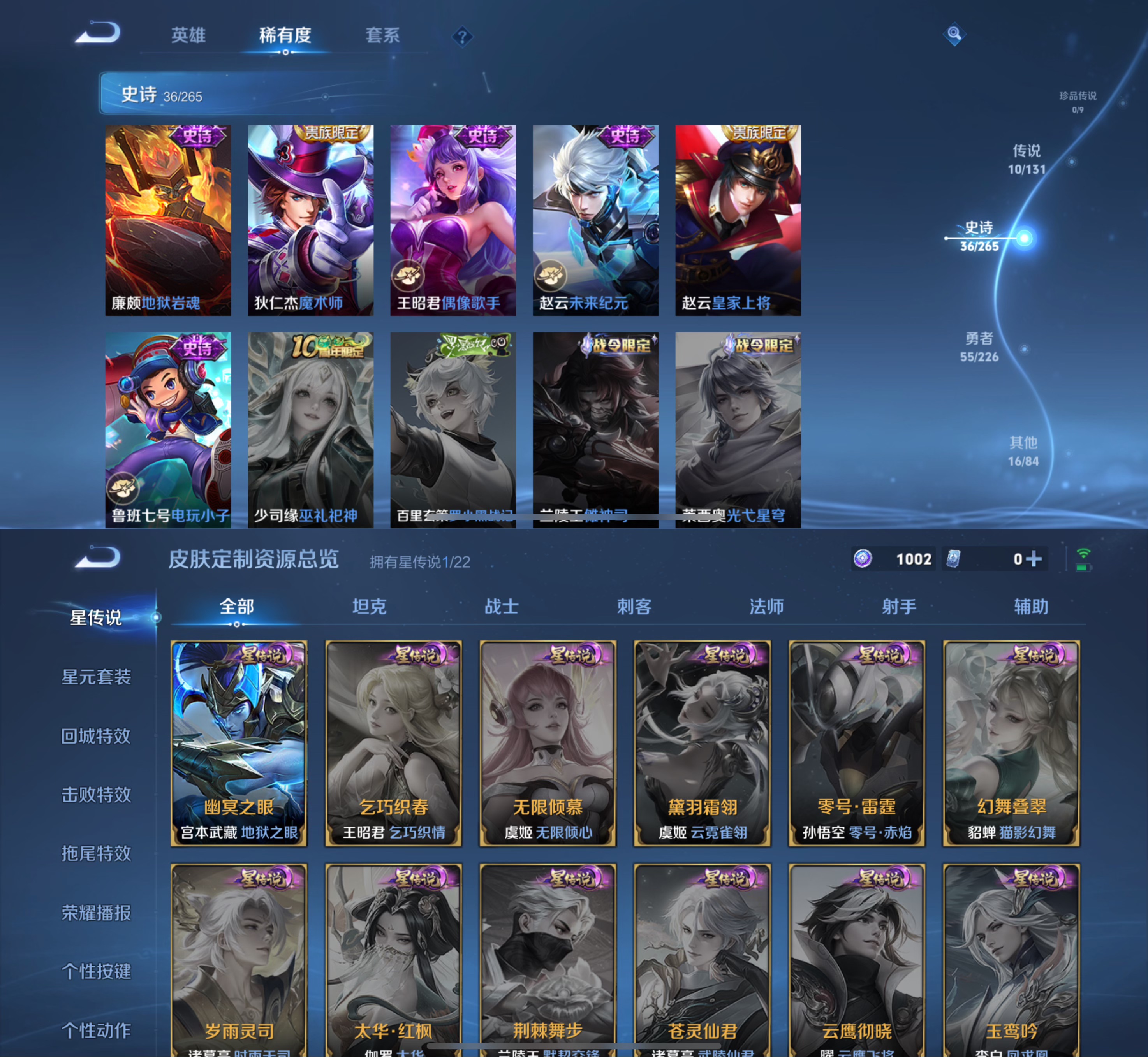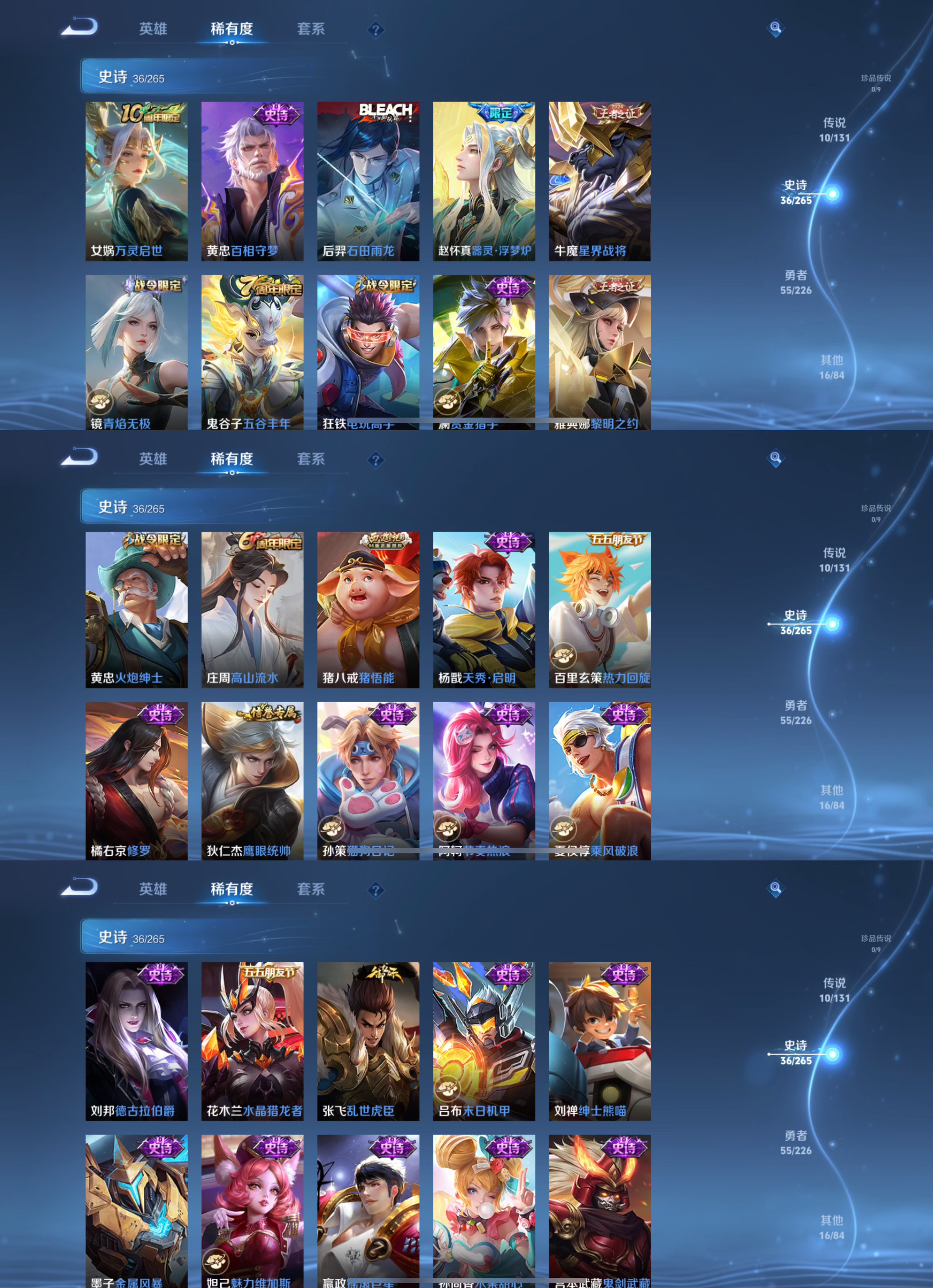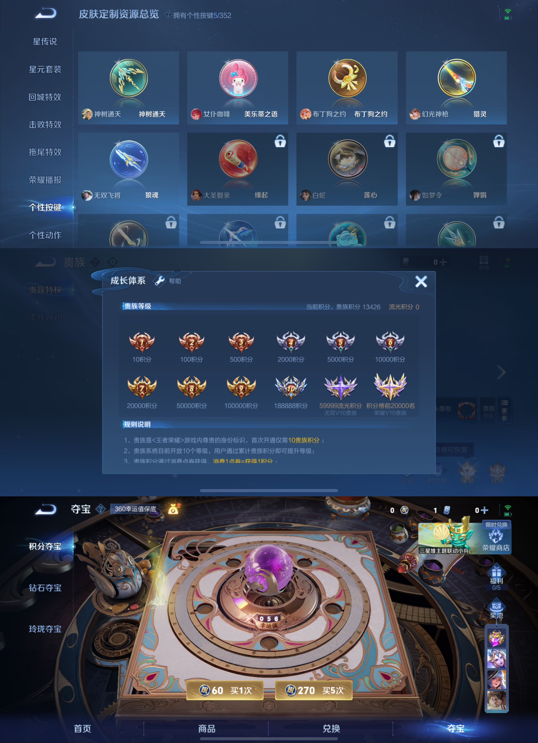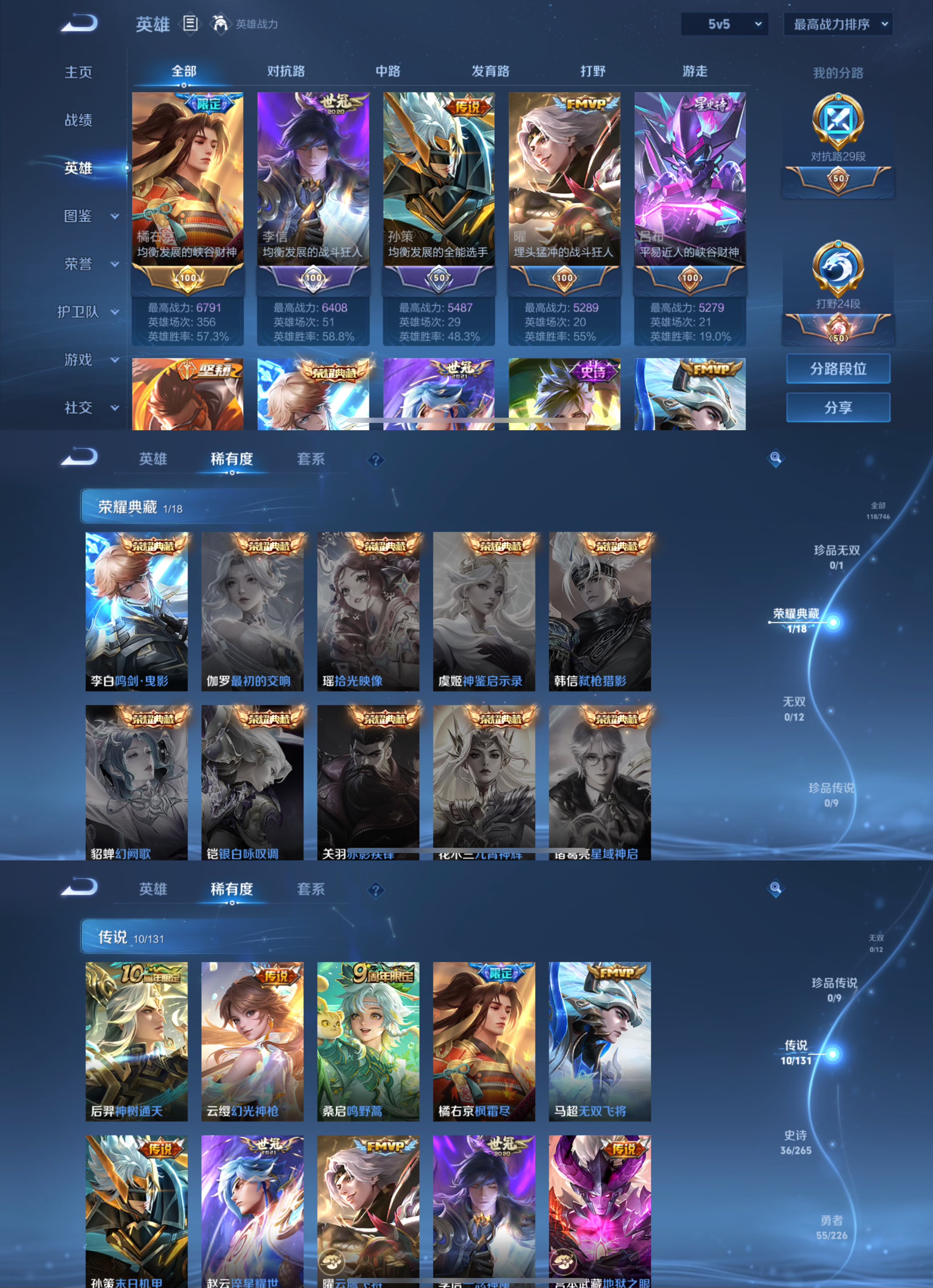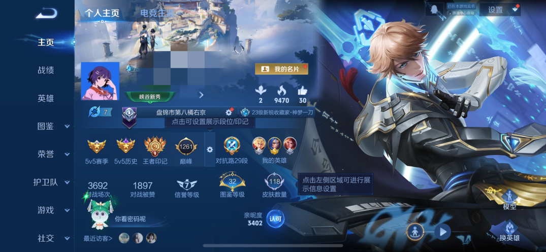 贵族等级:v6皮肤数:118传说品质10 荣耀典藏1 英雄数:120