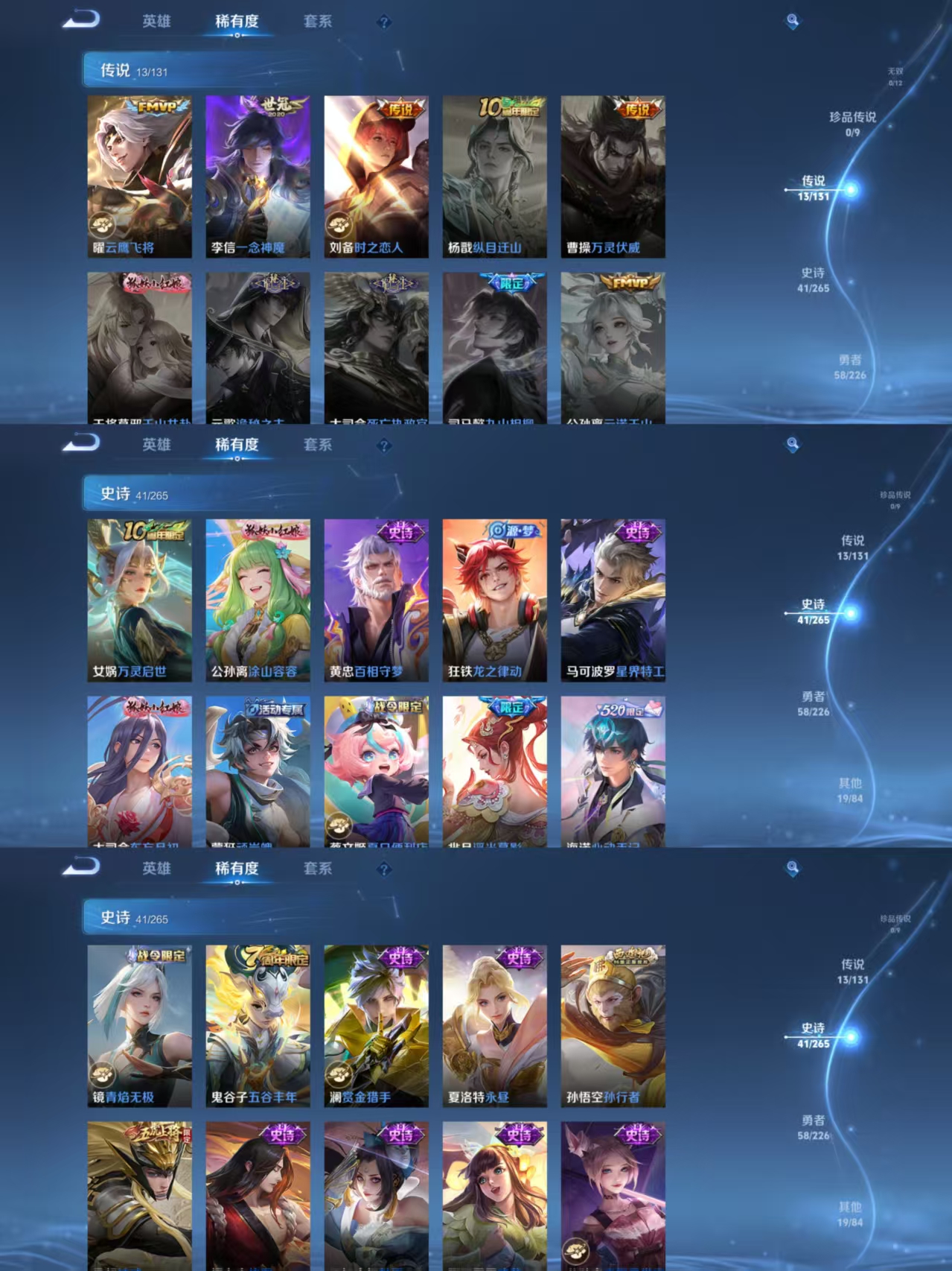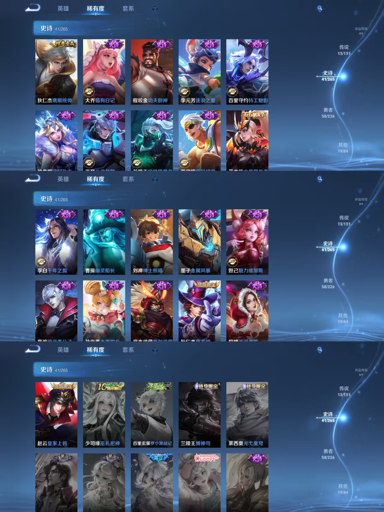贵族等级:v7皮肤数:131传说品质13 生肖限定2 英雄数:119